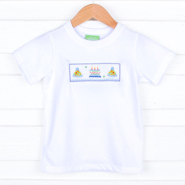 Celebrate your little one’s special day in style with our adorable Birthday Smocked Short Sleeve Shirt! This white knit shirt features smocked cake and party hats, accented with royal trim, making it perfect for marking your little one’s milestone.