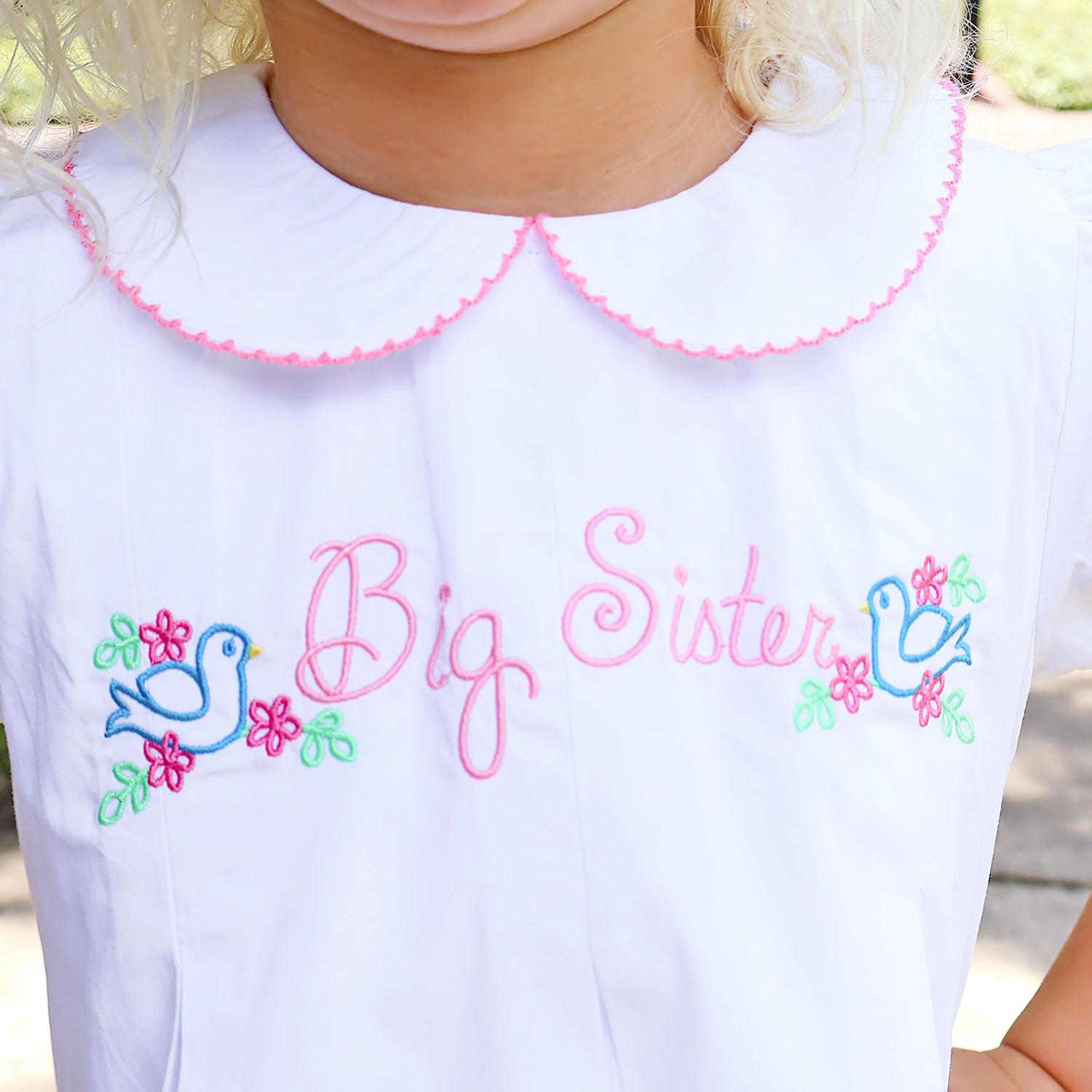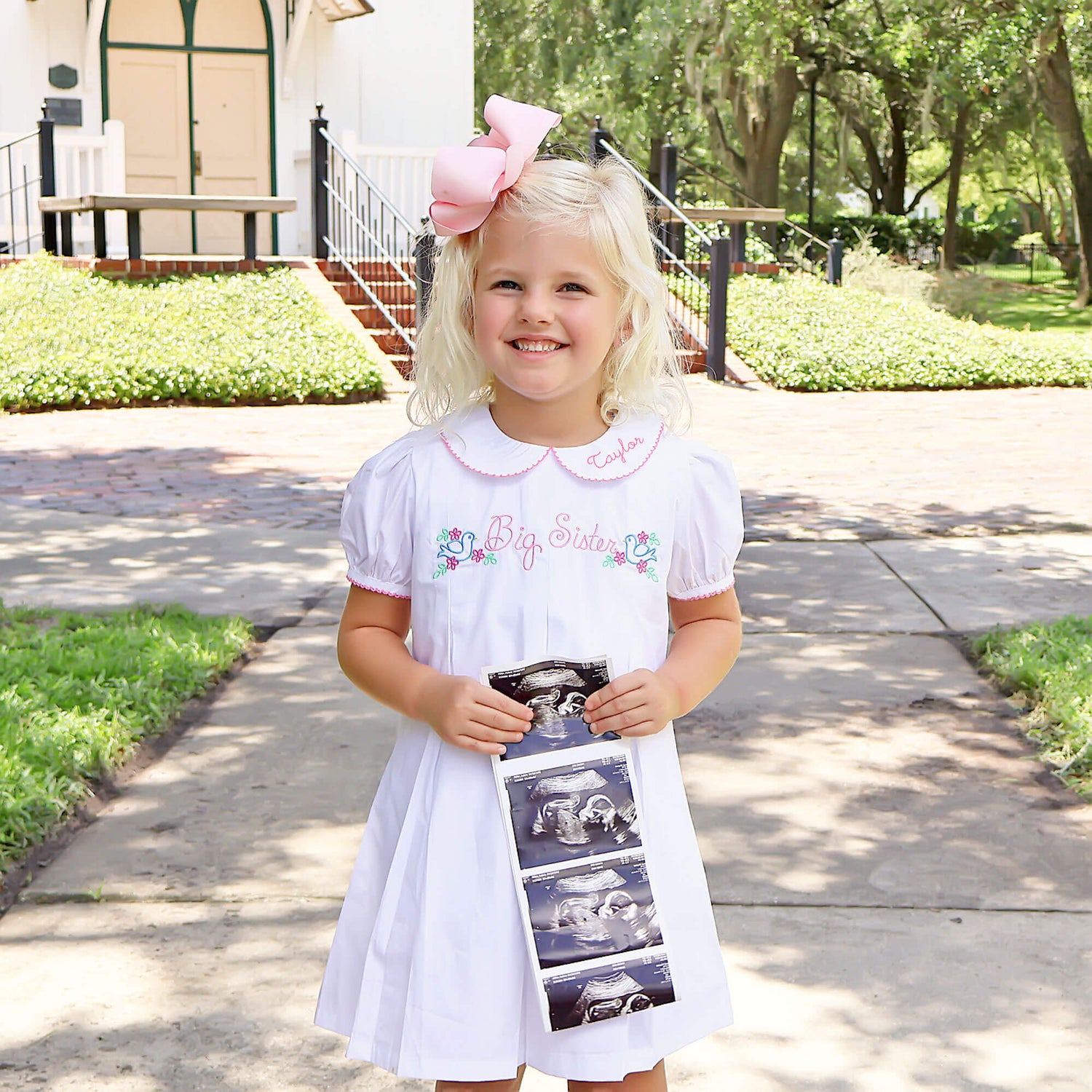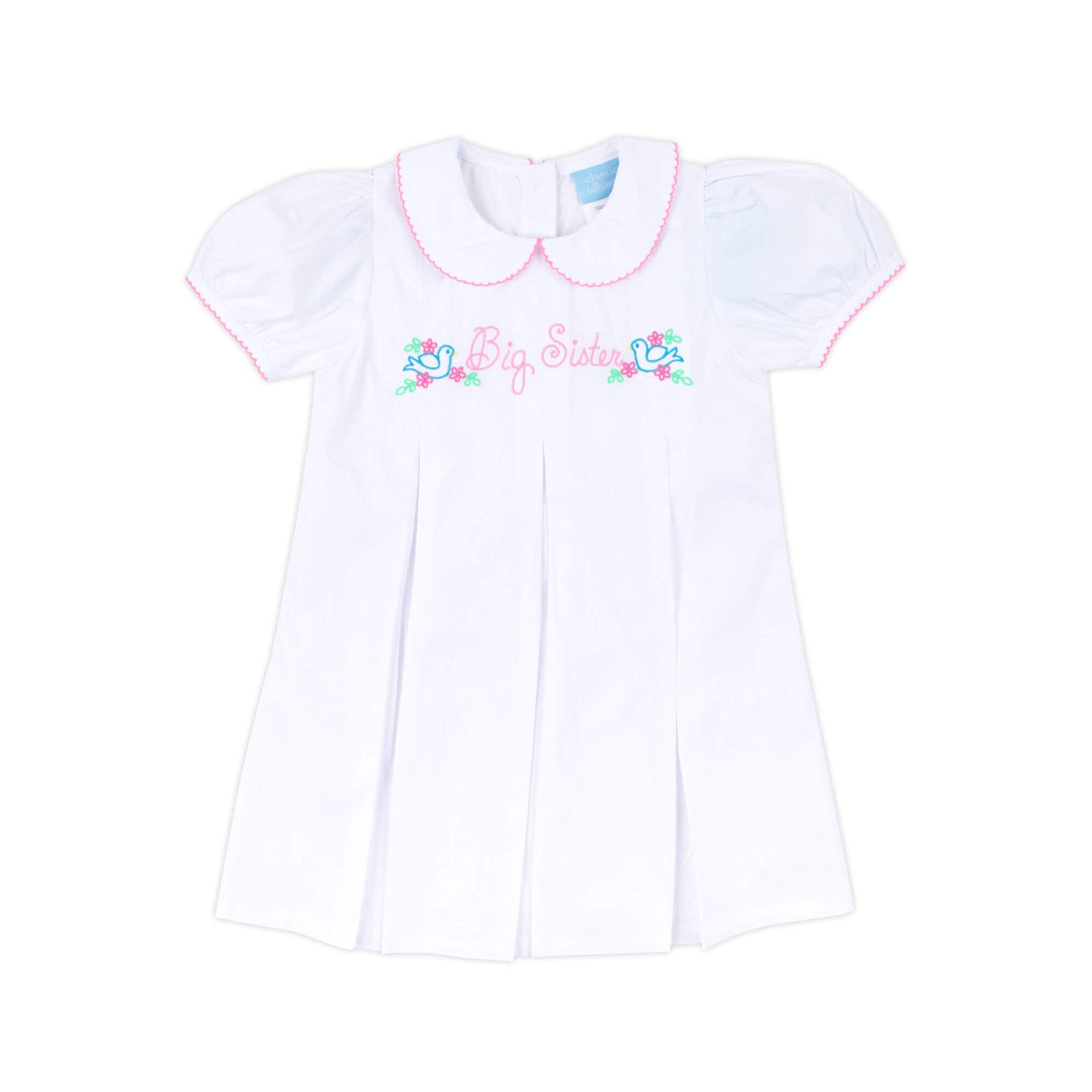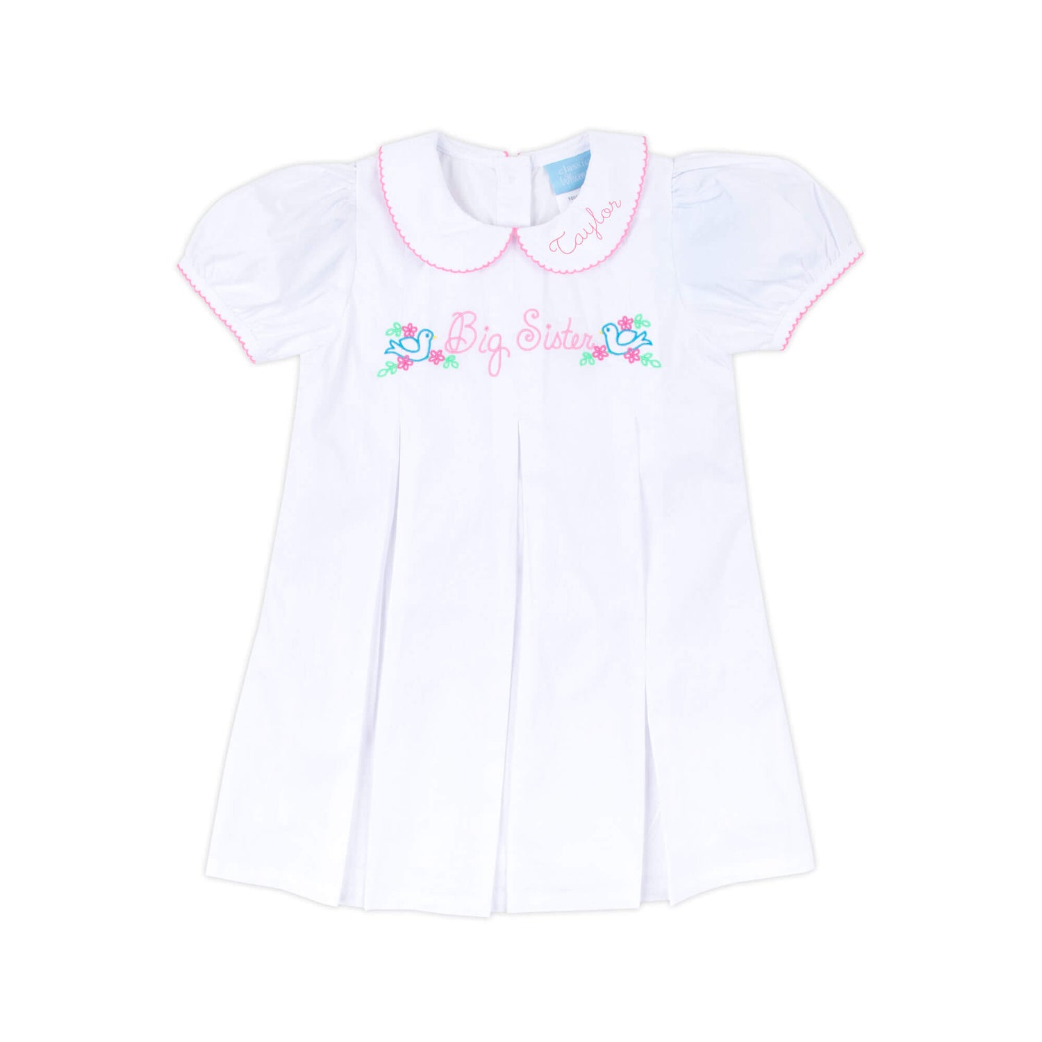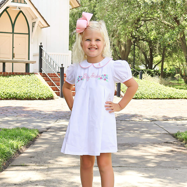 Your big girl will love showing off her new title in this Big Sister Embroidered Molly Dress! This adorable white dress features a delicate embroidered "Big Sister," pleated details, and a cute collar, perfect for celebrating her special role in style. Add a monogram for a personalized touch.