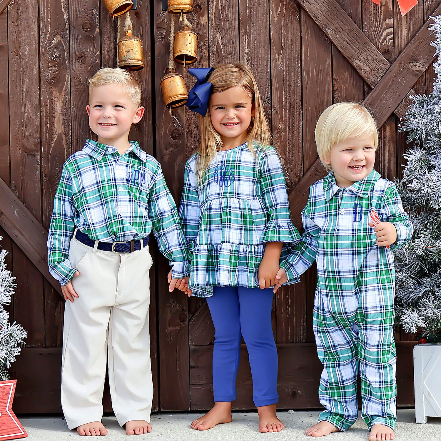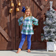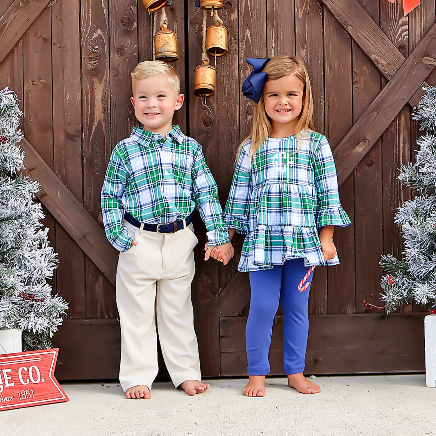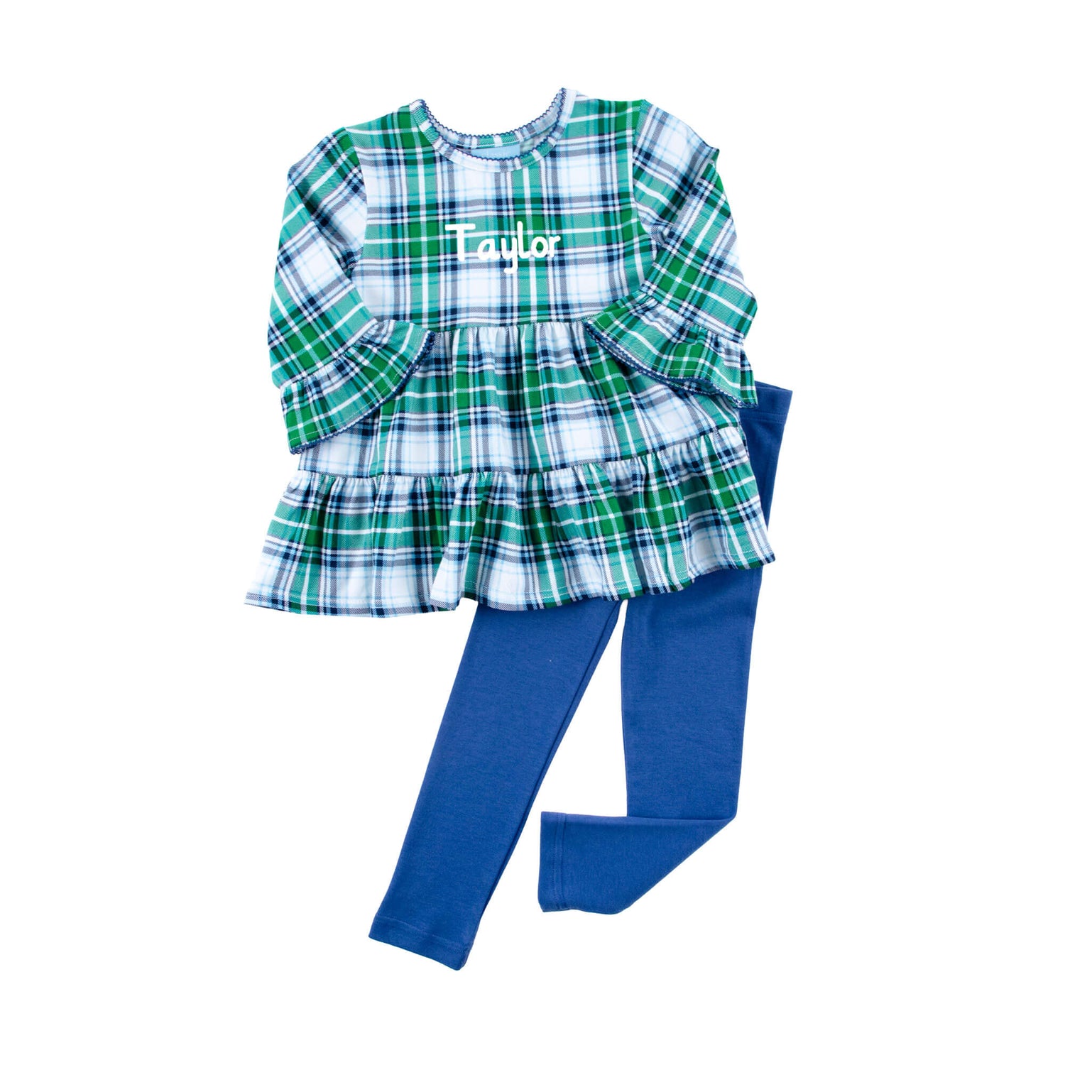 Celebrate the holiday season in our Campbell Plaid Callie Legging Set! The green and blue knit plaid top features 3/4 sleeves with blue picot trim, paired with matching blue leggings. Perfect for the fall and winter season, this set is both sweet and practical. Don’t forget to add a monogram to finish the look!