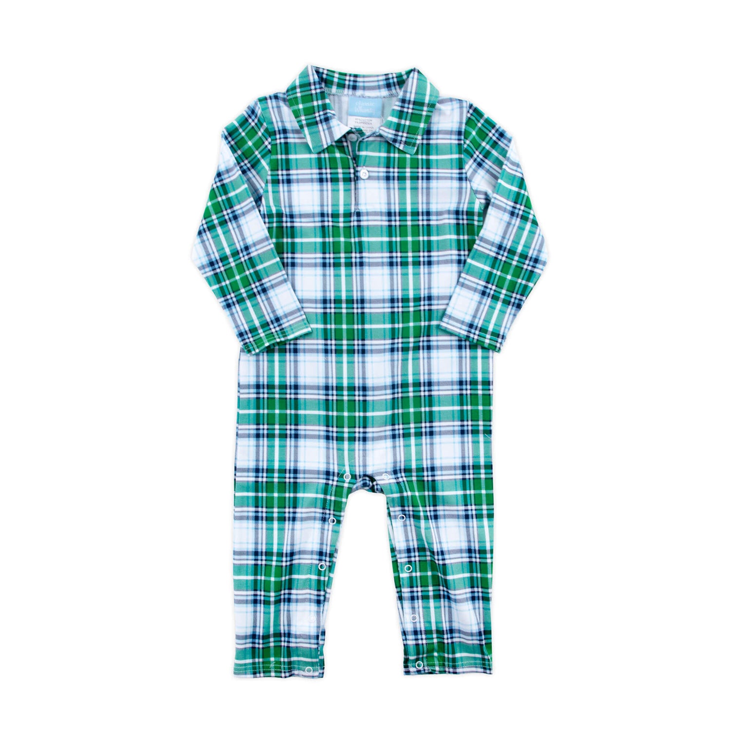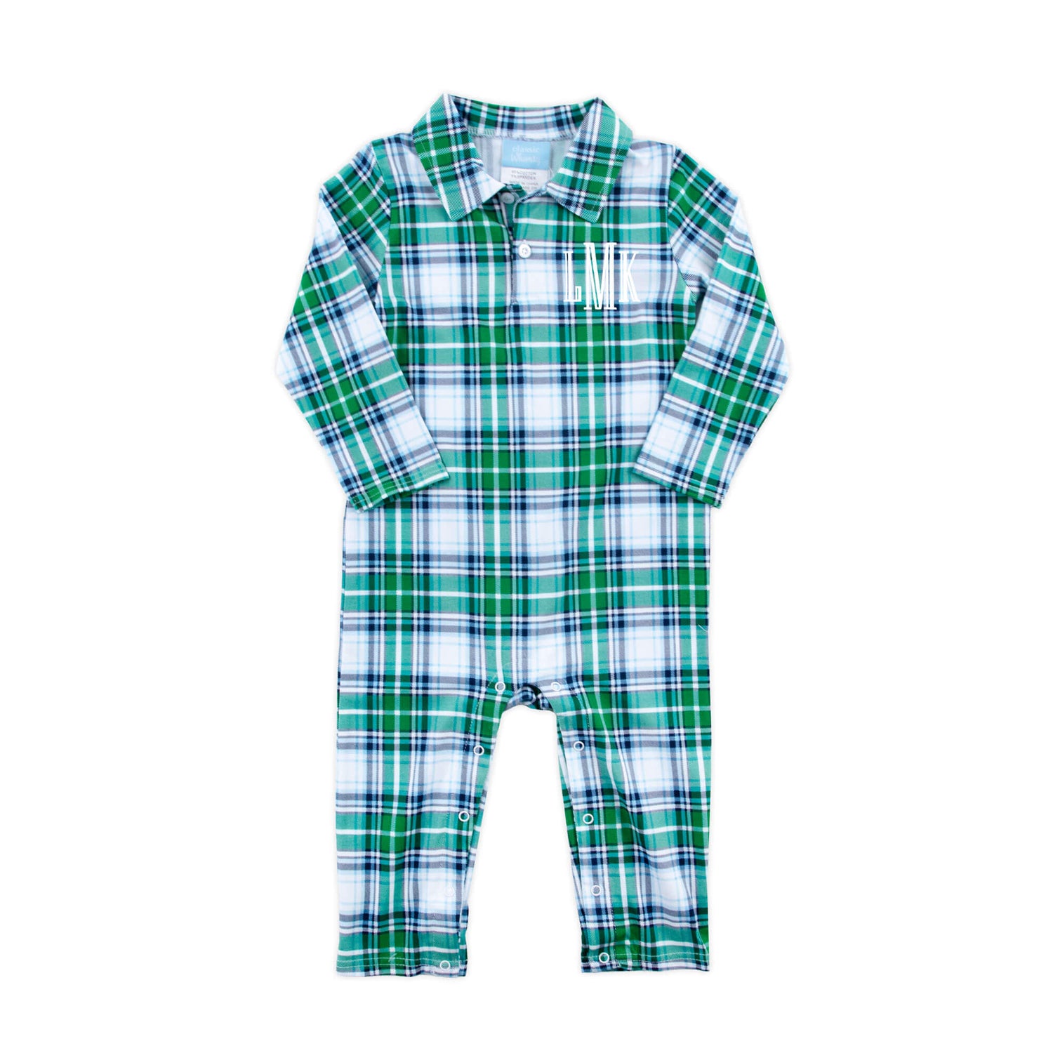 Get ready for the holiday season with our Campbell Plaid Polo Romper! This green and blue knit plaid polo romper features long sleeves and snaps at the stride for easy changing, making it the perfect outfit for holiday parties, playtime fun, comfort, and cuteness. Add a monogram to make this holiday look even more special!