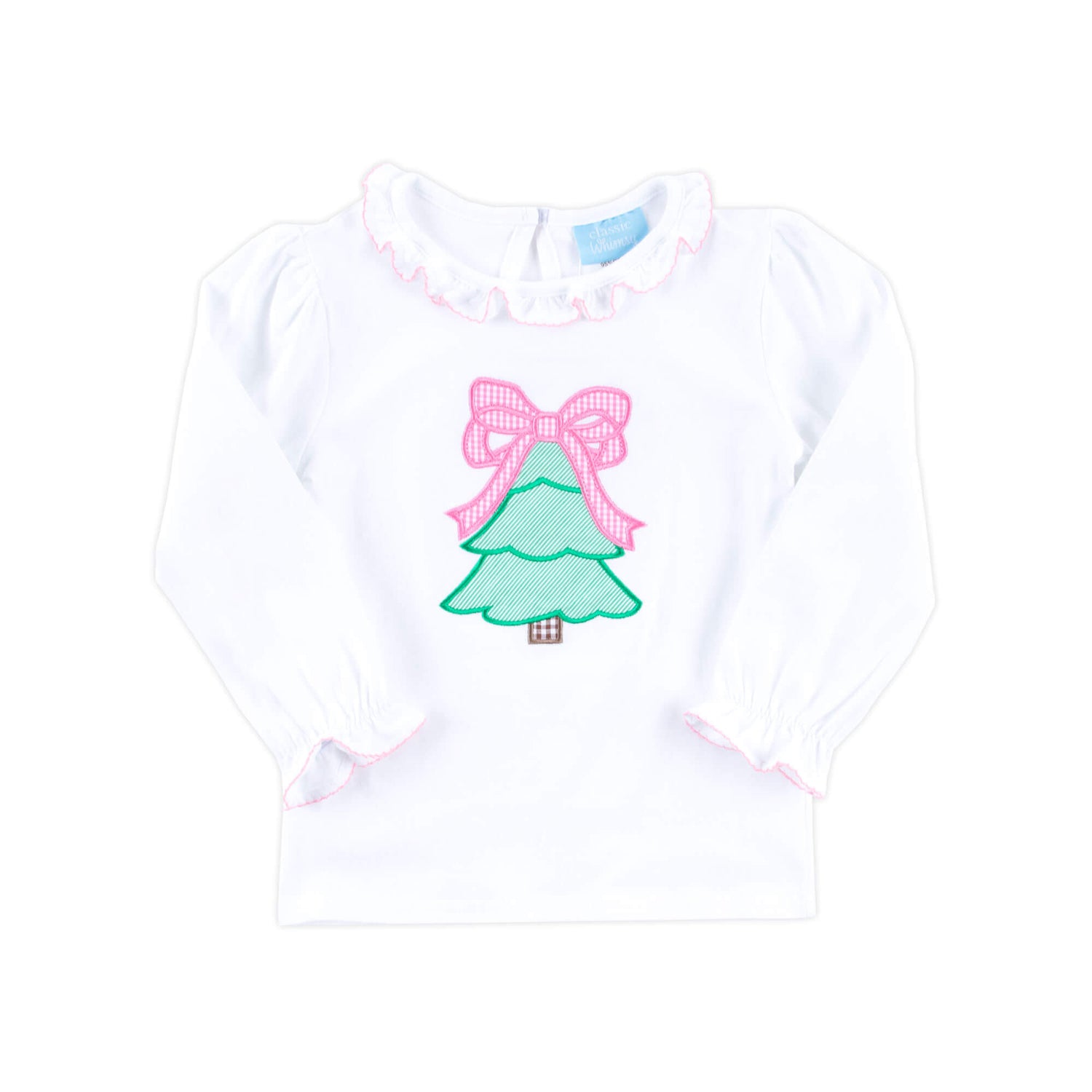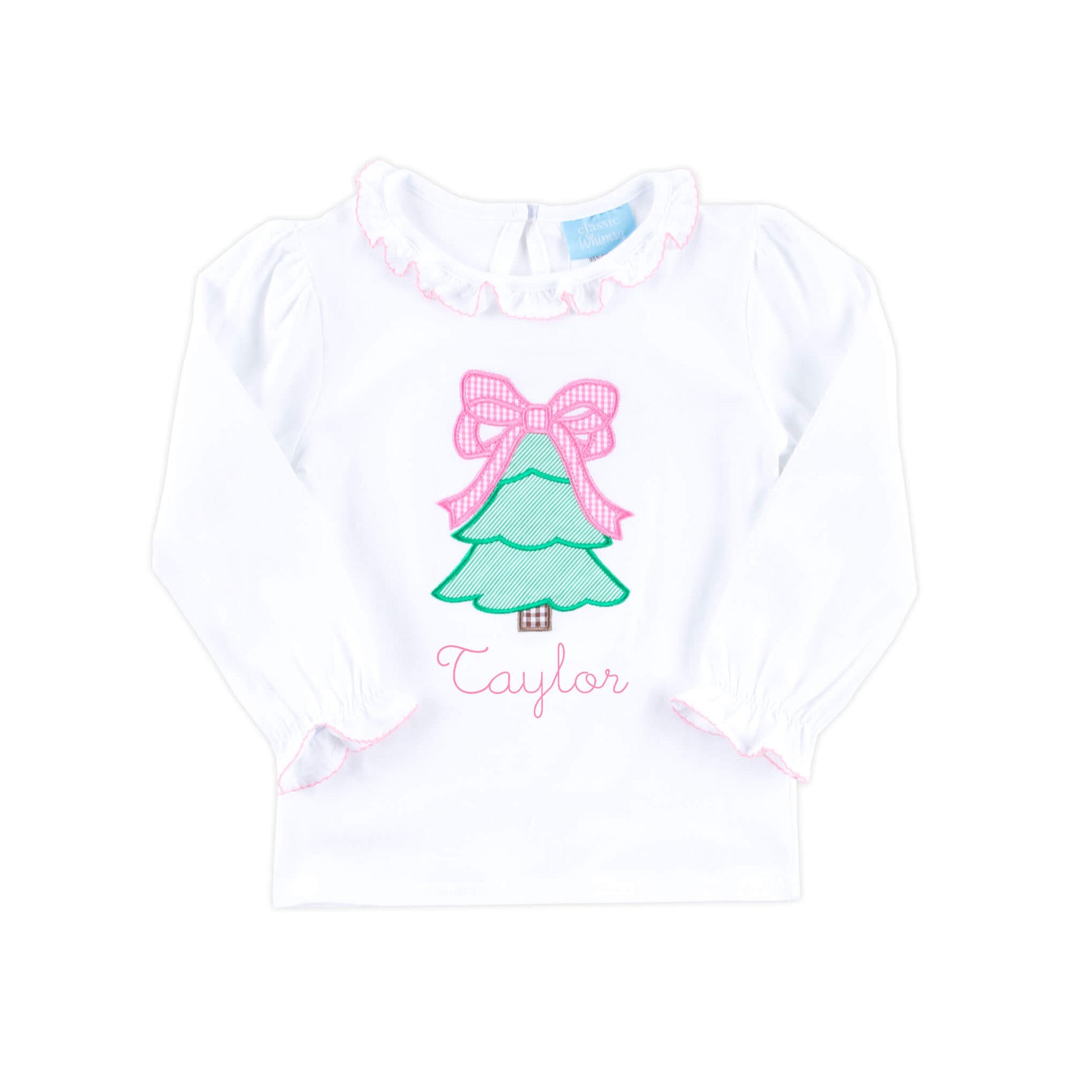 Get ready to spread Christmas cheer with our Christmas Tree & Bow White Long Sleeve Top! This white knit top features the sweetest applique of a Christmas tree, long sleeves, and ruffle collar with picot trim. Making it the perfect outfit for holiday parties, playtime fun, comfort, and cuteness! Don't forget to add a monogram for a personalized touch!