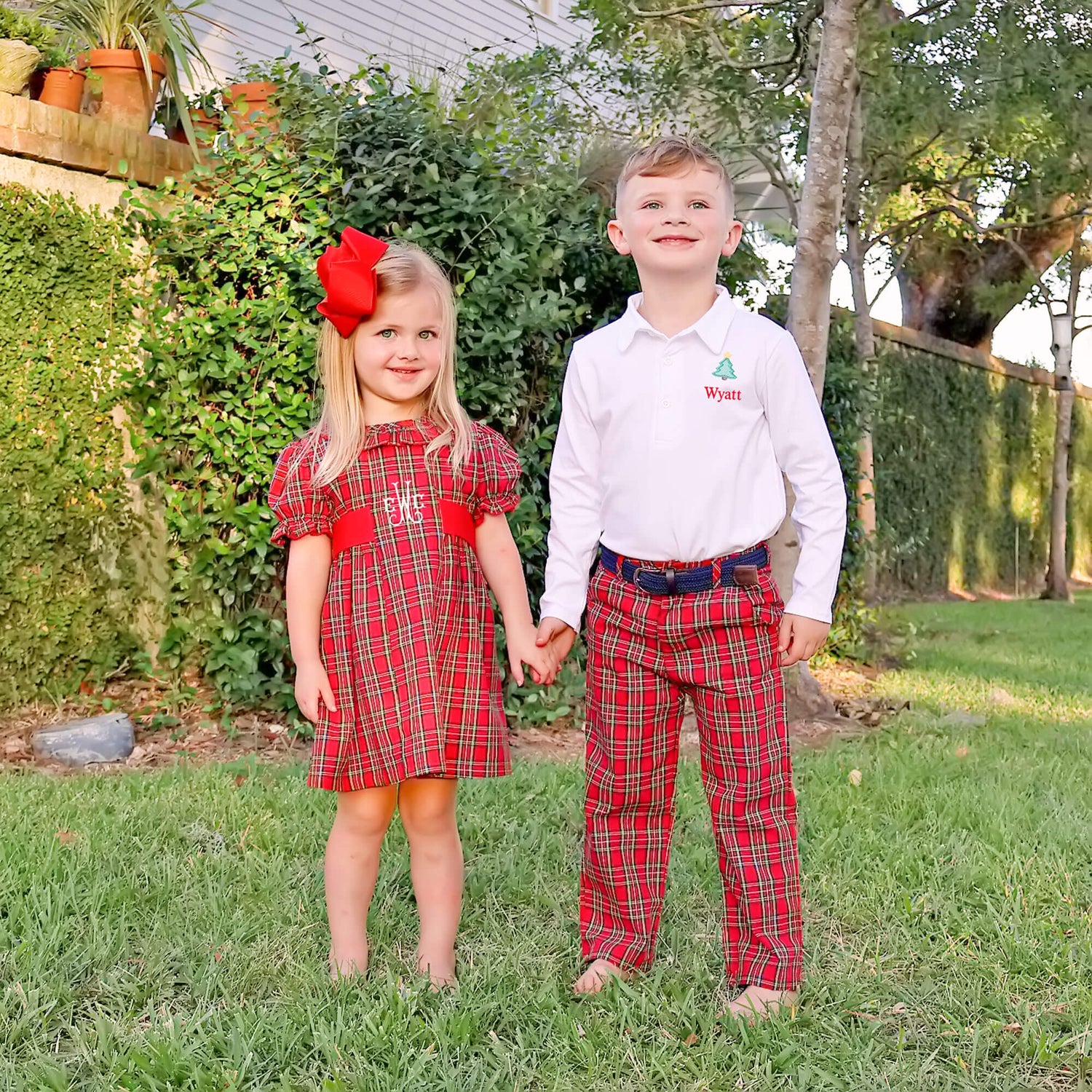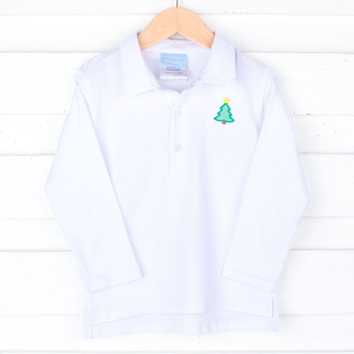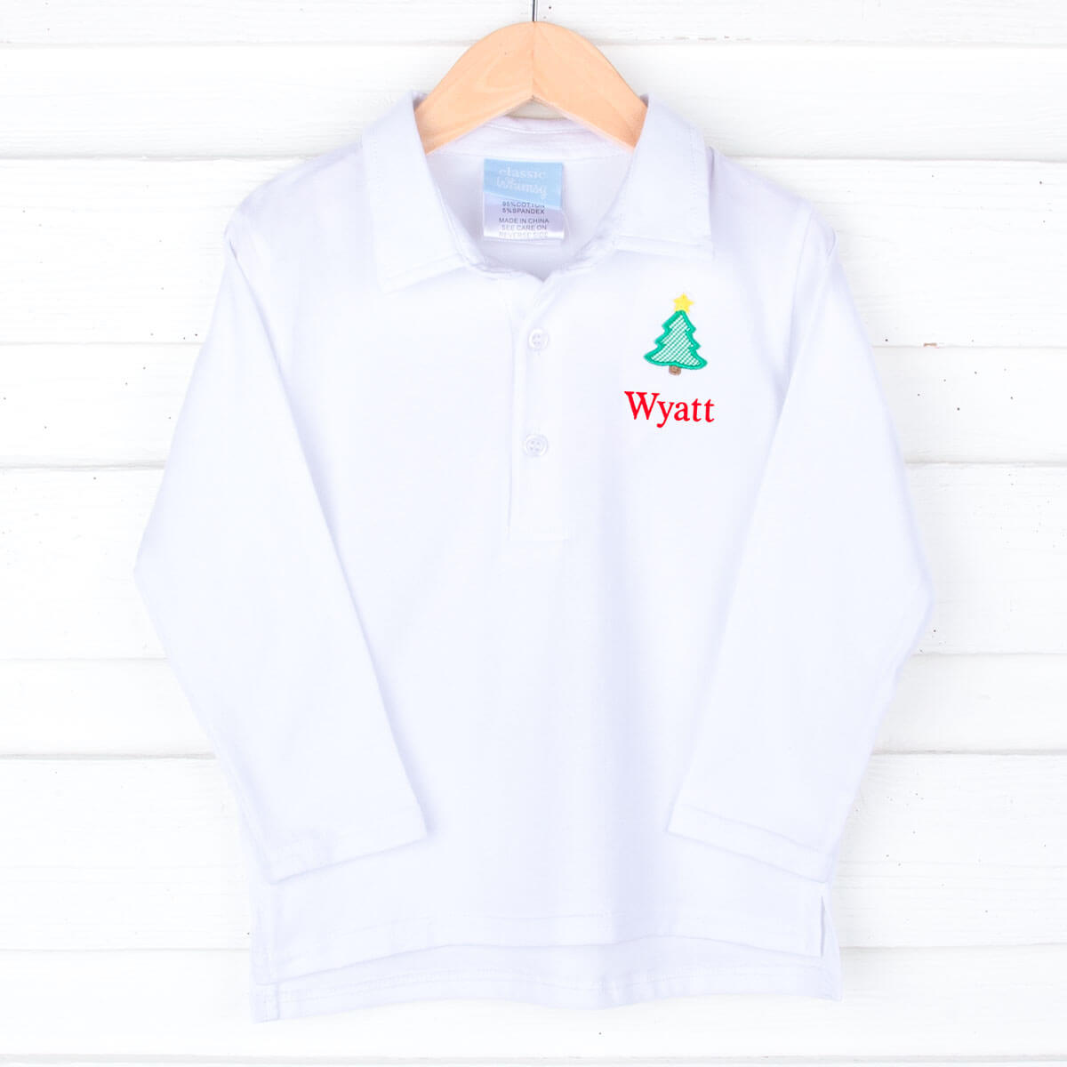 This Christmas Tree White Long Sleeve Polo is perfect for pictures with Santa or unwrapping Christmas presents! The white polo features a Christmas tree applique on the side. It's ideal for school days, holiday parties, playtime fun, comfort, and cuteness! Don’t forget to add a monogram for a personalized touch!
