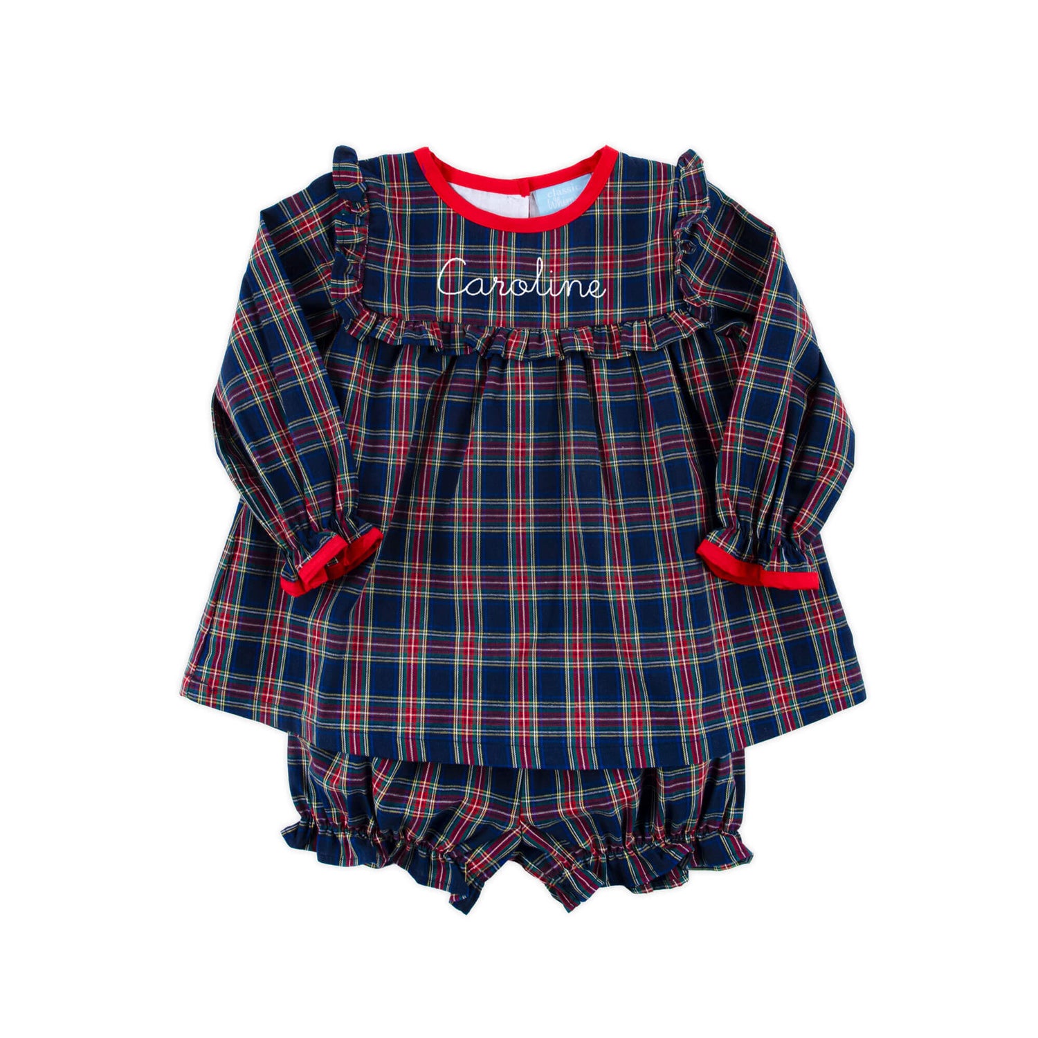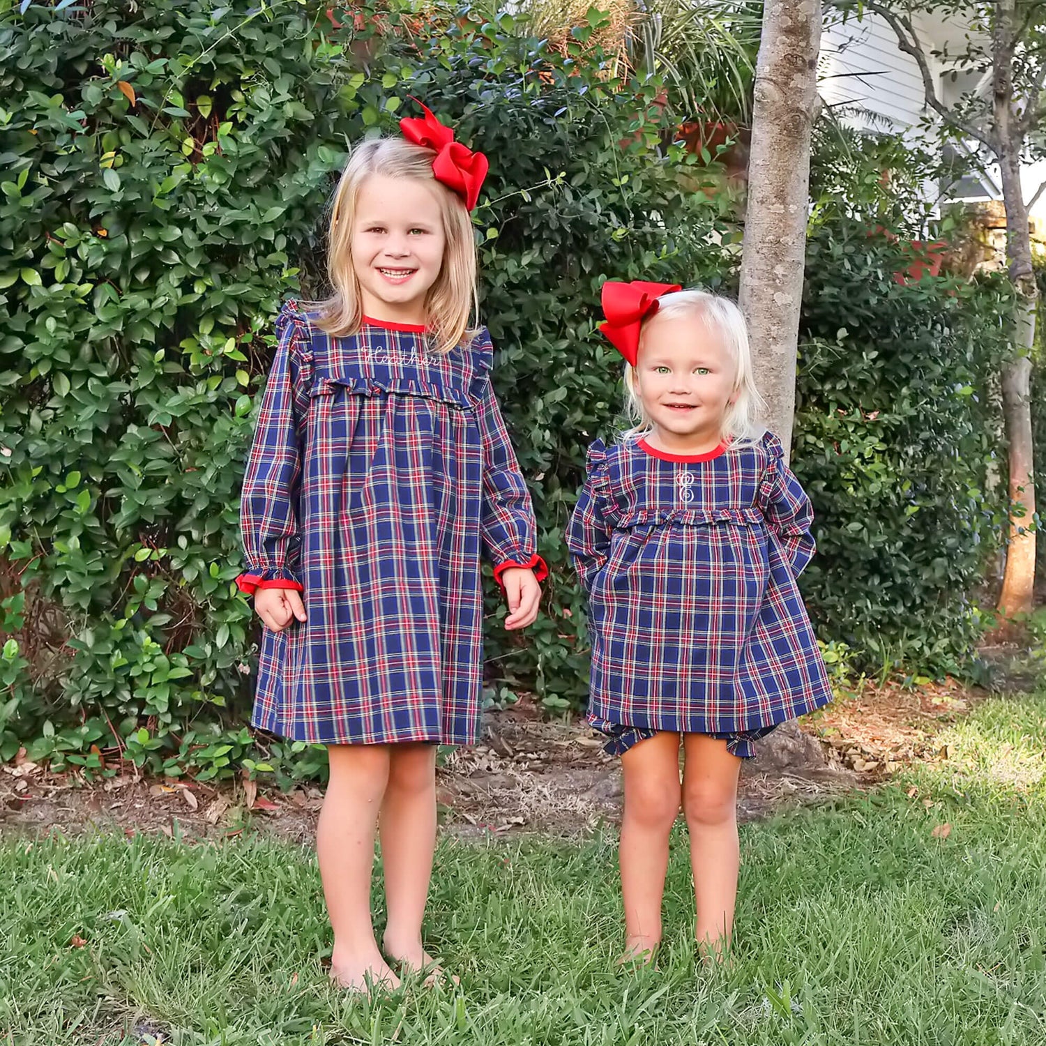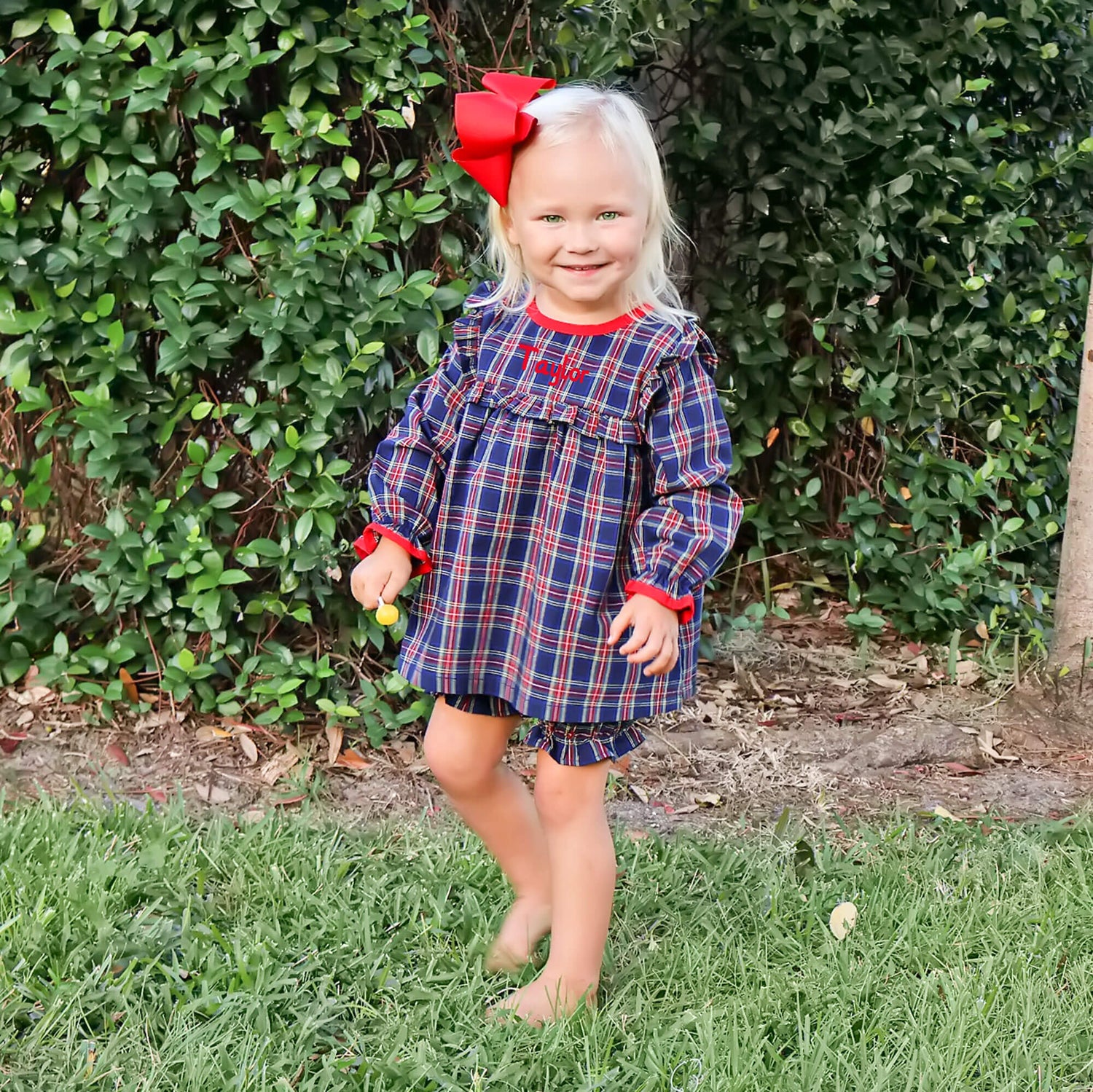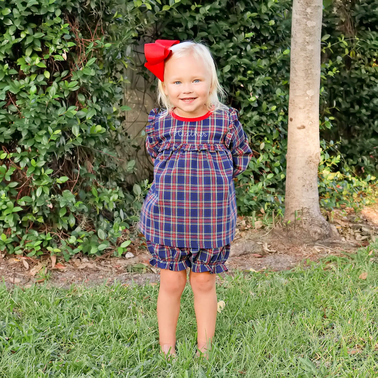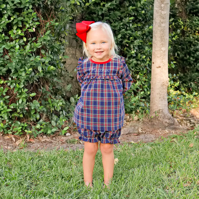This Dunbar Plaid Royal Hattie Bloomer Set is perfect for holiday pictures with the family. The Hattie-style top is designed in a classic plaid fabric, features beautiful long bishop sleeves and flutter detail. The set is coordinated with matching bloomers. Add a monogram to make the outfit stand out!