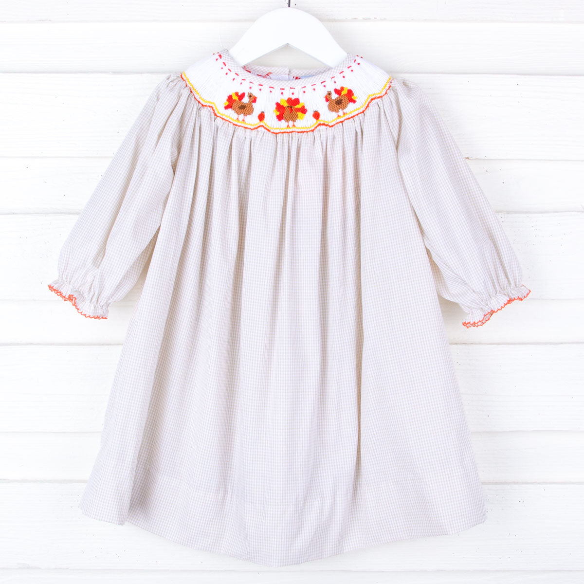 Celebrate Thanksgiving in style with our Smocked Turkey Khaki Gingham Long Sleeve Bishop Dress, perfect for festive family gatherings. This charming khaki gingham dress features delicate bishop long sleeves trimmed with orange picot, while the adorable smocked turkey adds the perfect holiday touch.