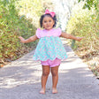 Celebrate the beauty of spring in our Floral Wonderland Turquoise Amelia Bloomer Set. This Amelia style top features a lovely turquoise and pink floral print, soft flutter sleeves, and a scalloped hem for an extra charming touch. It is coordinated with pink gingham bloomers for a perfectly paired look. Ideal for spring outings, family gatherings, and special moments. Add a monogram to make this outfit even more special.