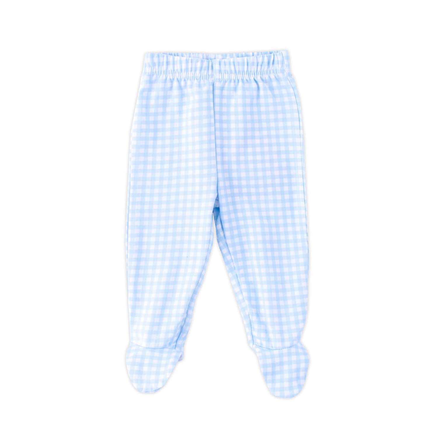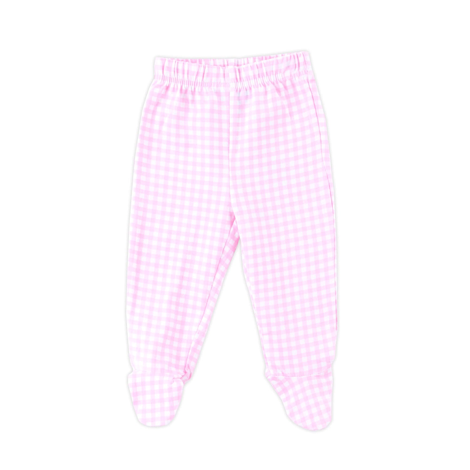 Our Gingham Footed Pants are perfect for any outfit this fall. The footed pants features pink or blue gingham, with an elastic waistband.