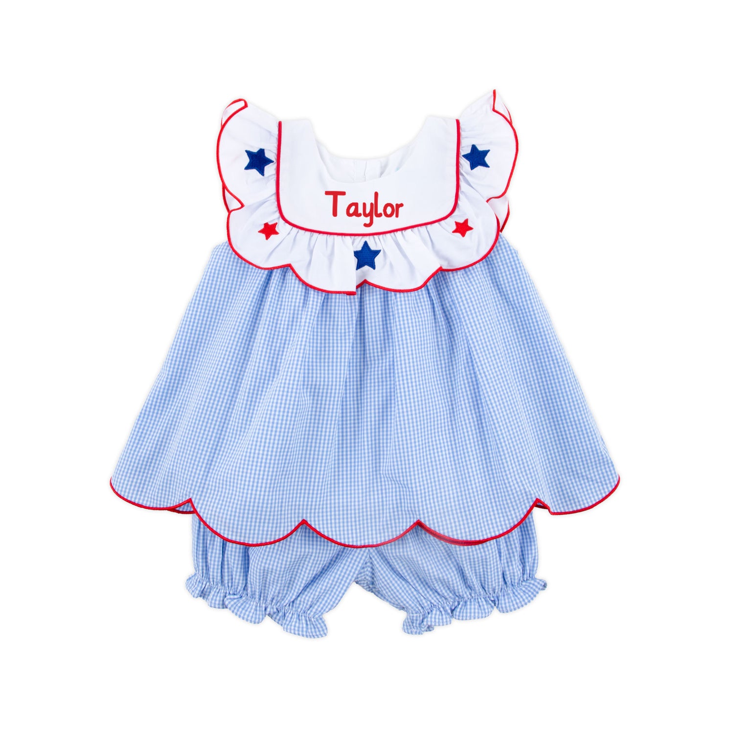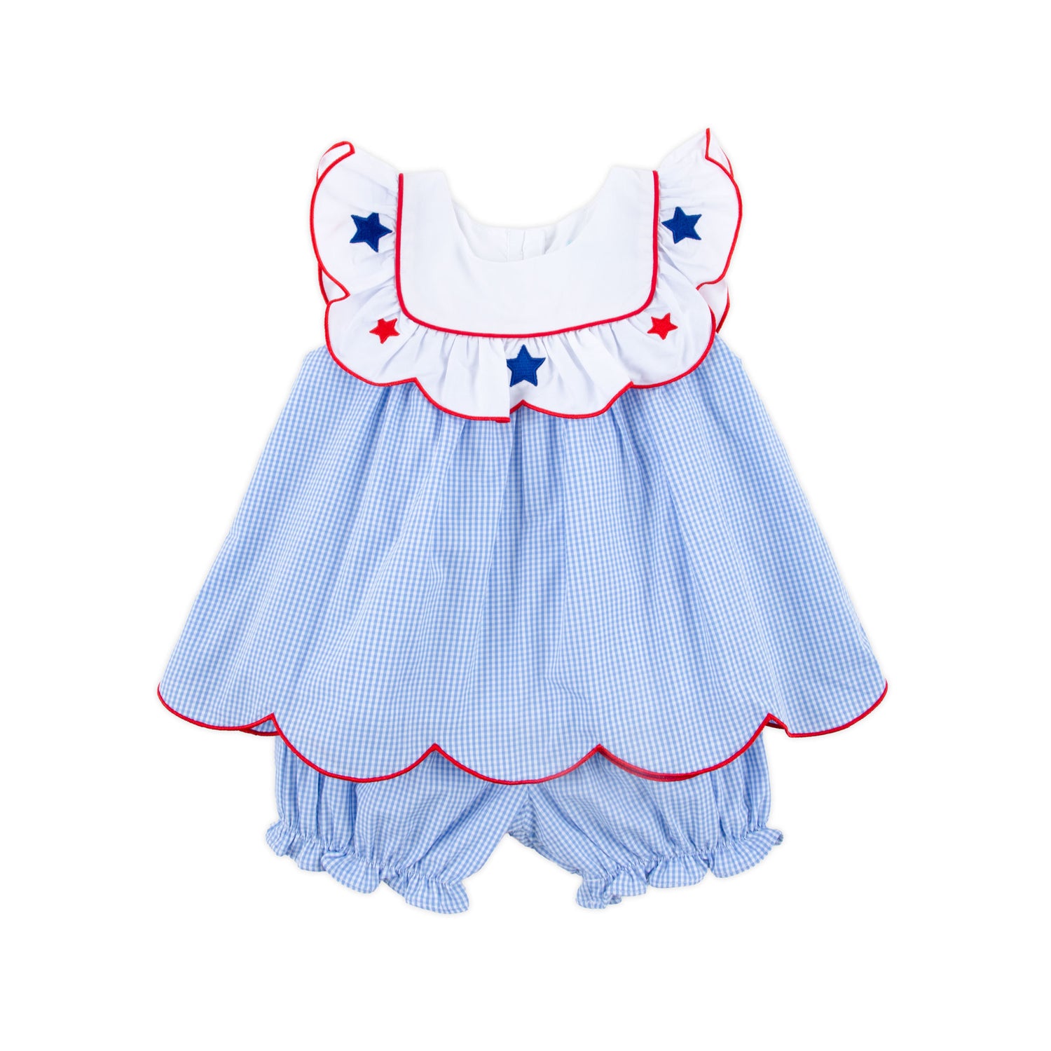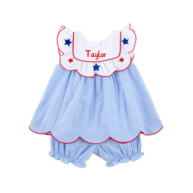 This Gleaming Stars Blue Gingham Lacey Bloomer Set is the perfect outfit for a fireworks night this Fourth of July. The blue gingham top features a sweet attached white scalloped bib with embroidered stars and is paired with matching blue gingham bloomers for a charming patriotic look. Add a monogram to make it extra special.