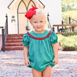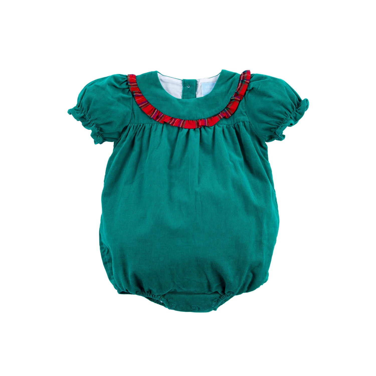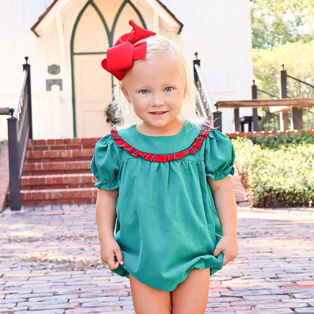 This Green Cord Middleton Plaid Red Yoke Bubble is the perfect holiday outfit for any little girl. This corduroy bubble features a yoke neck with plaid ruffle, cute bishop sleeves, and convenient snaps in stride. A charming choice for festive celebrations.