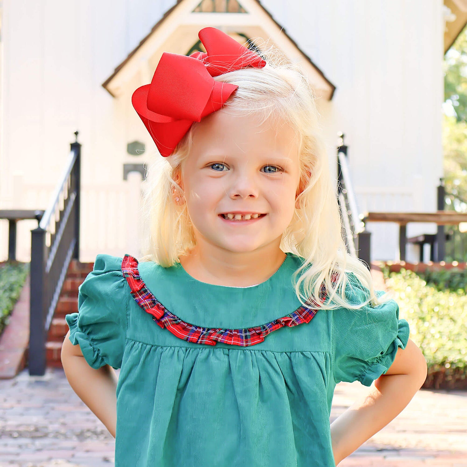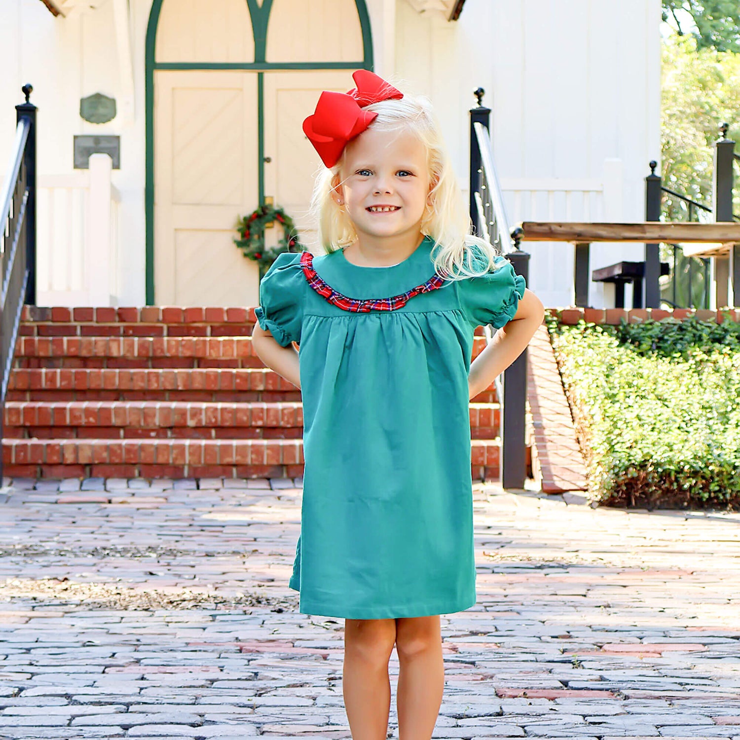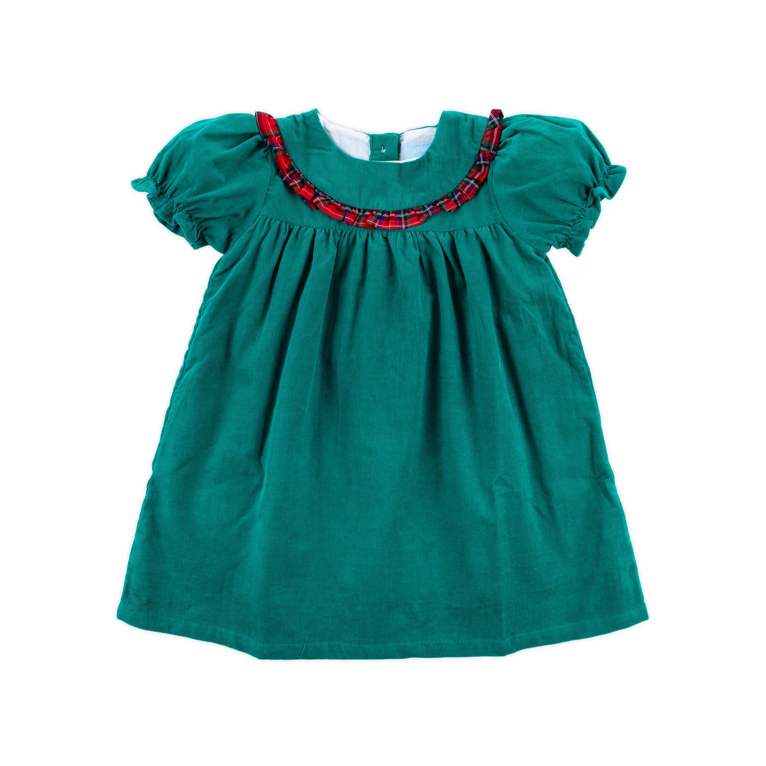 This Green Cord Middleton Plaid Red Yoke Dress is the perfect holiday outfit for any little girl. This corduroy dress features a yoke neck with plaid ruffle, and cute bishop sleeves. A charming choice for festive celebrations.