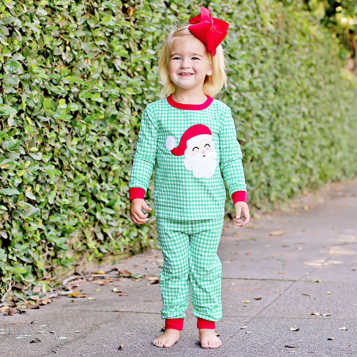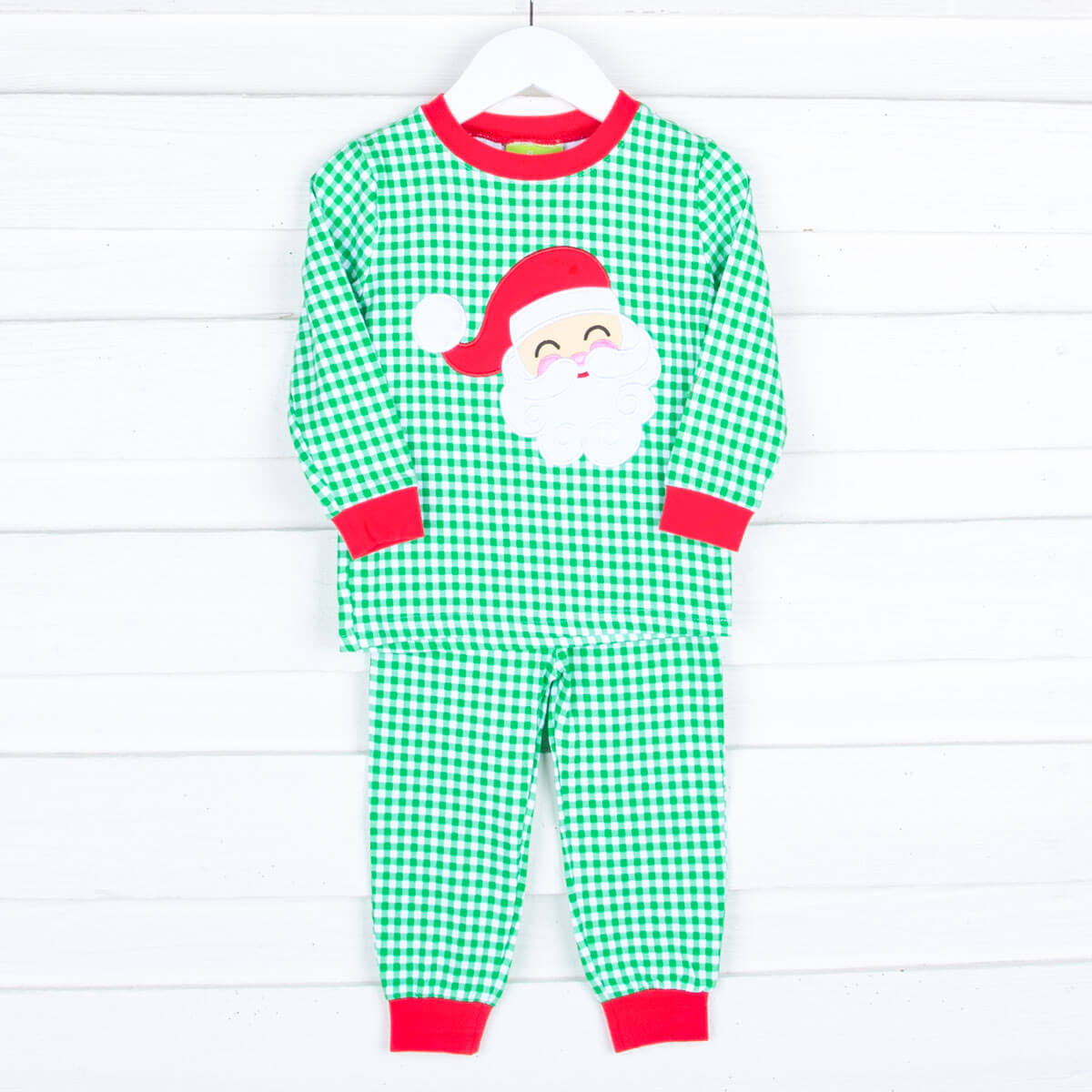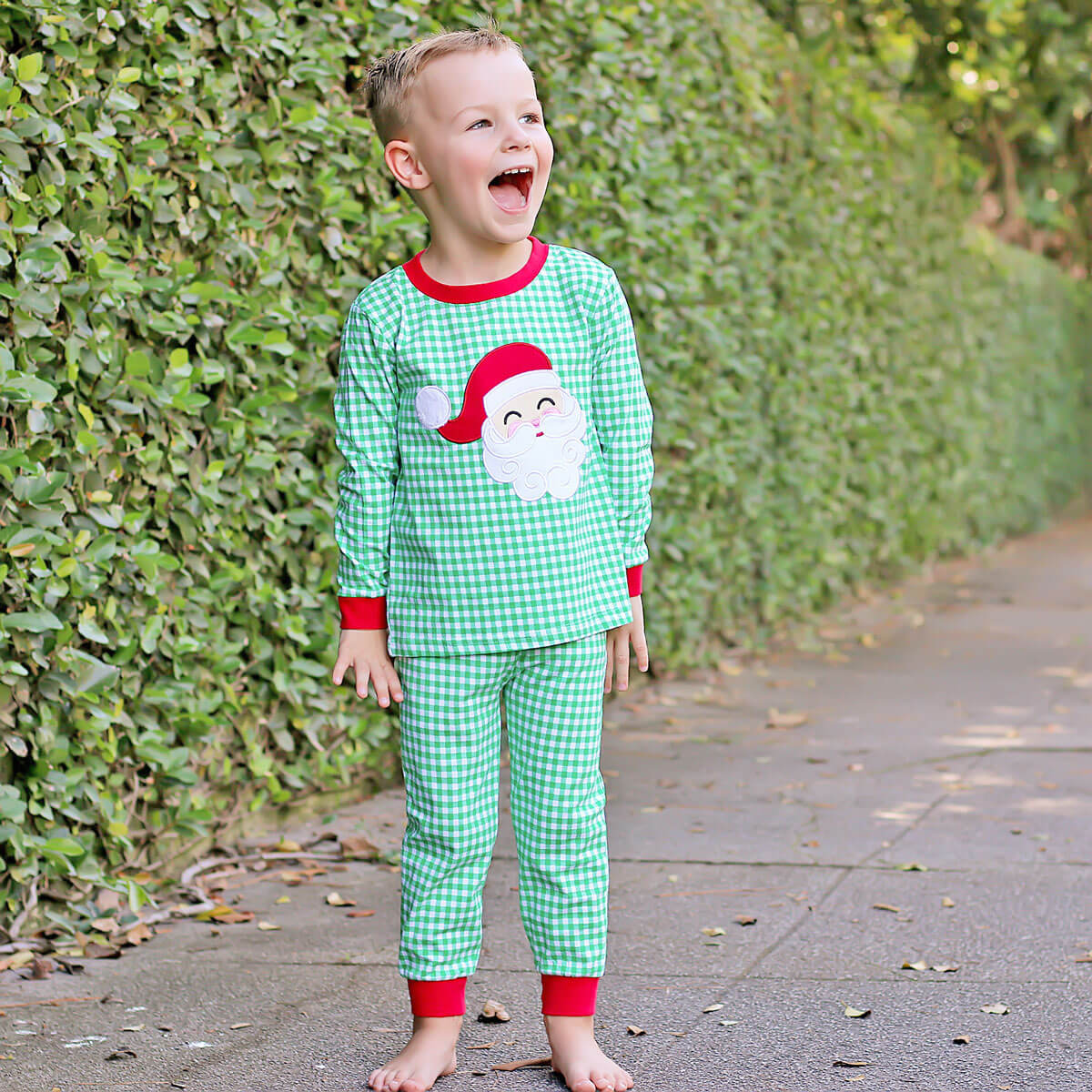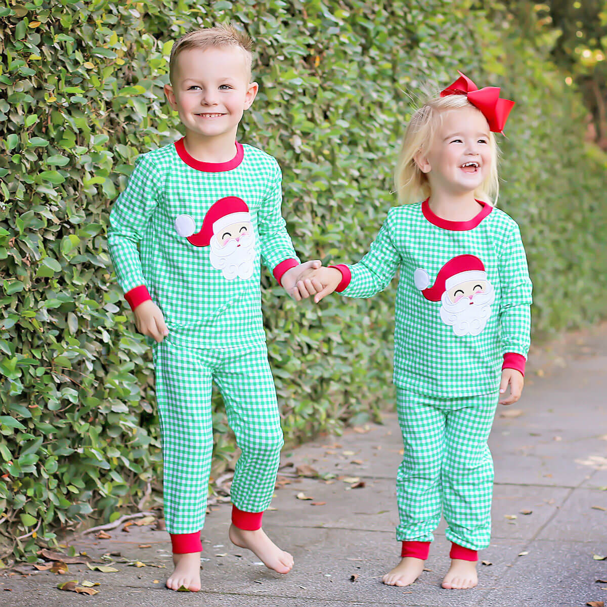 Get your little ones ready for Christmas morning with our Happy Santa Green Gingham Pajamas! These unisex Christmas PJs make it easy to match brothers and sisters, cousins, and friends for the coziest holiday of the year. Featuring a Santa appliqué on a soft green gingham print with festive red trim, these pajamas are perfect for capturing holiday memories. Add a monogram to personalize your Christmas look and make the season extra special!