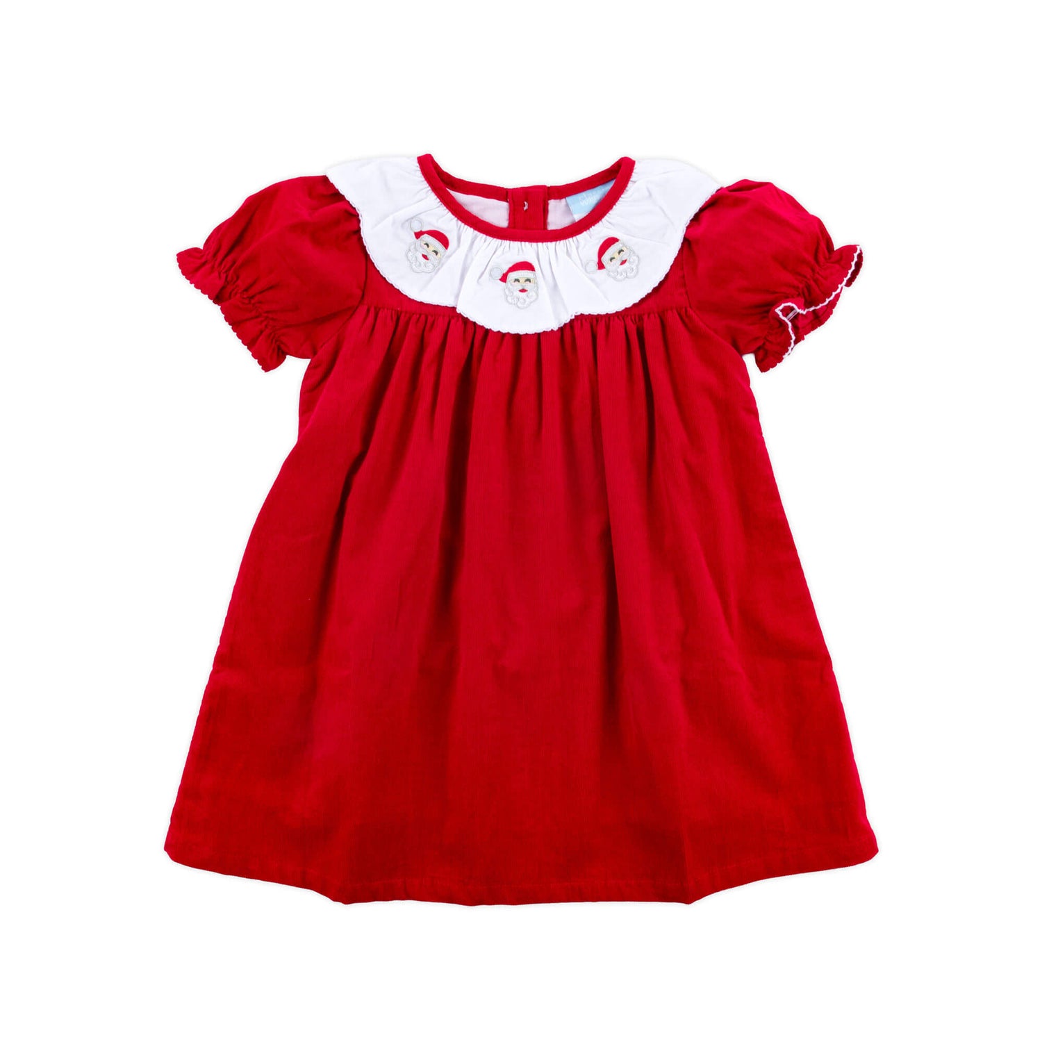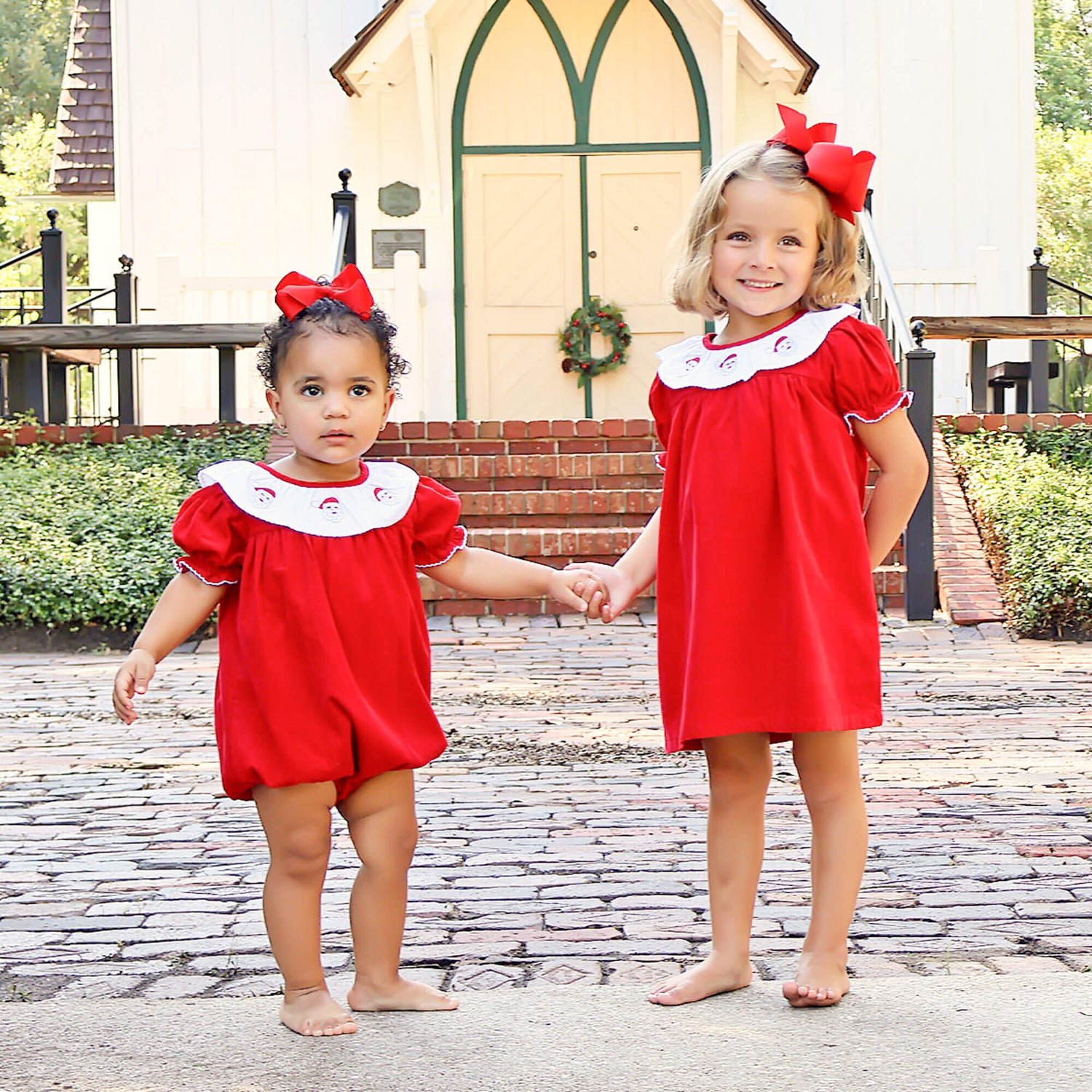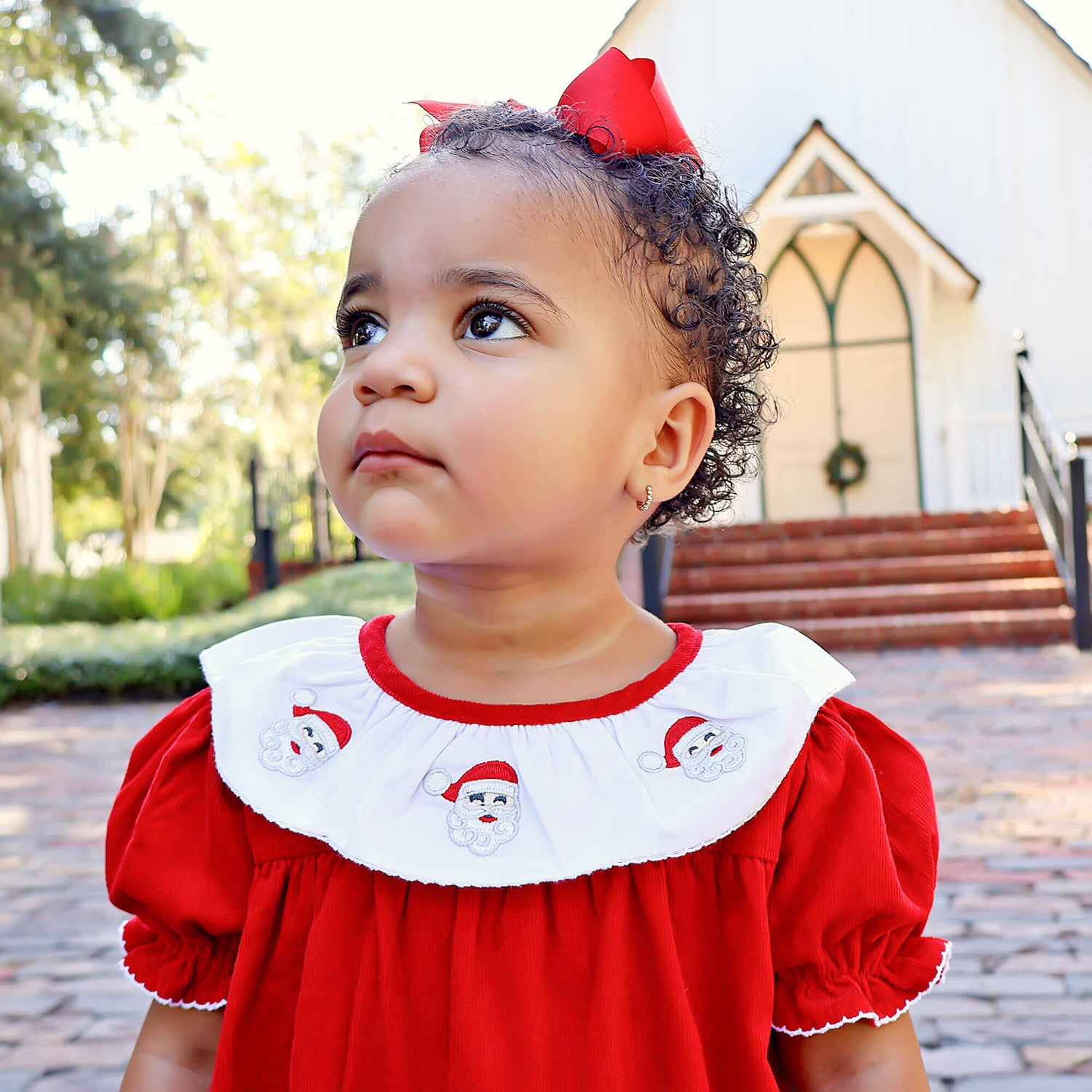 Celebrate Christmas in style with our Happy Santa Red Embroidered Quinn Dress, designed for effortless elegance, ideal for holidays festivities. This bishop sleeves Quinn-style dress features lovely embroidered happy Santas, complemented by scalloped detailing and white picot trim. It's the ideal outfit for the holiday season!