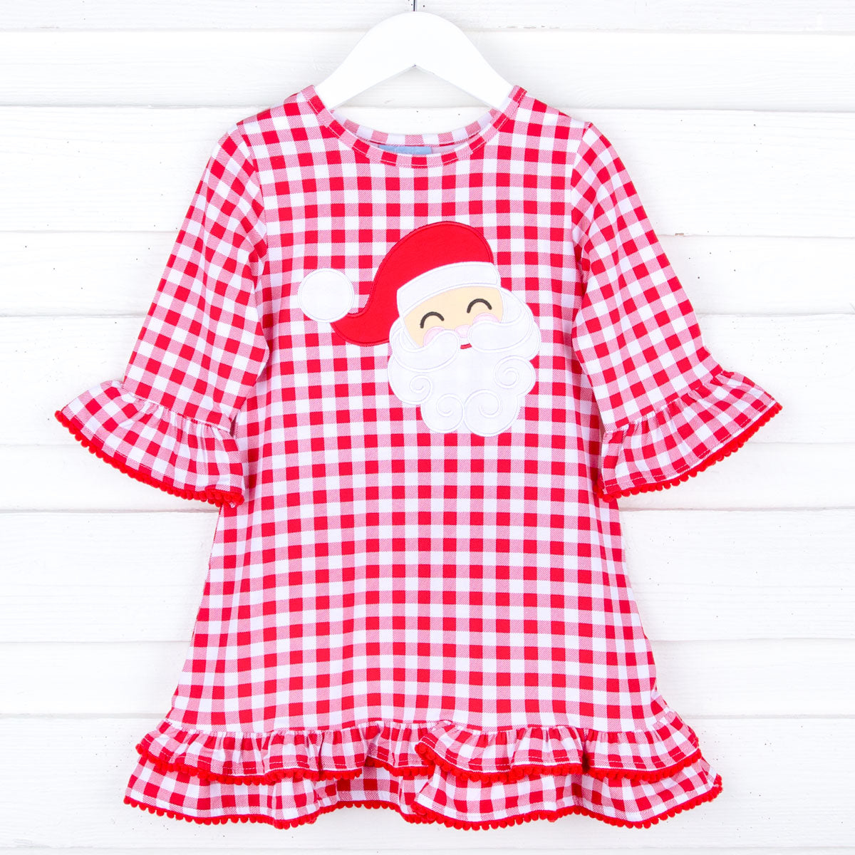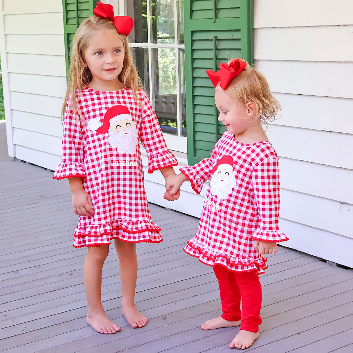 Get your little one into the holiday spirit with the Happy Santa Red Gingham Milly Dress! This festive red gingham dress features charming 3/4 sleeves with pom-pom trim and a jolly Santa applique, making it perfect for spreading holiday cheer. Add a monogram for a personalized touch that makes this outfit even more special for the season!