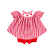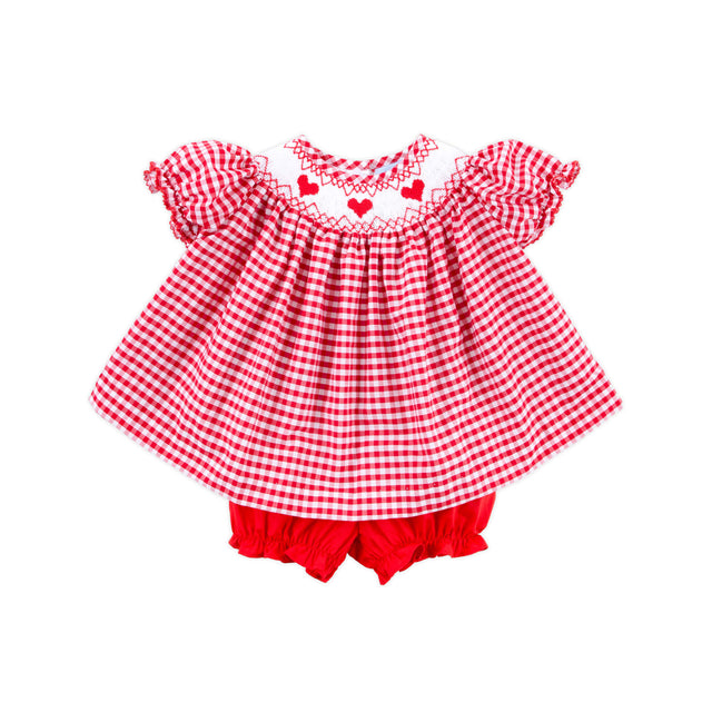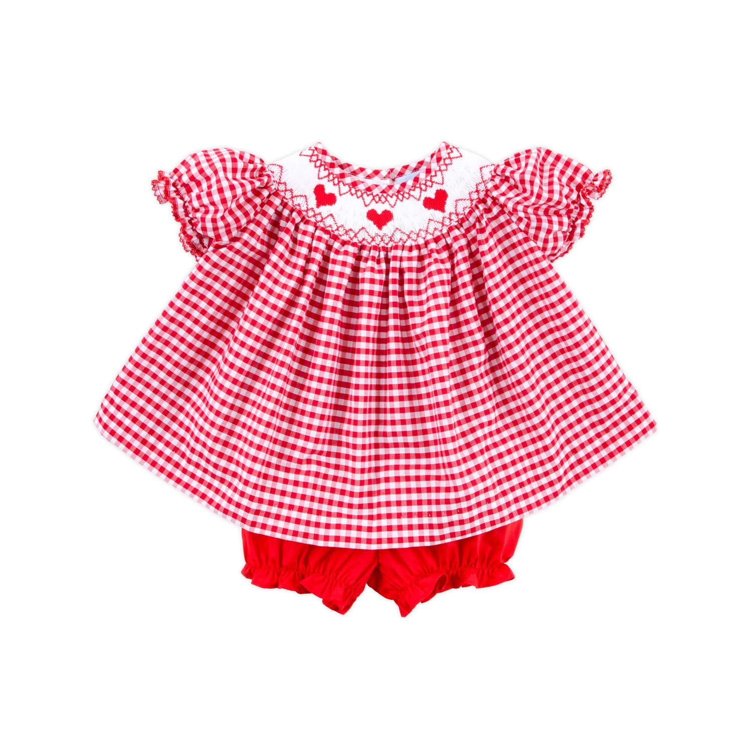 Fall in love with this adorable Heart Smocked Red Check Bloomer Set, just in time for Valentine's Day! This charming top features hand-smocked hearts on a red gingham fabric, creating a delightful and festive look. The adorable bishop sleeves with red picot trim add an extra touch of sweetness to this perfect outfit for the season of love. The set includes matching red bloomers, providing not only a charming and coordinated look but also ensuring comfort and ease for your little one.