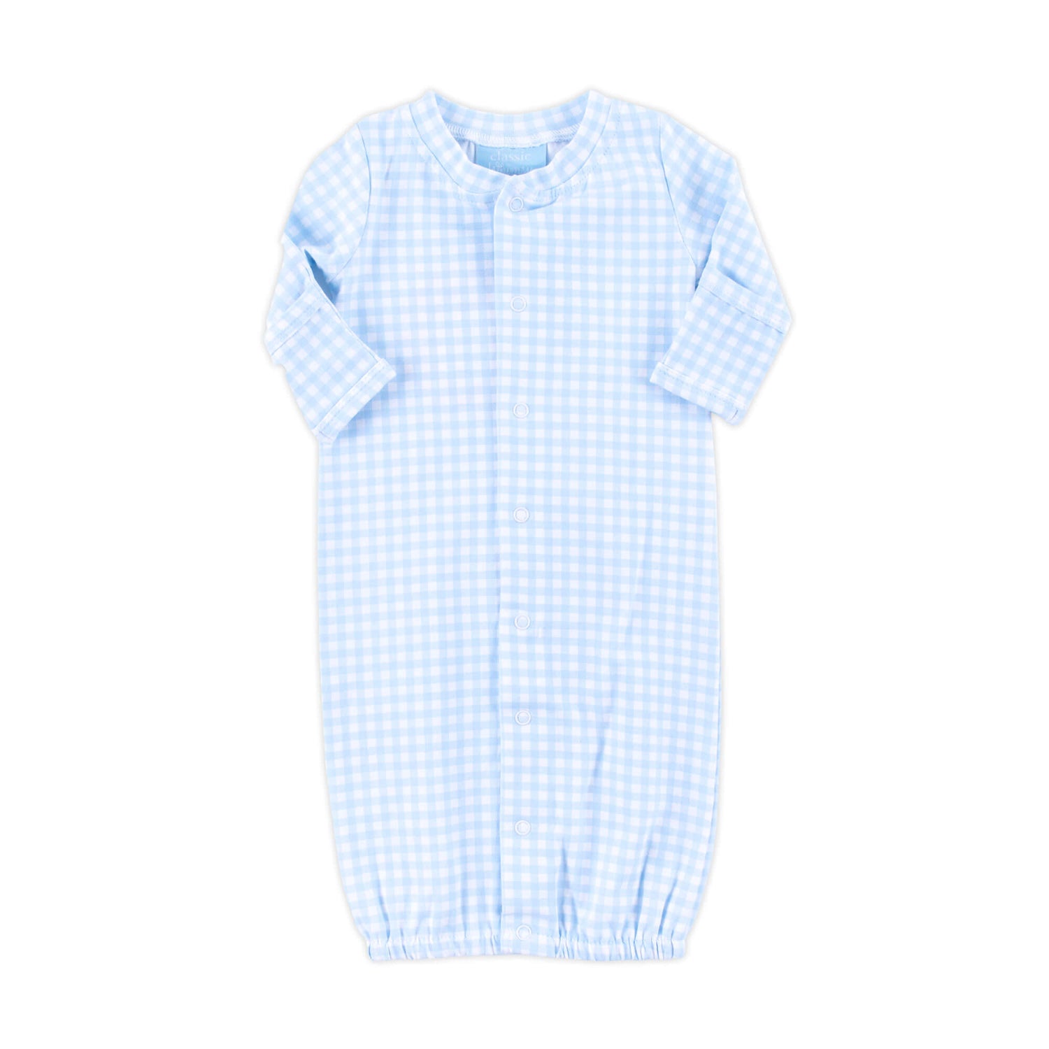 Our Light Blue Gingham Layette Gown is the perfect gown to welcome your newborn. Features long sleeves, light blue gingham, snaps for easy changing, and elastic bottom. Add a monogram to personalize the look!