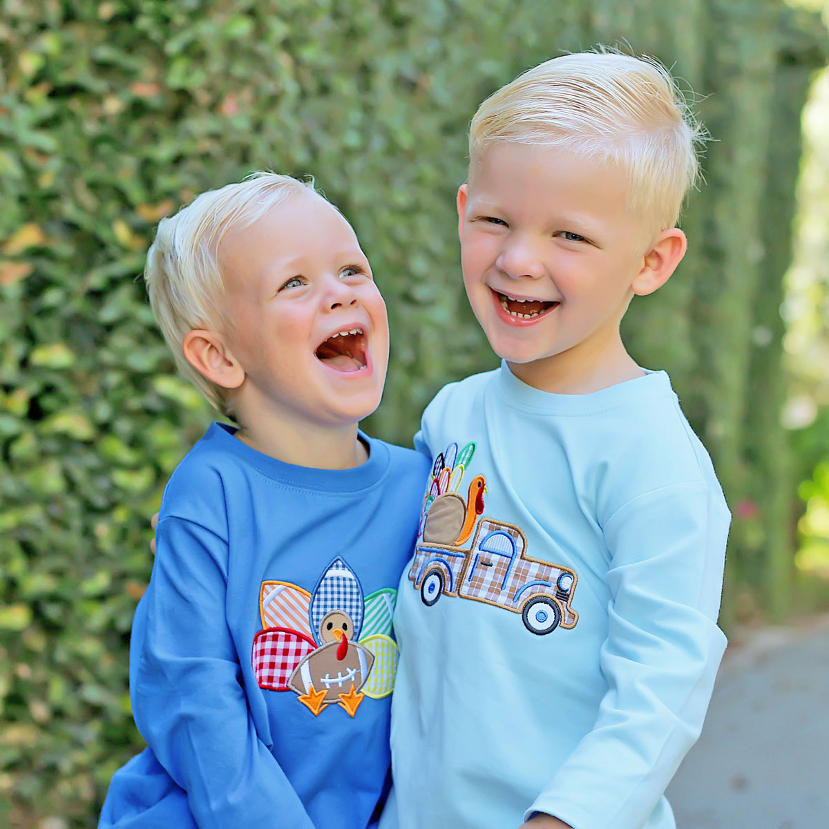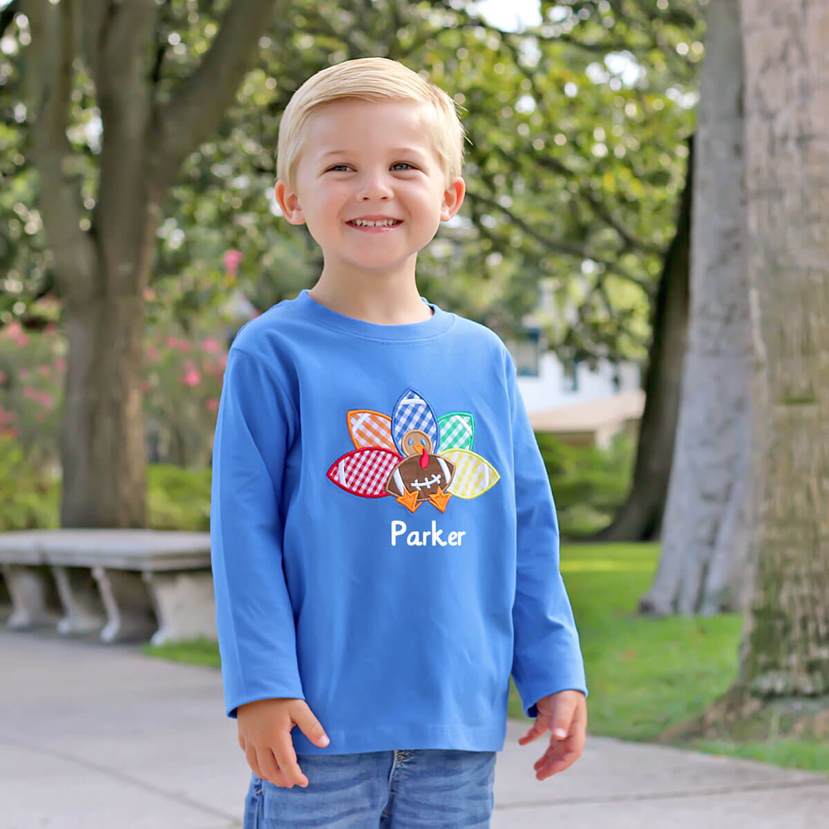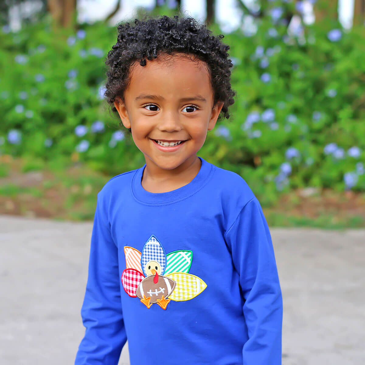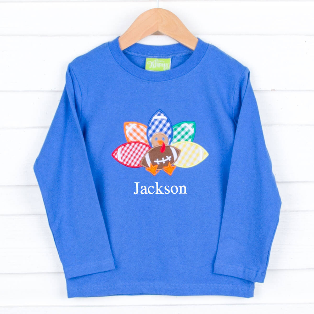 Celebrate Thanksgiving and football season with our Turkey Football Royal Long Sleeve Shirt! This royal blue shirt features an adorable football turkey applique, perfect for playtime, comfort, and watching football games. Add a name monogram below the applique for an extra special touch.