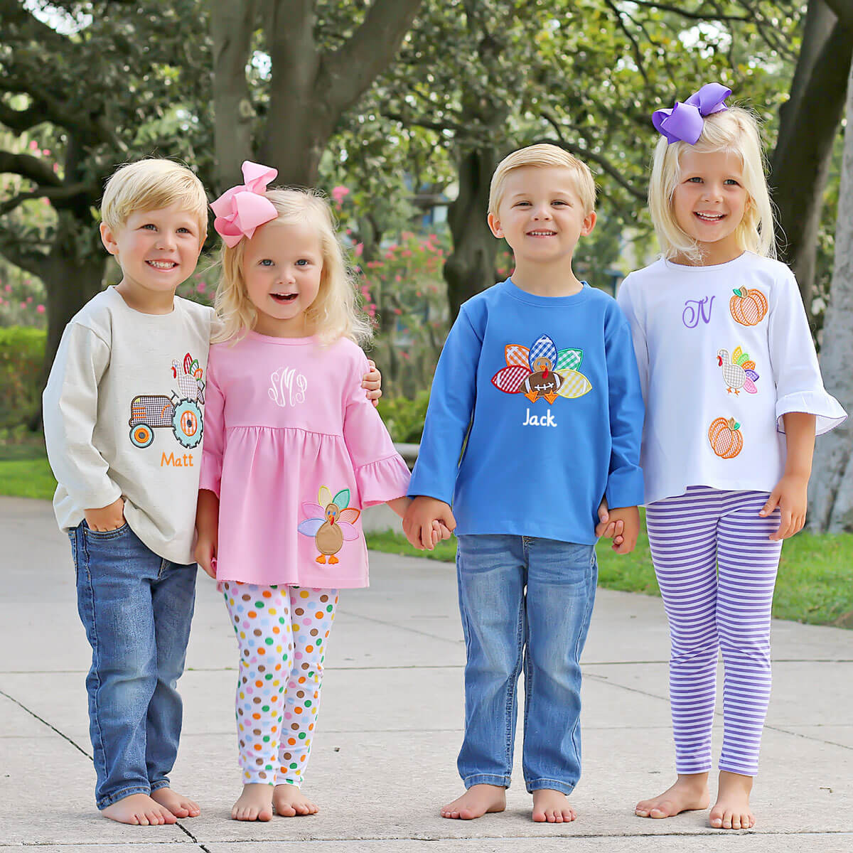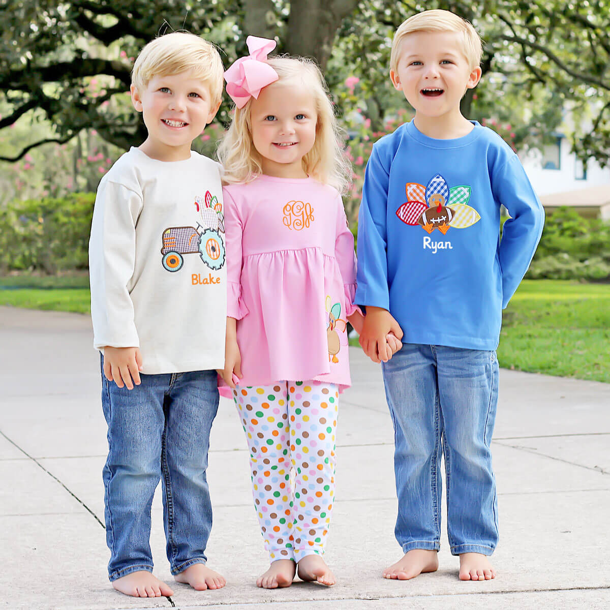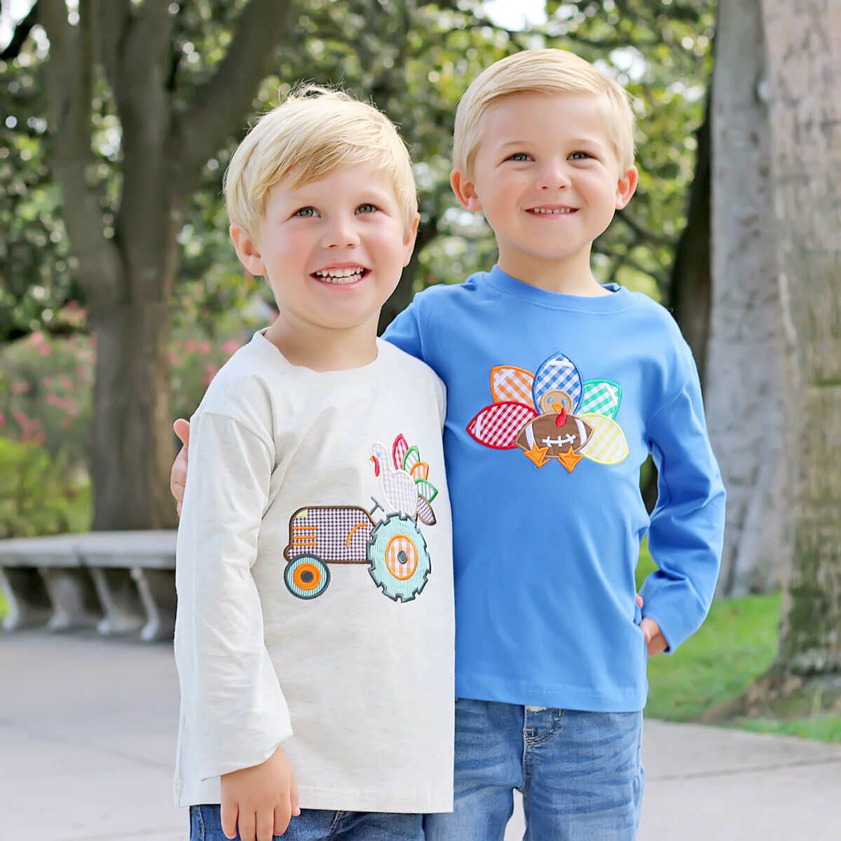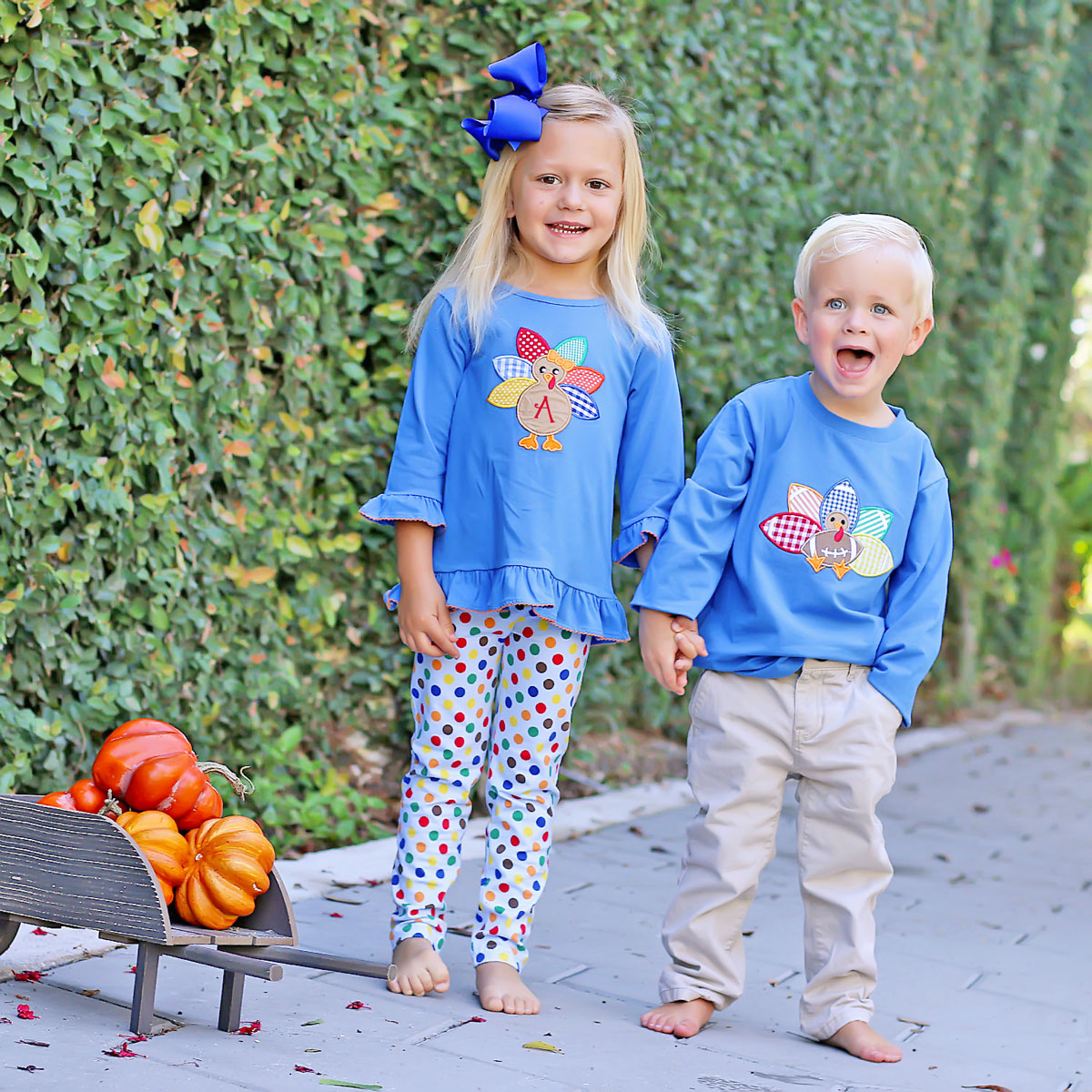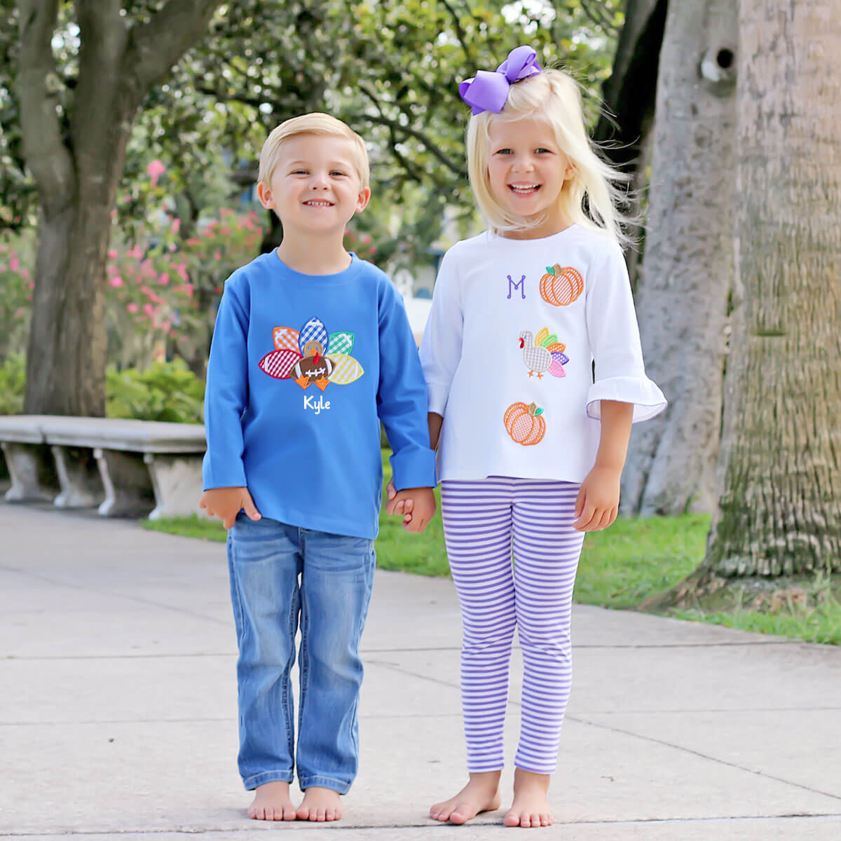 Celebrate Thanksgiving and football season with our Turkey Football Royal Long Sleeve Shirt! This royal blue shirt features an adorable football turkey applique, perfect for playtime, comfort, and watching football games. Add a name monogram below the applique for an extra special touch.