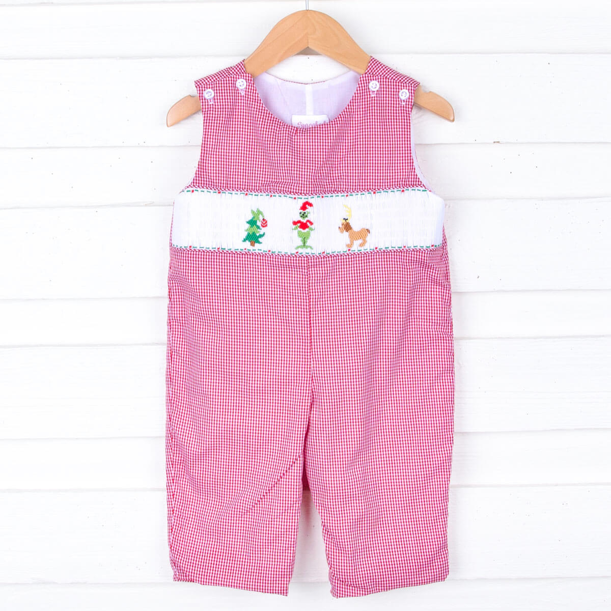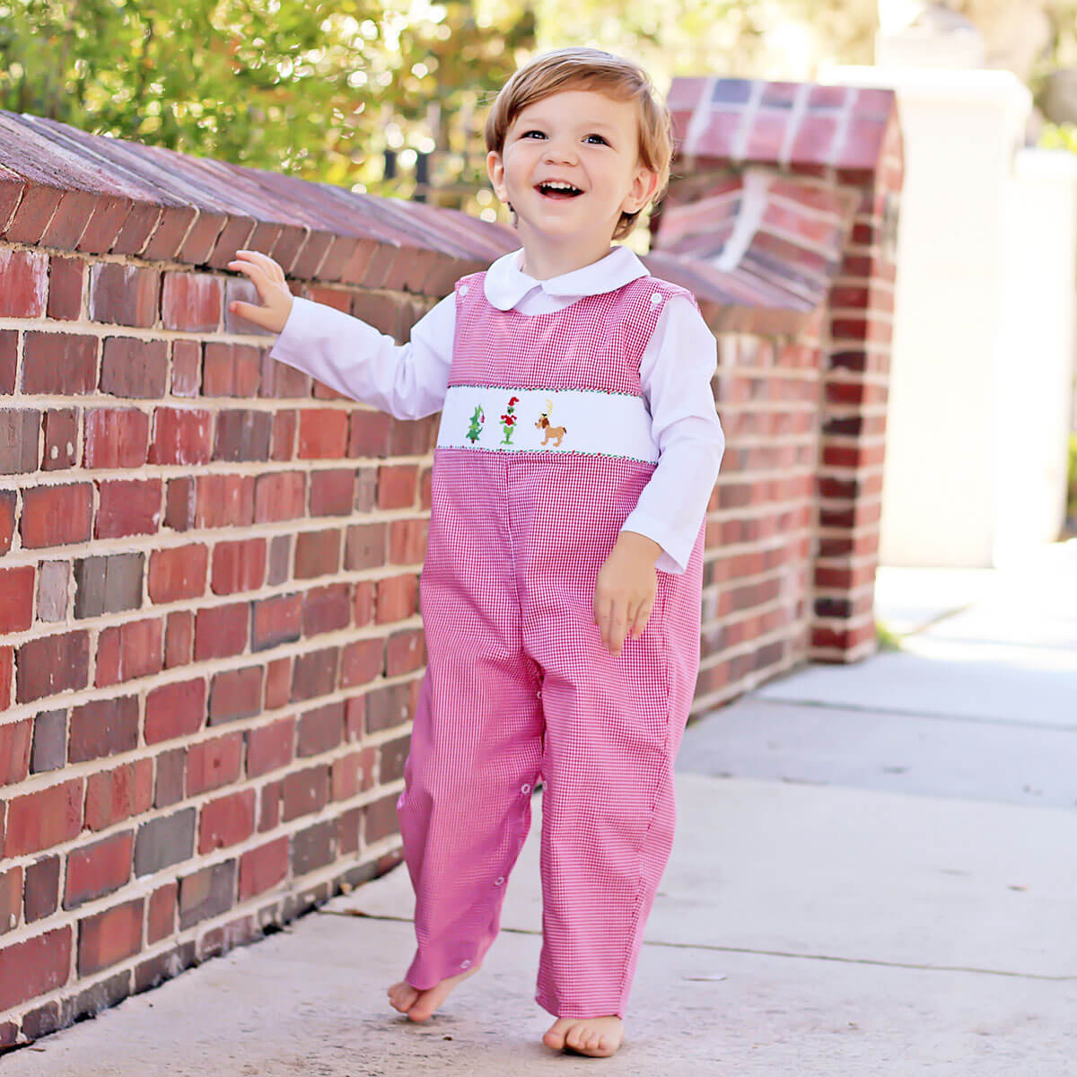 Get into the holiday spirit with our enchanting Mr. Grouch Smocked Longall. This red gingham longall is a must-have addition to your little one’s holiday wardrobe! It features hand-smocked Mr. Grouch characters, adding a touch of festive magic. Shoulder buttons and snaps in the stride ensure easy changes, so your little one can keep enjoying all the holiday fun.