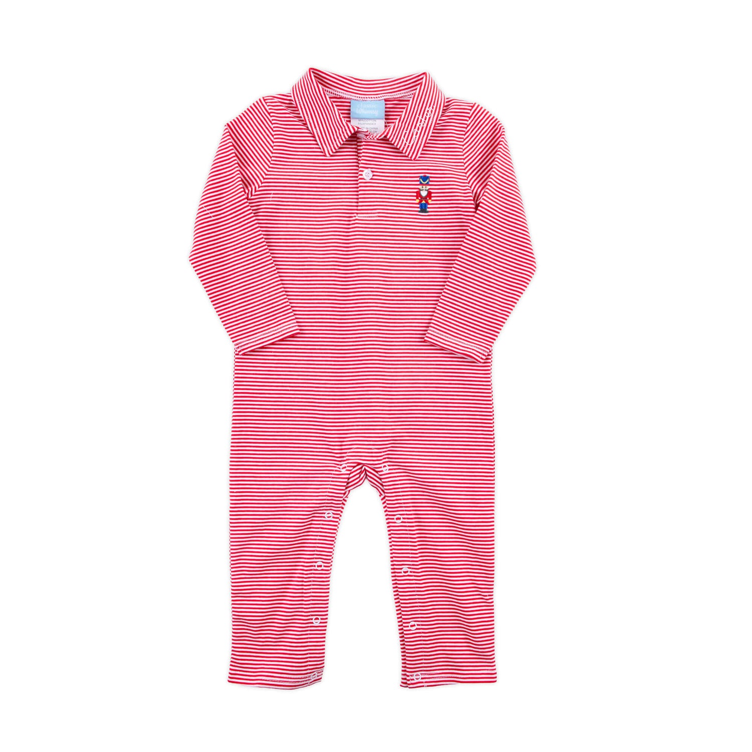 Get ready for the holiday season with our Nutcracker Red Stripe Polo Romper! This red stripe polo romper features a cute Nutcracker embroidery, long sleeves, and snaps in stride for easy changing. Making it the perfect outfit for holiday parties, playtime fun, comfort, and cuteness! Add a monogram to make this holiday look even more special!