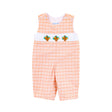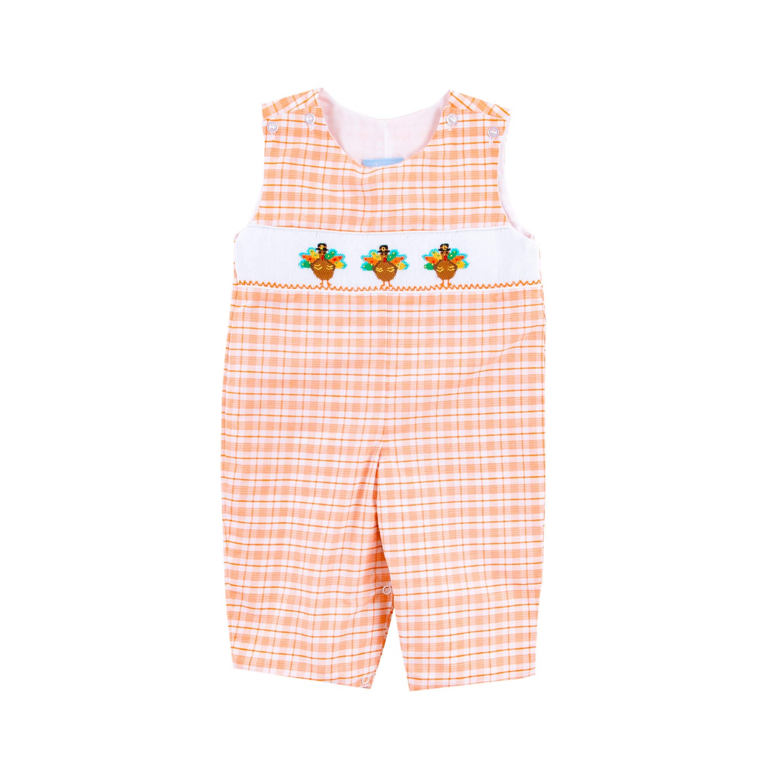 Get your little one ready for your family gathering this Thanksgiving in our Pilgrim Turkey Smocked Orange Plaid Longall! This festive orange plaid longall features three adorable smocked turkeys, making it the perfect choice for holiday gatherings and family celebrations. Shoulder buttons and snaps at the stride make changes easy.