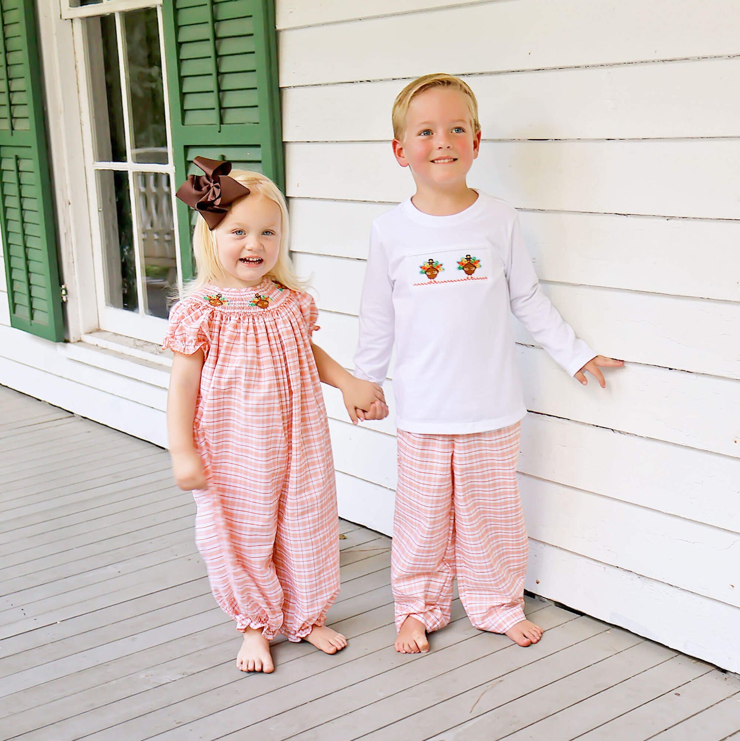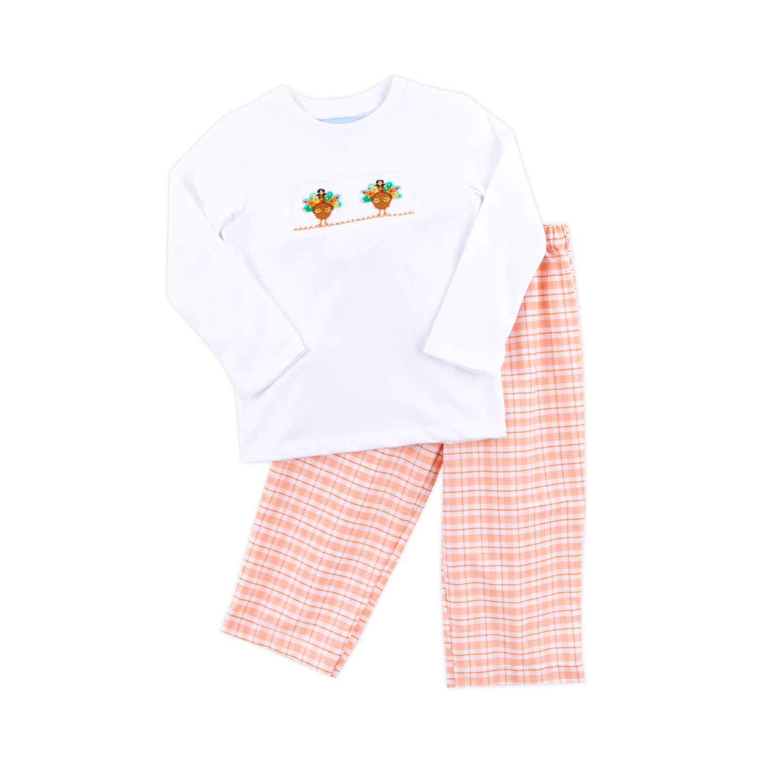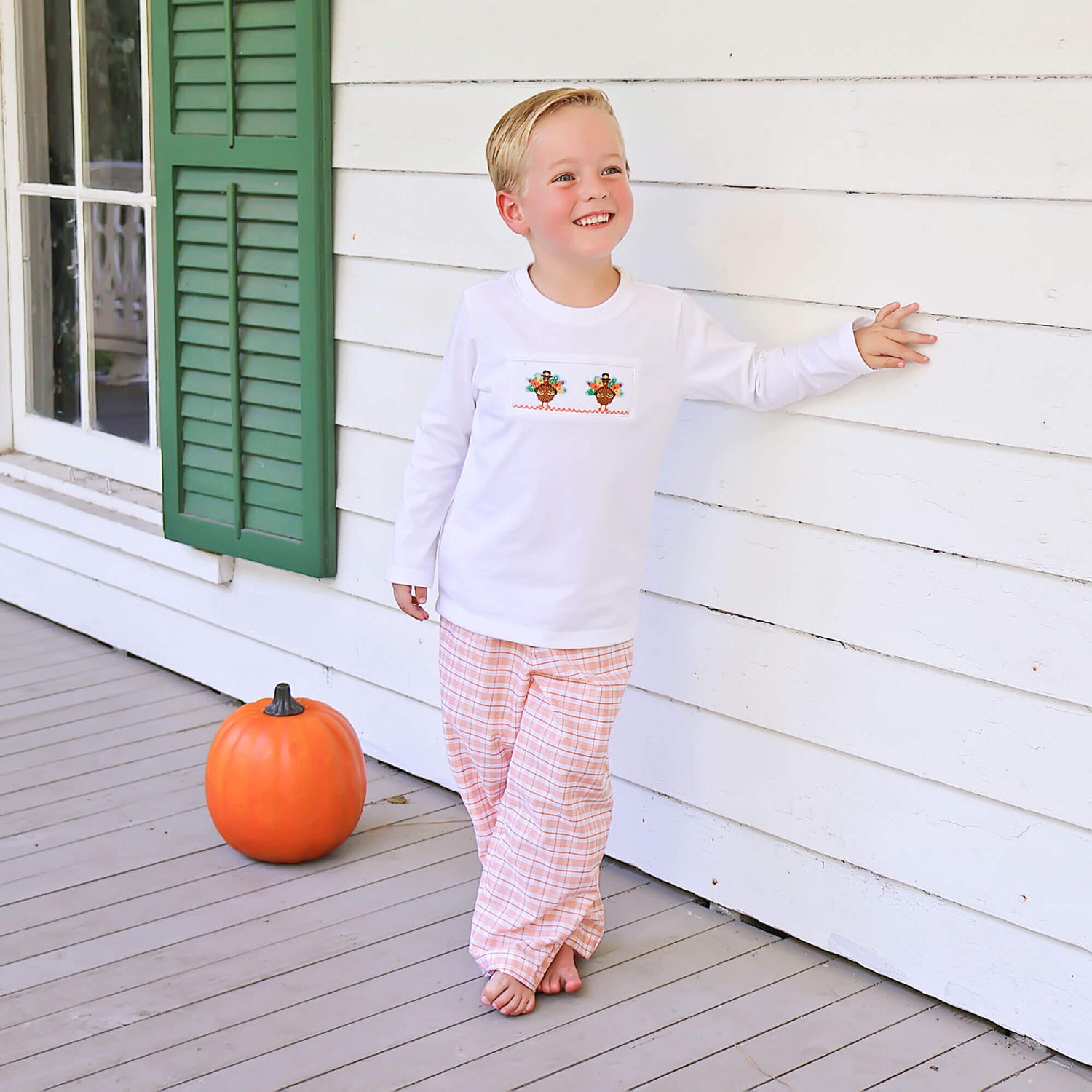 Get your little one ready for your family gathering this Thanksgiving in our Pilgrim Turkey Smocked Orange Plaid Pant Set! The long sleeve knit shirt features two adorable smocked turkeys. Paired with orange plaid pants.
