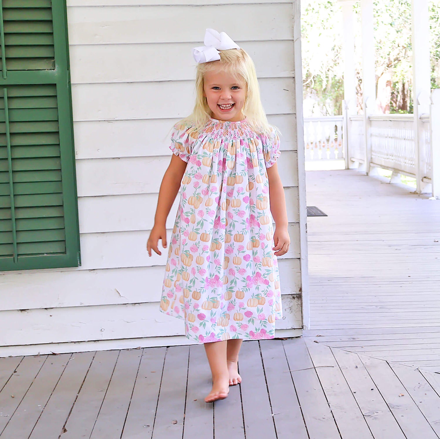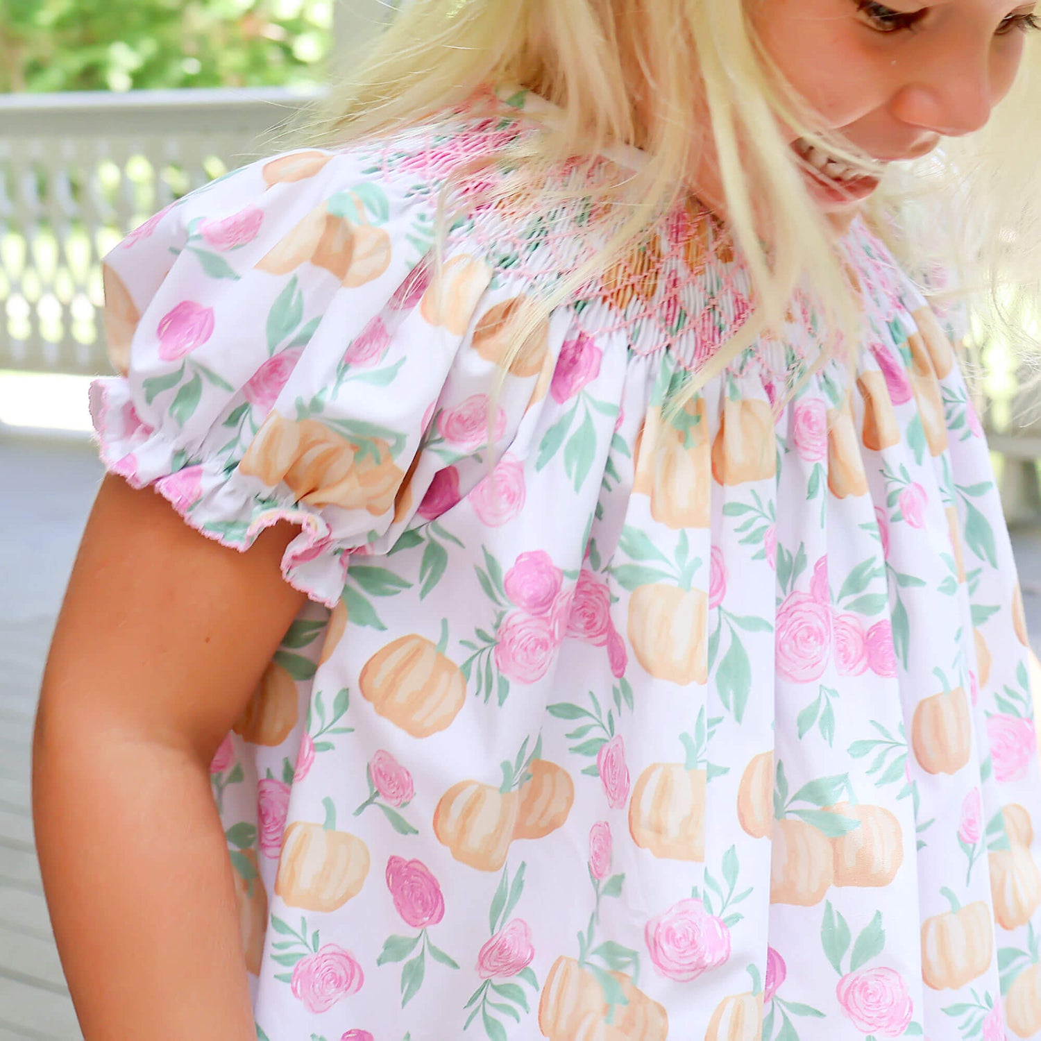 Your little one will be the cutest pumpkin in the patch with our Pink Floral Pumpkin Smocked Bishop Dress. This dress features a beautiful pumpkin and floral print. Designed with geometric smocking and bishop-style sleeves, it’s perfect for the season!