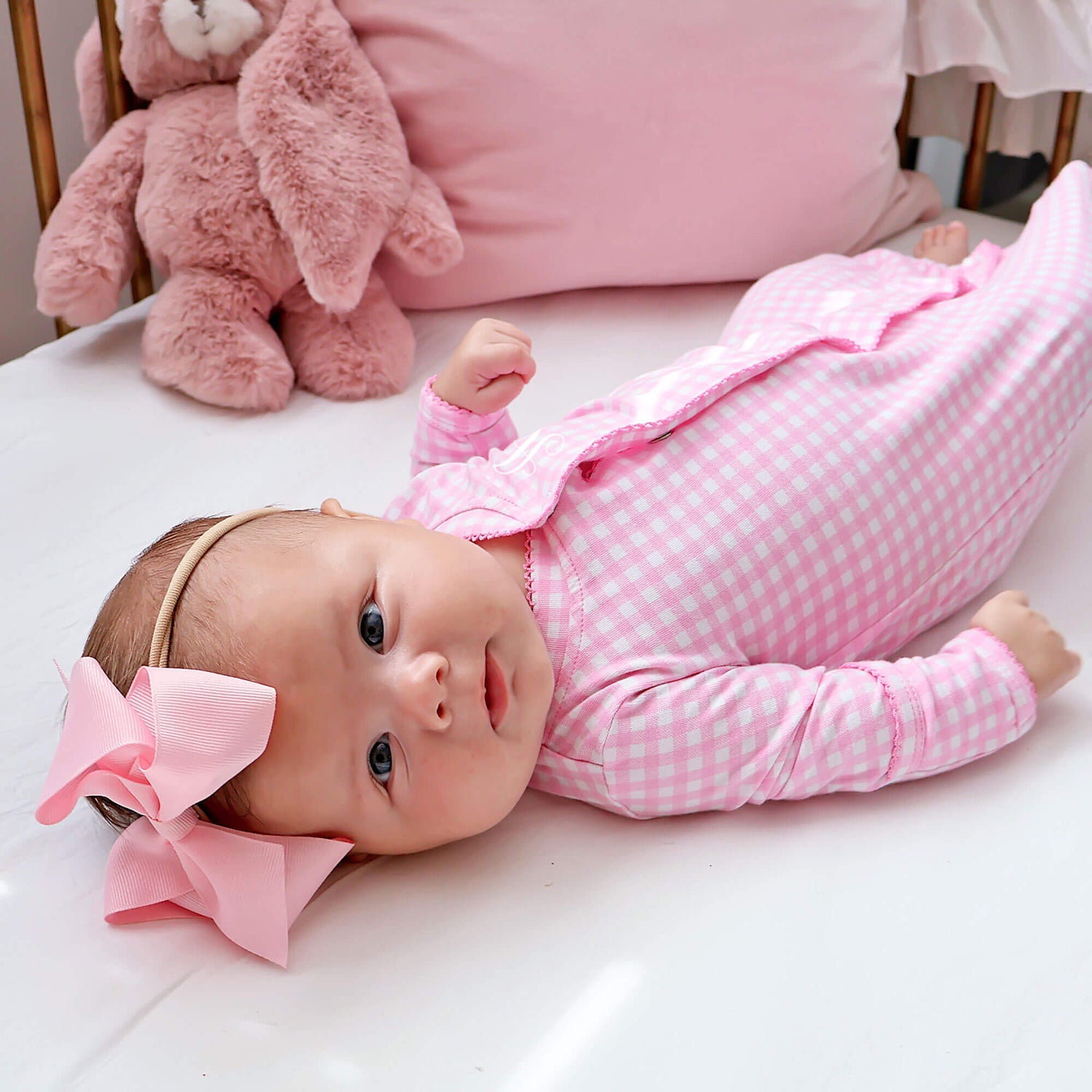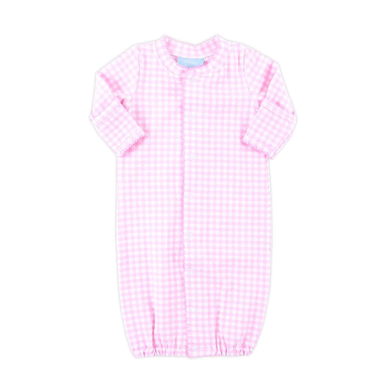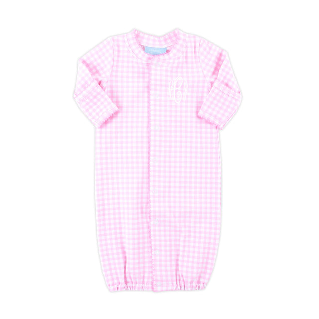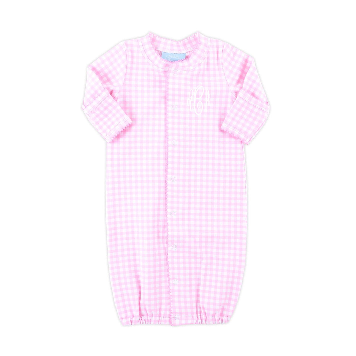 Our Pink Gingham Layette Gown is the perfect gown to welcome your newborn. Features long sleeves, pink gingham, pink picot trim, snaps for easy changing, and elastic bottom. Add a monogram to personalize the look!