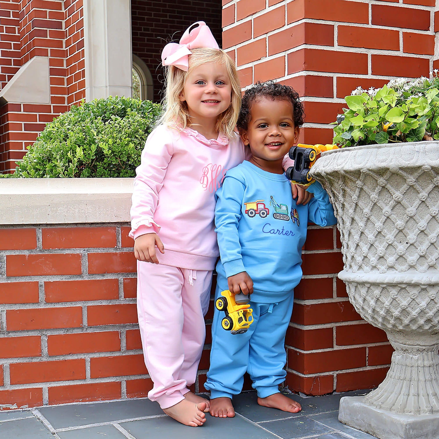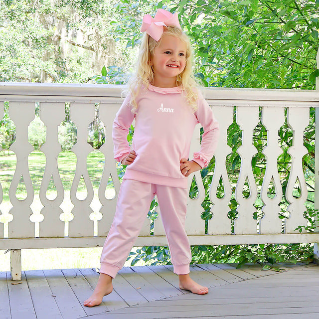 Let your little one enjoy the fall weather in our adorable Pink Ruffle Jogger Set! It’s perfect for cooler days. The pink French terry sweatshirt features ruffle details, and the matching joggers have an easy pull-on string waistband. Add a monogram for a special touch and make it uniquely theirs!