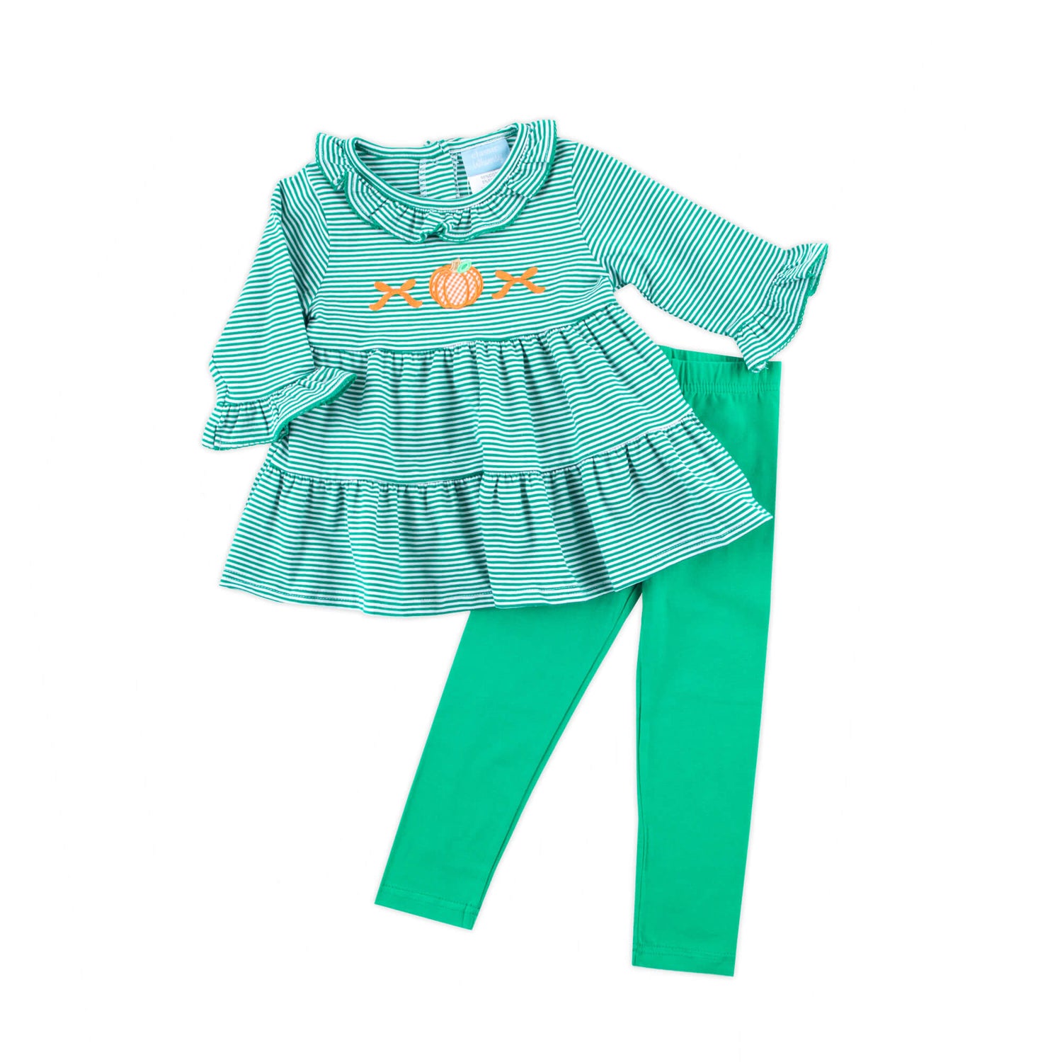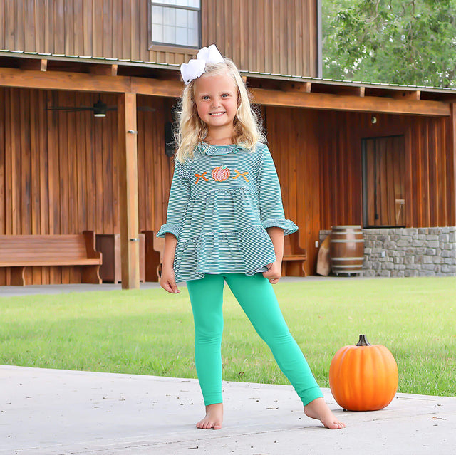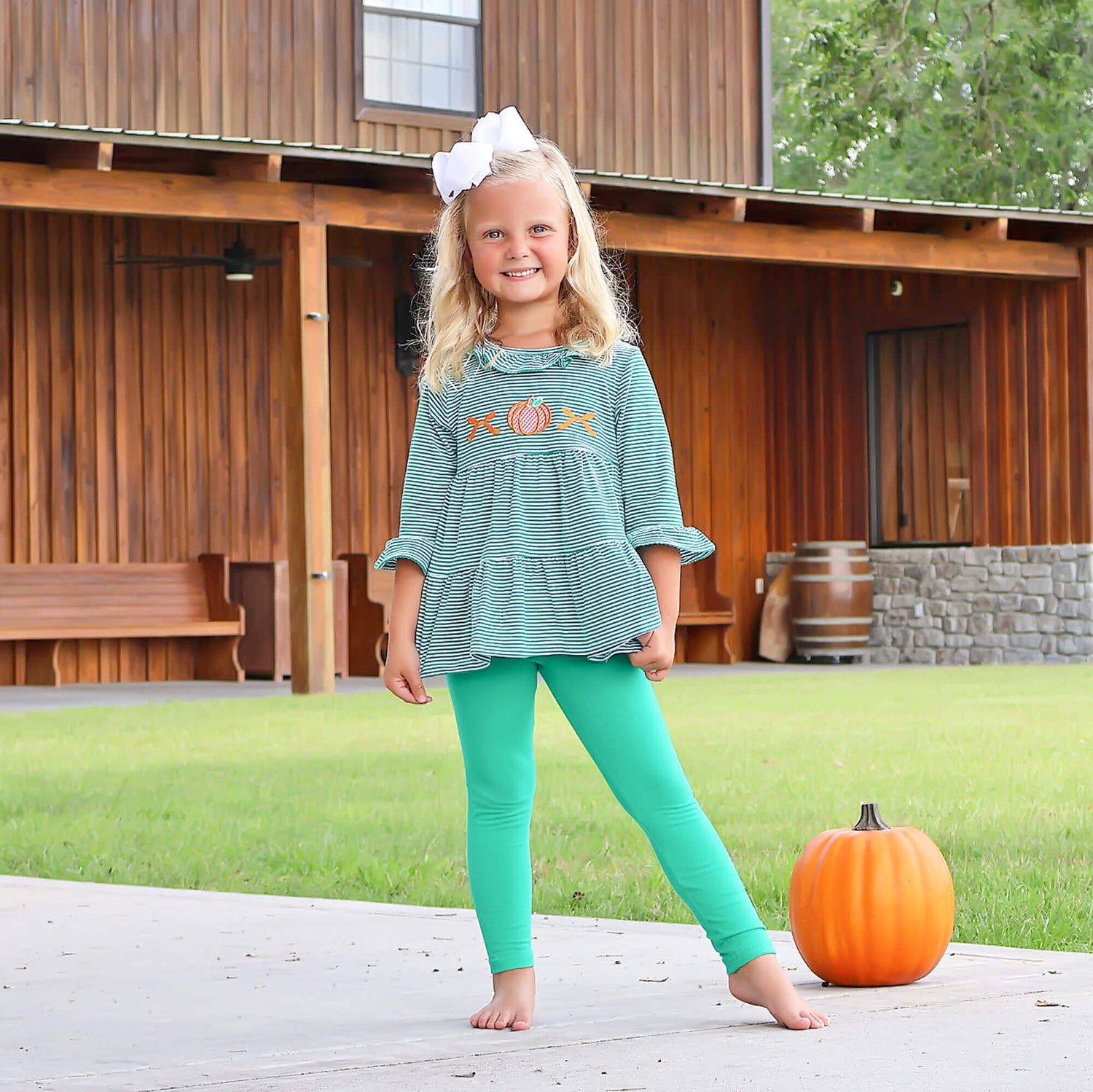 Your little sweetie will be all set for fall in our Pumpkin Bows Green Stripe Callie Legging Set! This charming Callie-style top features 3/4 sleeves and adorable pumpkin and bow appliqués. Paired with coordinating green leggings, it’s perfect for pumpkin patch adventures and all the season’s festivities. Let the autumn fun begin!