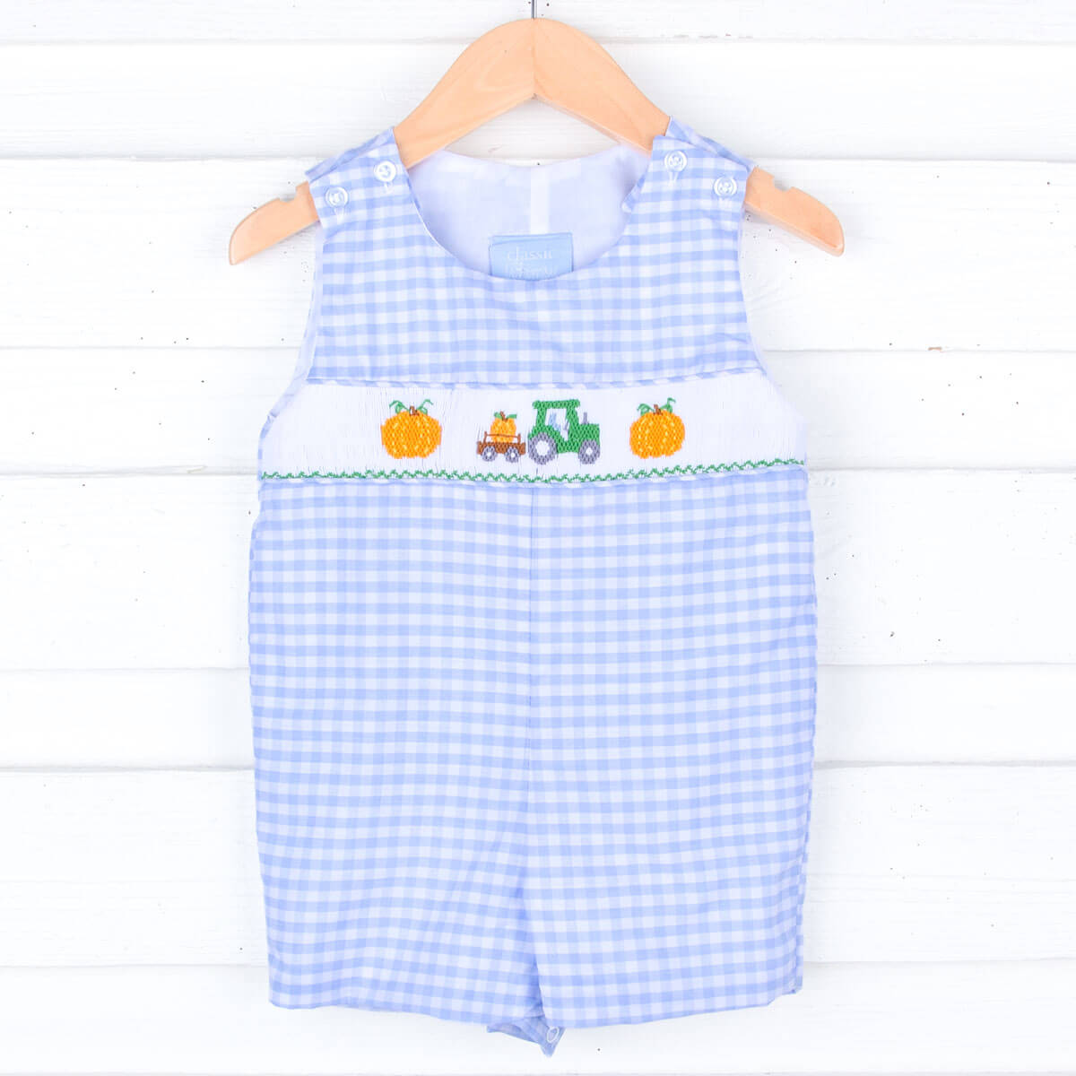 Your little one will love our Pumpkin Hayride Blue Check Smocked Jon Jon for a fun-filled day at the pumpkin patch! This adorable blue gingham check Jon Jon features the cutest smocked pumpkins and a green tractor, making it perfect for pumpkin picking adventures. Shoulder buttons and snaps in stride ensure easy changes, so they can enjoy every moment of the season!