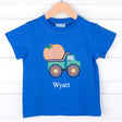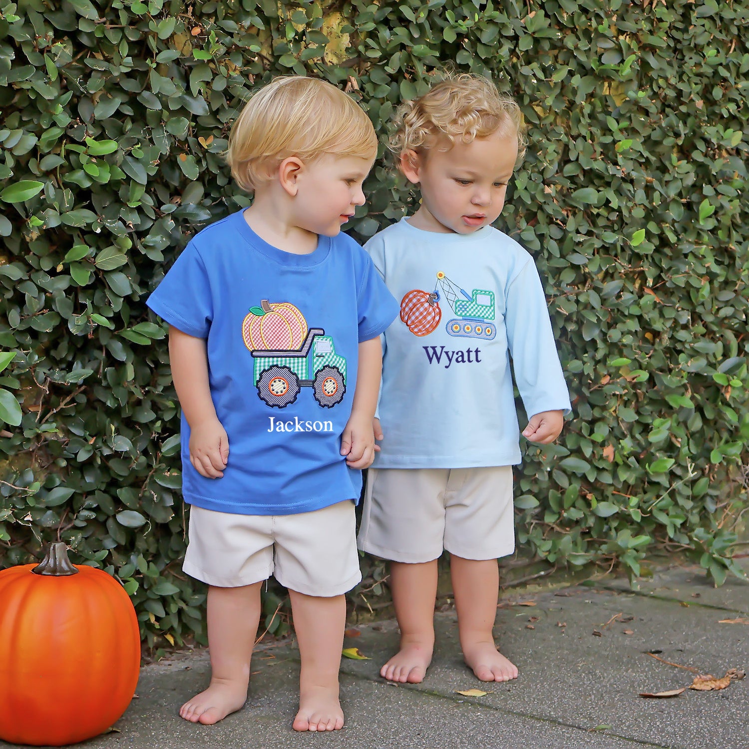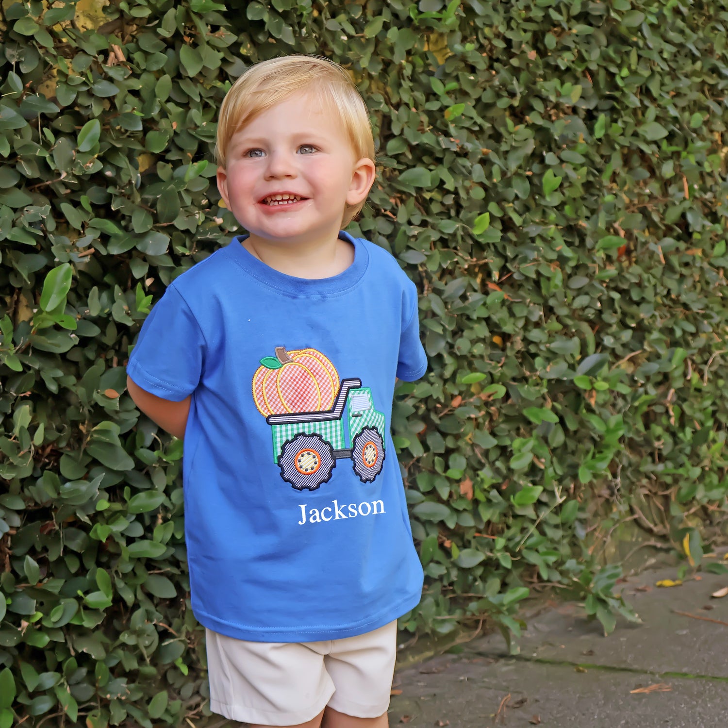 It’s pumpkin patch season with our Pumpkin Truck Royal Blue Short Sleeve Shirt! This royal blue knit shirt features a dump truck applique filled with a large pumpkin from the patch. It’s perfect for playtime, comfort, and cuteness! Don’t forget to add a name monogram below the applique for a special touch!