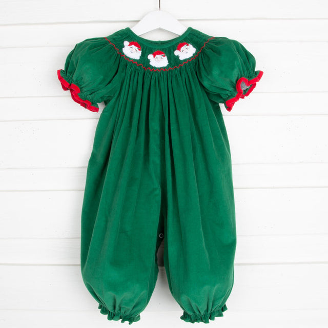 Green and red are the most festive colors for Christmas! We added smocked Santa faces to perfect this holiday look to this green corduroy. Snaps in stride.