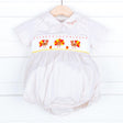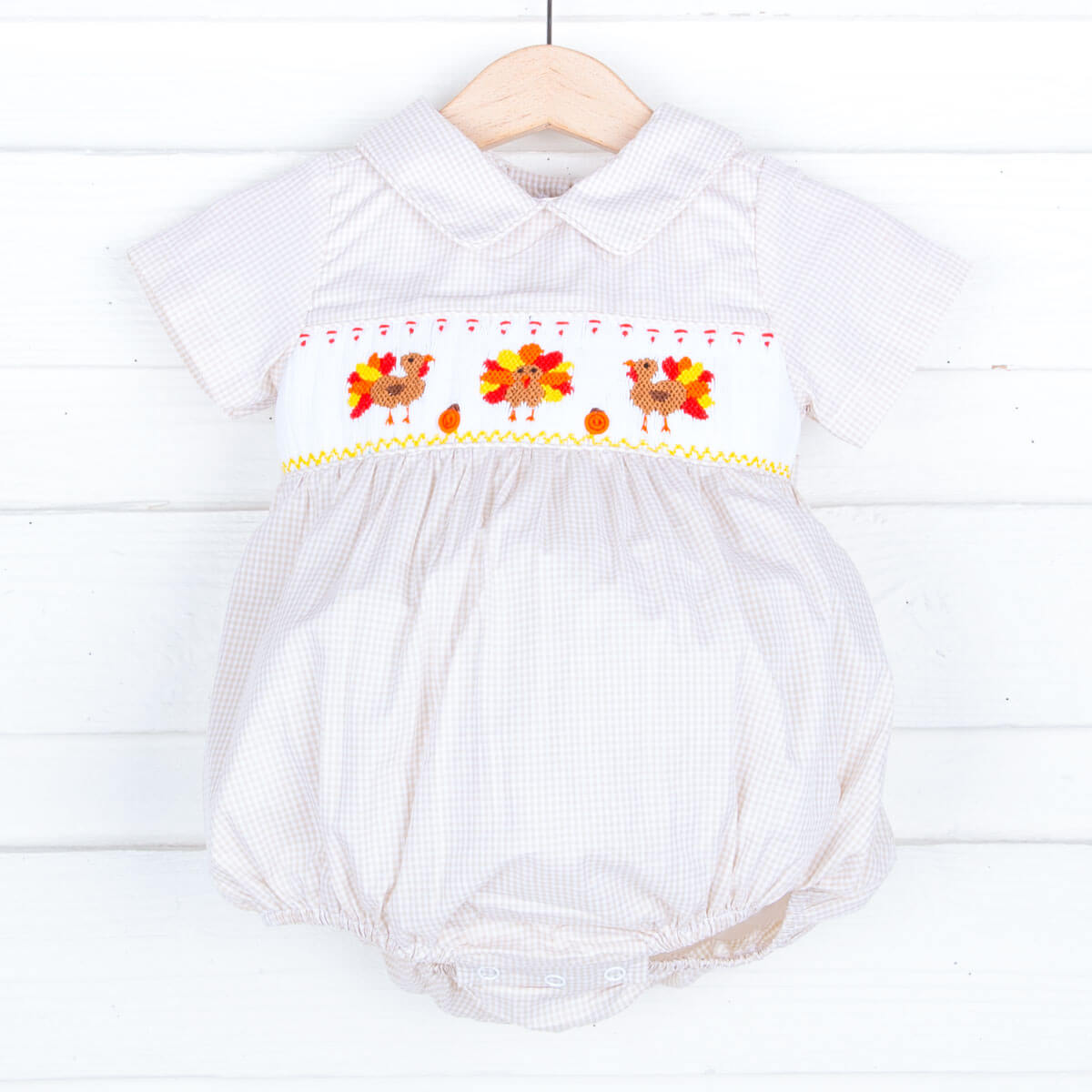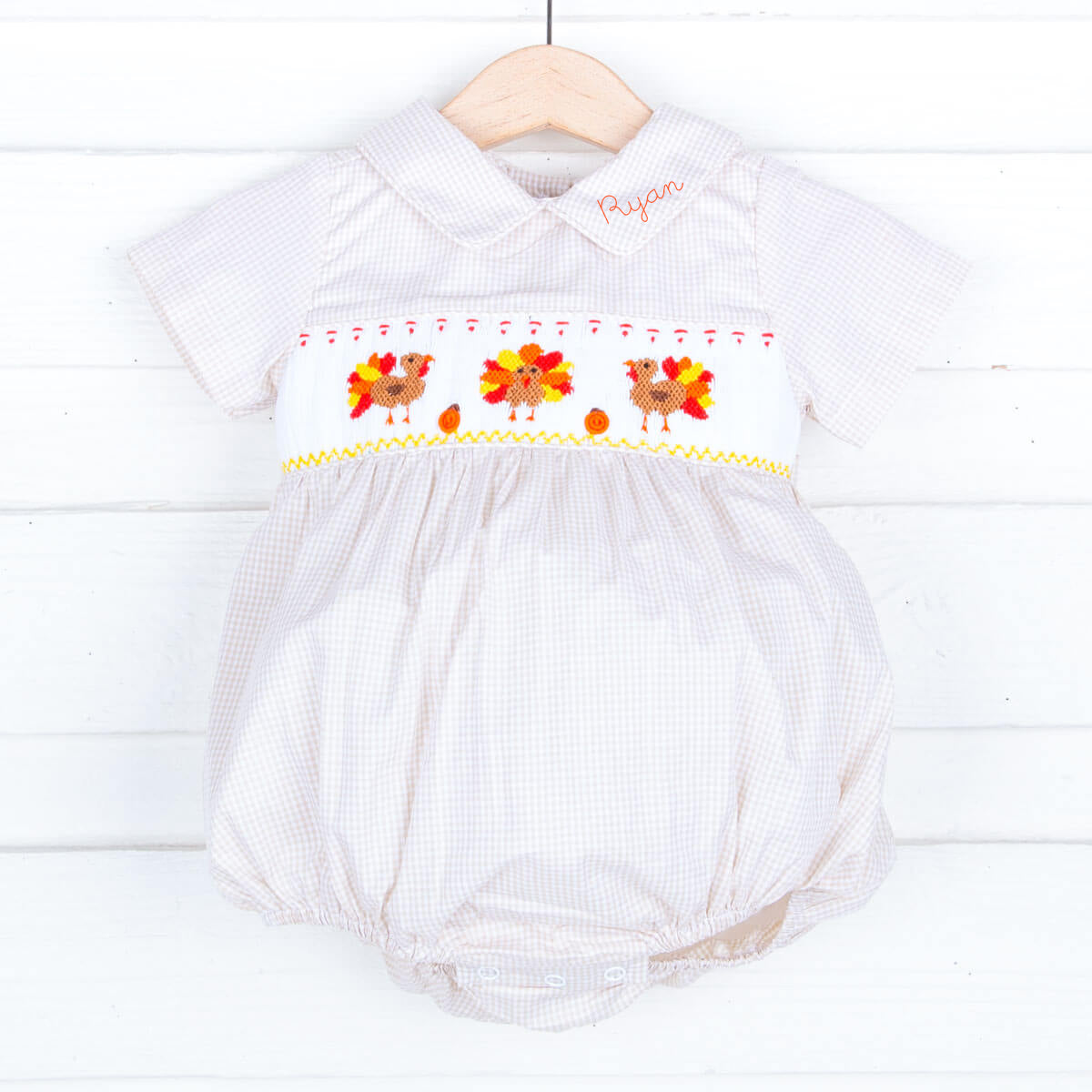 Celebrate Thanksgiving in style with our Smocked Turkey Khaki Gingham Boy Bubble, perfect for festive family gatherings. This charming khaki gingham bubble features a classic collar, short sleeves, and adorable smocked turkeys for a delightful holiday touch. Designed with convenient stride snaps for easy changes, it's just right for your little one's holiday fun.