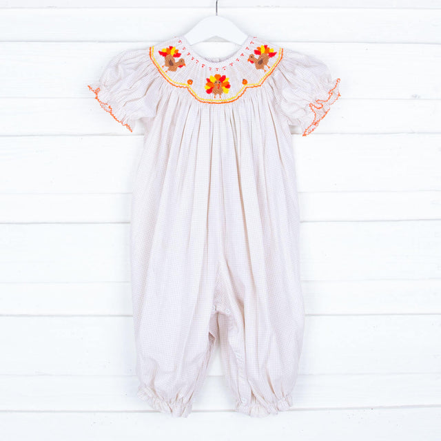 Celebrate Thanksgiving in style with our Smocked Turkey Khaki Gingham Long Bubble, perfect for festive family gatherings. This charming khaki gingham bubble features sweet bishop sleeves adorned with orange picot trim, while the adorable smocked turkey adds a festive touch. Designed with convenient stride snaps for easy changes, it's just right for your little one's holiday fun