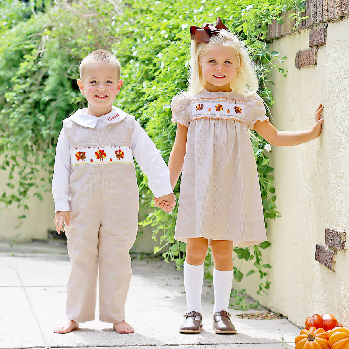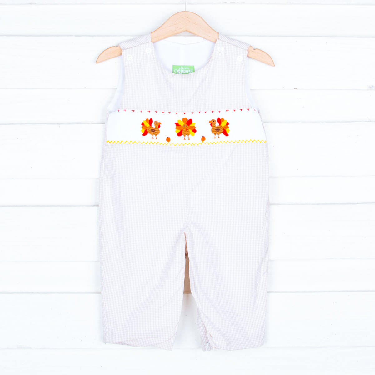 Celebrate Thanksgiving in style with our Smocked Turkey Khaki Gingham Longall, perfect for festive family gatherings. This charming khaki gingham longall features an adorable smocked turkey for a delightful holiday touch. Designed with shoulder buttons and convenient stride snaps for easy changes, it's just right for your little one's holiday fun!