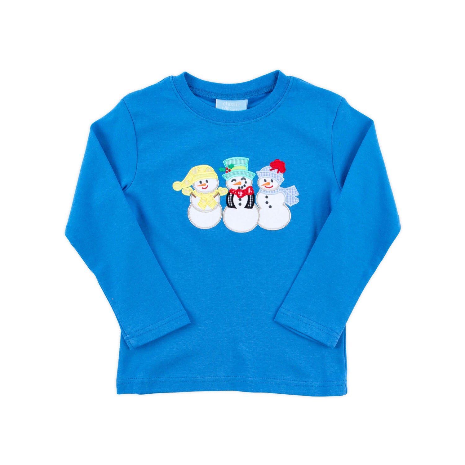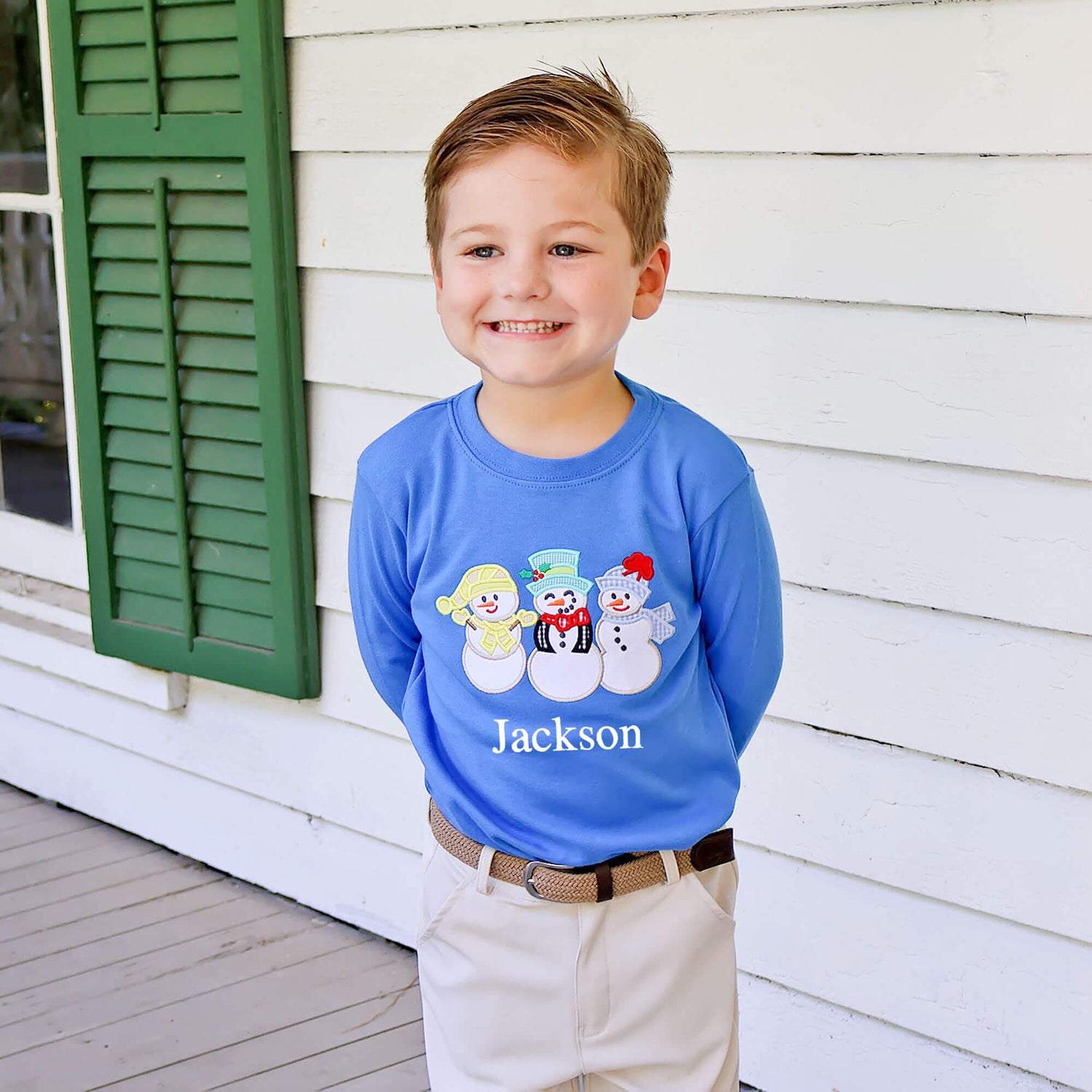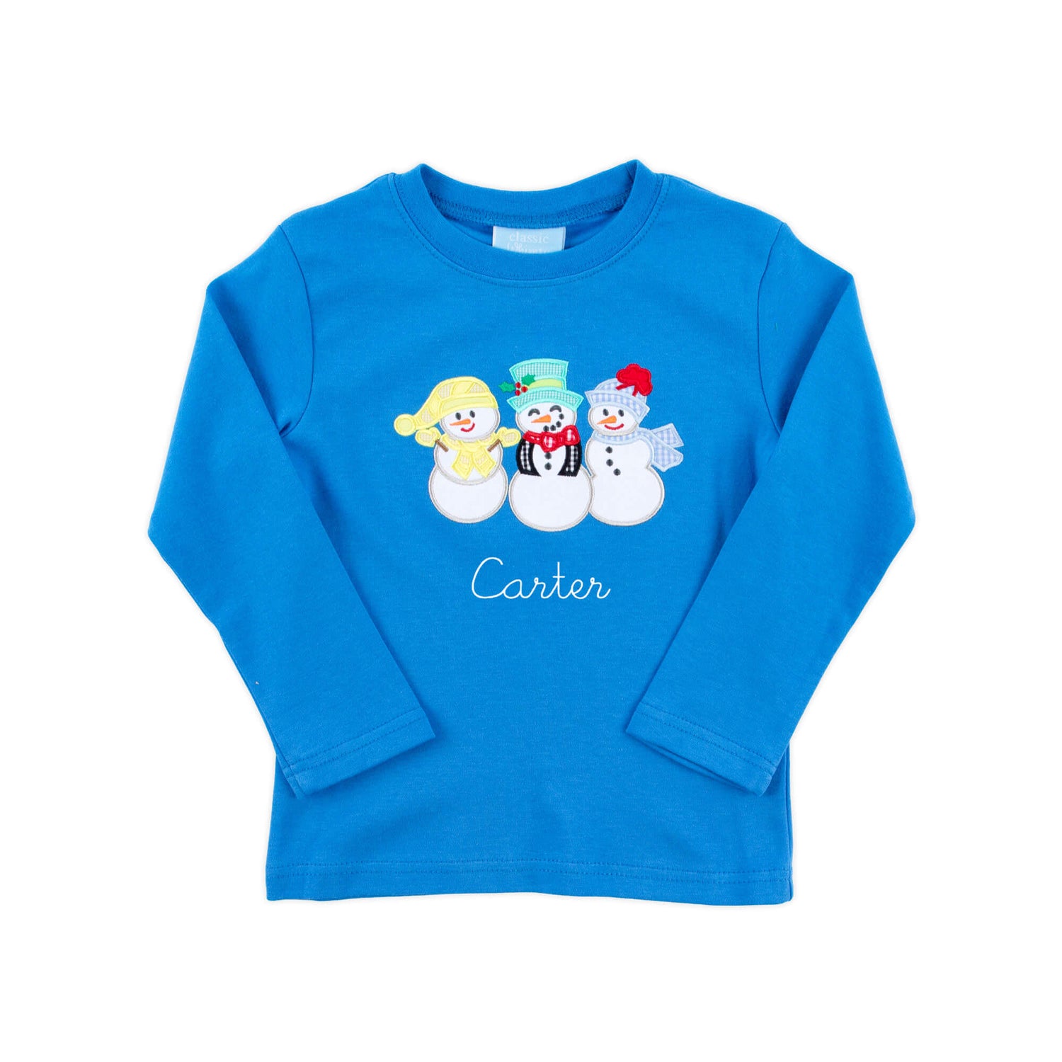 Get ready to spread Christmas cheer with our Snowman Royal Long Sleeve Shirt! This blue knit shirt features the sweetest appliques of snowmen, making it the perfect outfit for holiday parties, playtime fun, comfort, and cuteness! Don't forget to add a monogram for a personalized touch!