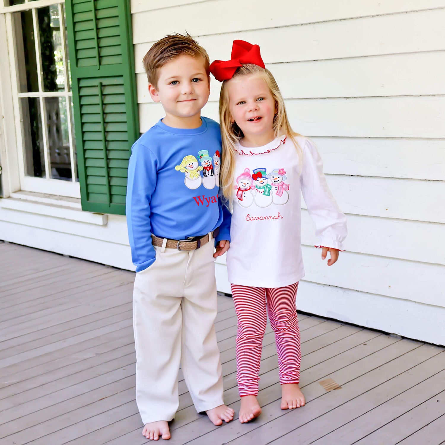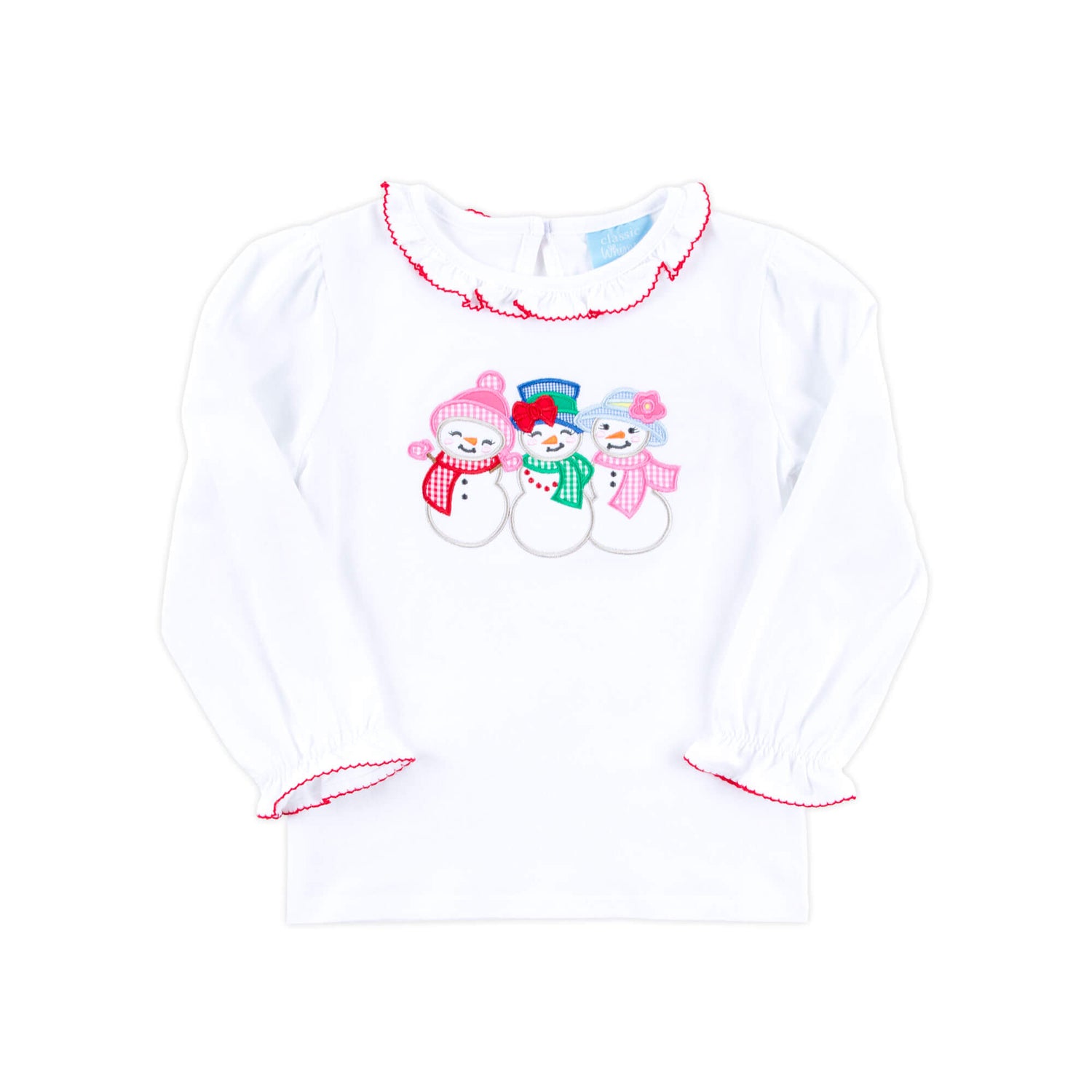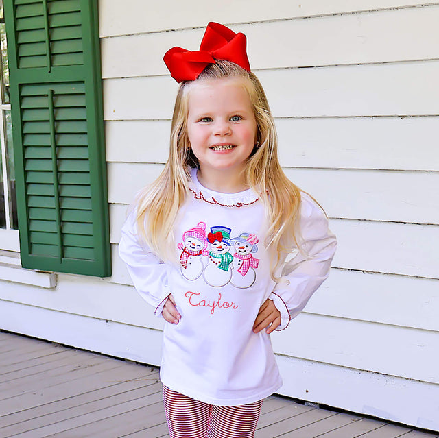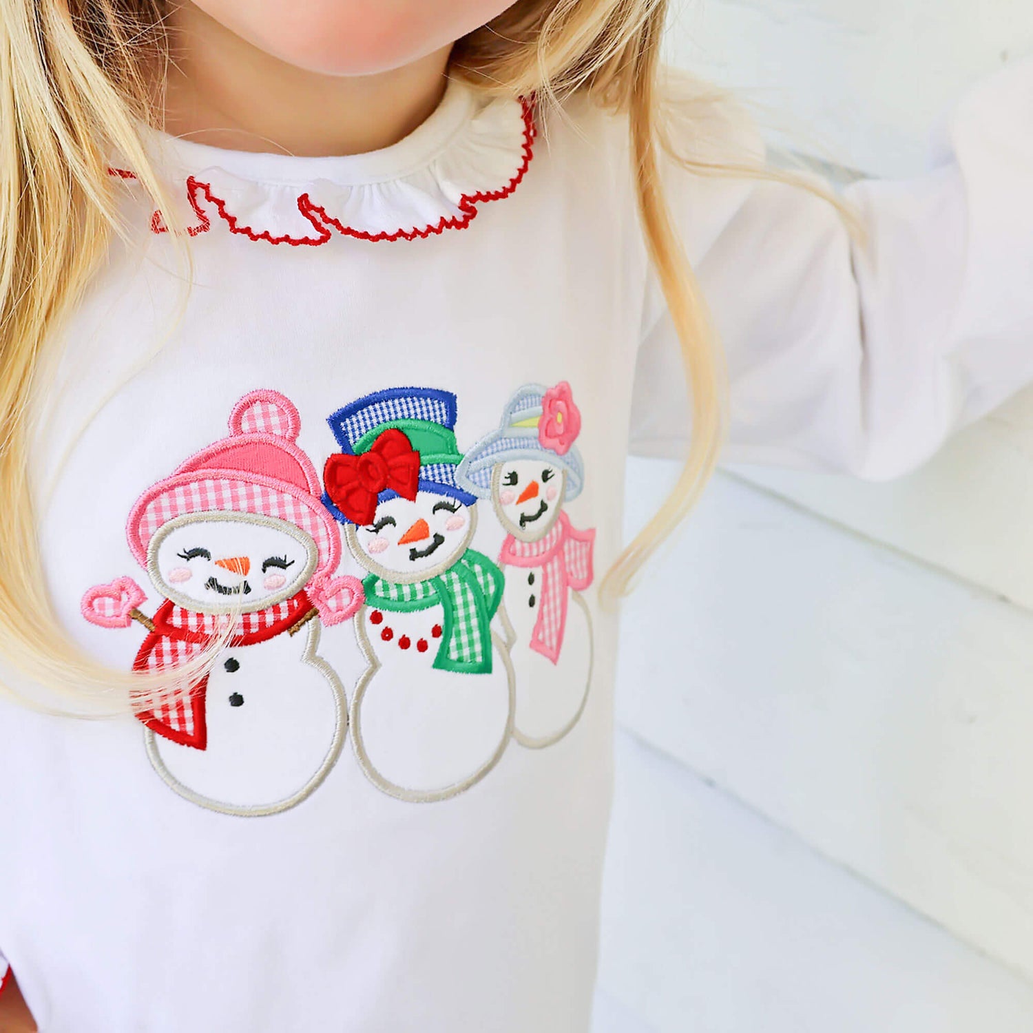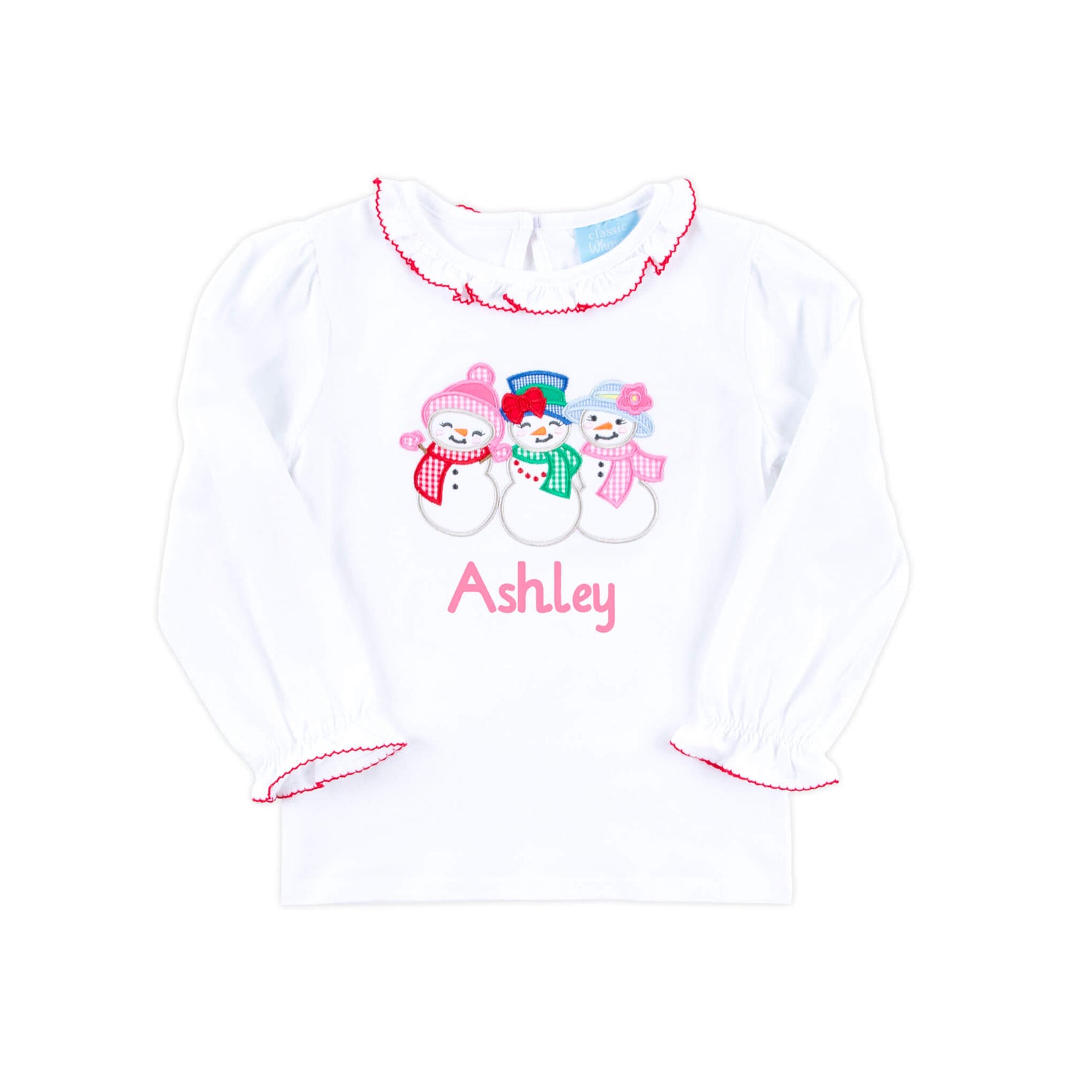 Get ready to spread Christmas cheer with our Snowman White Long Sleeve Top! This white knit top features the sweetest appliques of snowmen, long sleeves, and ruffle collar with picot trim. Making it the perfect outfit for holiday parties, playtime fun, comfort, and cuteness! Don't forget to add a monogram for a personalized touch!