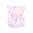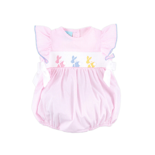 Make this Easter extra special for your little one with our Spring Bunnies Smocked Beverly Bubble. This vertical pink stripe Beverly-style bubble features the sweetest smocked Easter bunnies, complete with flutter sleeves adorned with blue picot trim and charming white side-tie bows. It conveniently fastens with back buttons and snaps in stride.