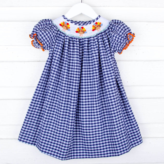 Turkey time is here! Get your little one ready to celebrate with our Sweet Turkey Navy Gingham Smocked Bishop Dress. This navy gingham dress is all set for the festive season, featuring playful bishop sleeves with cheerful orange ric-rac trim and adorable smocked turkeys. It’s the perfect choice to add some holiday cheer to your celebrations