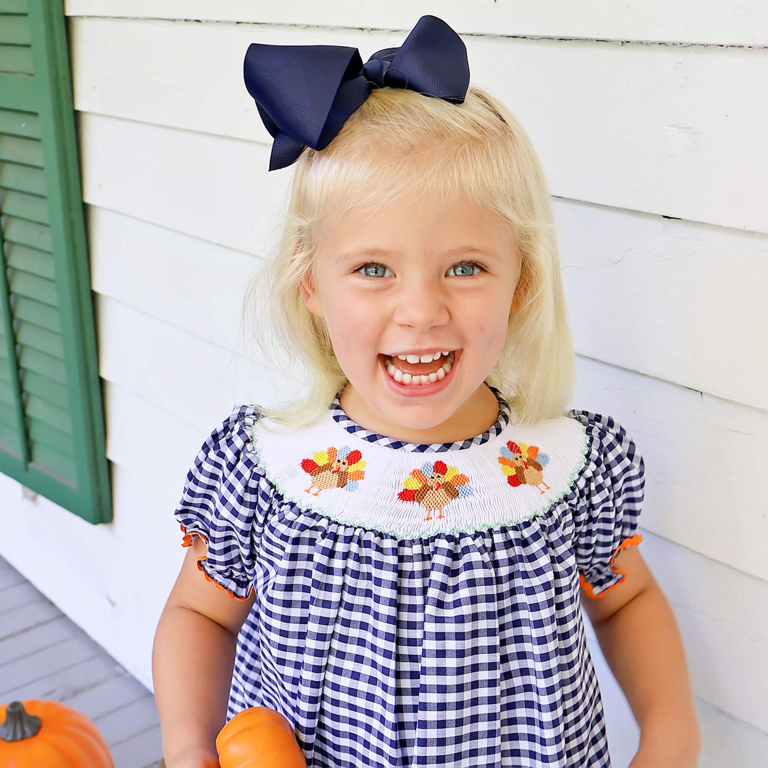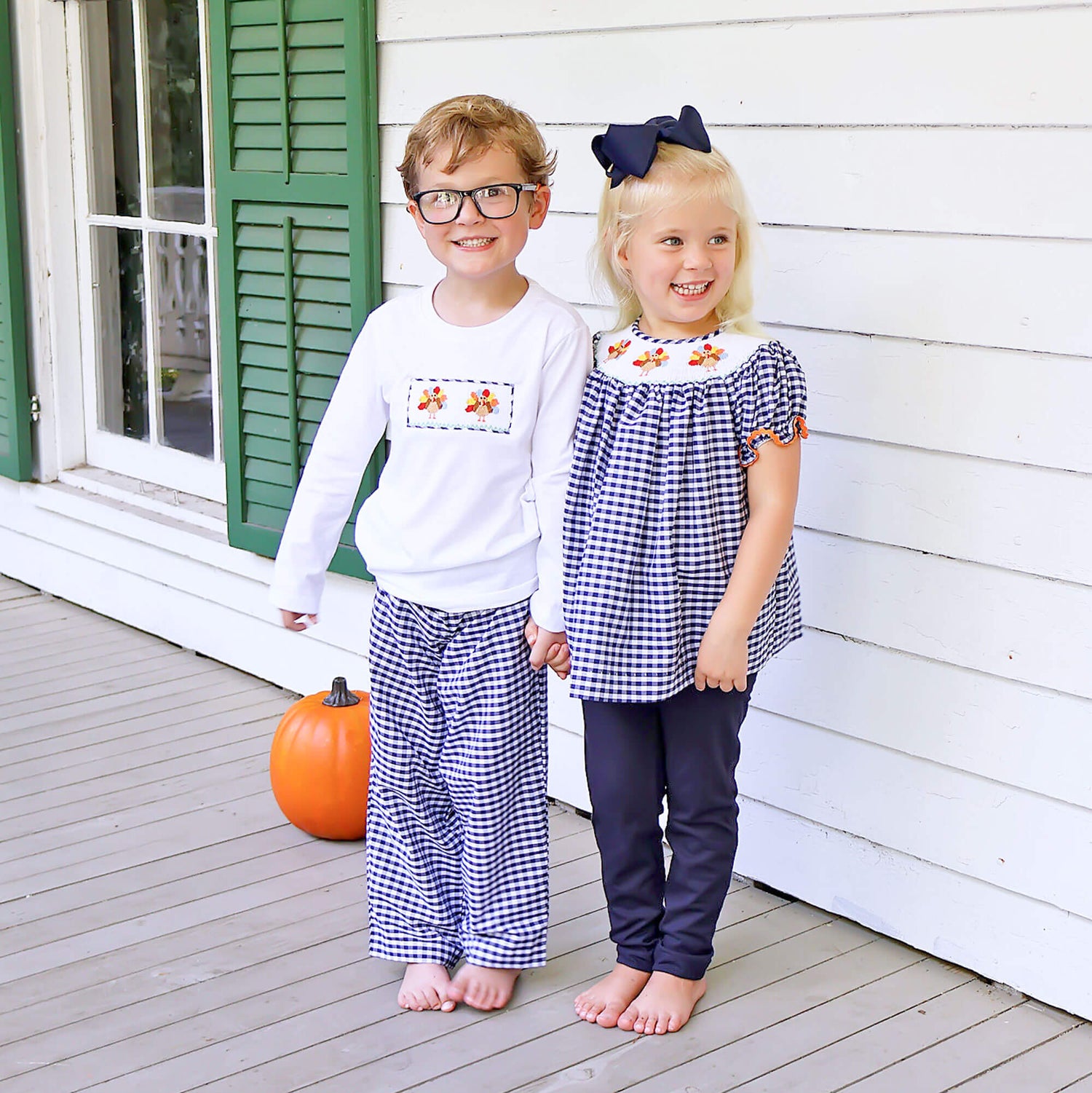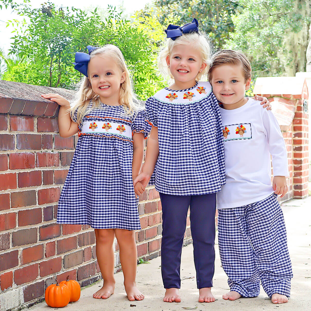 Turkey time is here! Get your little one ready to celebrate with our Sweet Turkey Navy Gingham Smocked Bishop Legging Set. This navy gingham top is perfect for the festive season, featuring playful bishop sleeves with cheerful orange ric-rac trim and adorable smocked turkeys. The set is coordinated with navy leggings, making it the ideal choice to add some holiday cheer to your celebrations!
