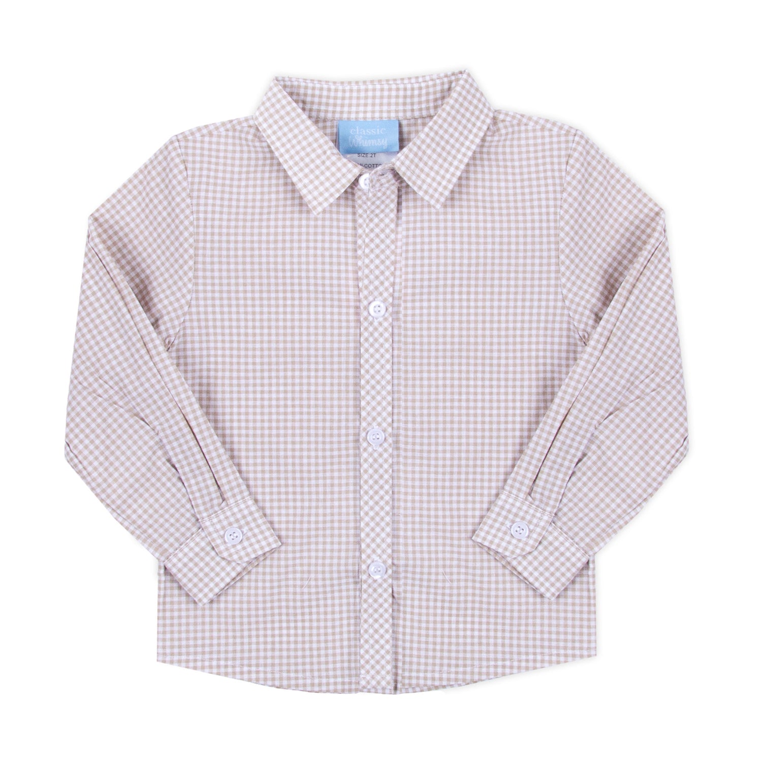 Elevate your little one's wardrobe with our Tan Gingham Button Down Shirt, the perfect addition for the season. This shirt is both stylish and versatile. Ideal for outings to the pumpkin patch, Thanksgiving gatherings, Christmas celebrations, or any special occasion, this shirt is sure to make your little one stand out. Personalize it with a monogram to make it even more special and unique!