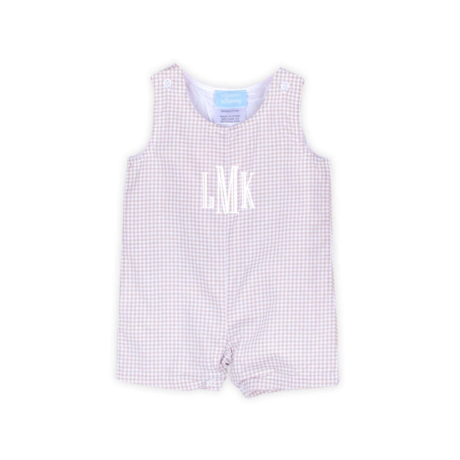 Elevate your little one's wardrobe with our Tan Gingham Jon Jon, the perfect addition for the season. This jon jon is both stylish and versatile. It features convenient shoulder buttons and snaps in stride for easy changes. Ideal for outings to the pumpkin patch, Thanksgiving gatherings, beach portraits or any special occasion, this outfit is sure to make your little one stand out. Personalize it with a monogram to make it even more special and unique!