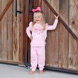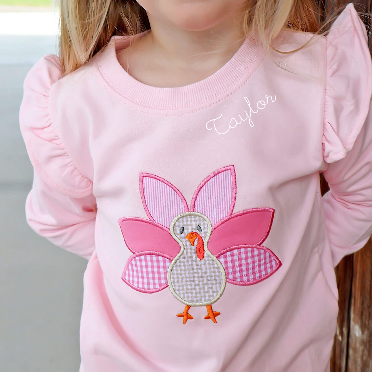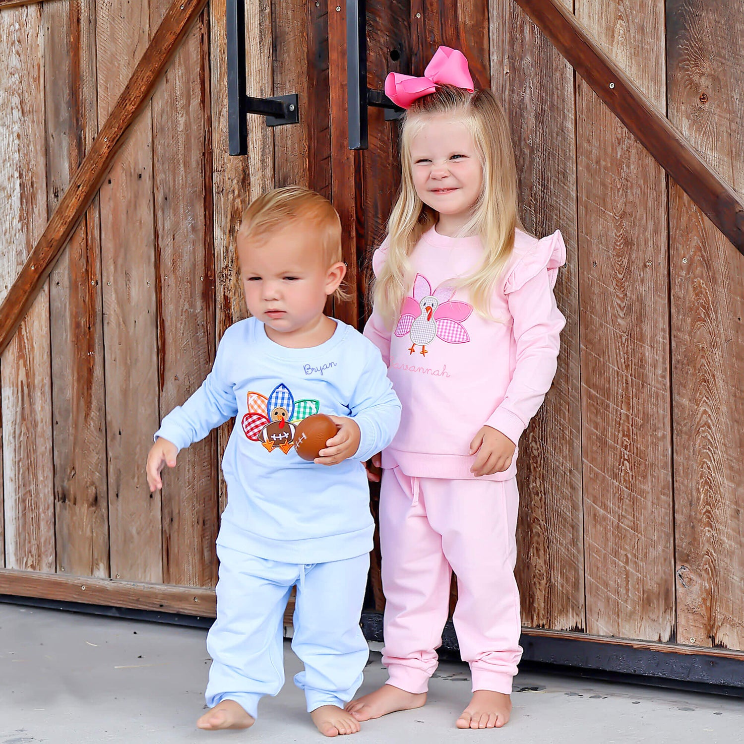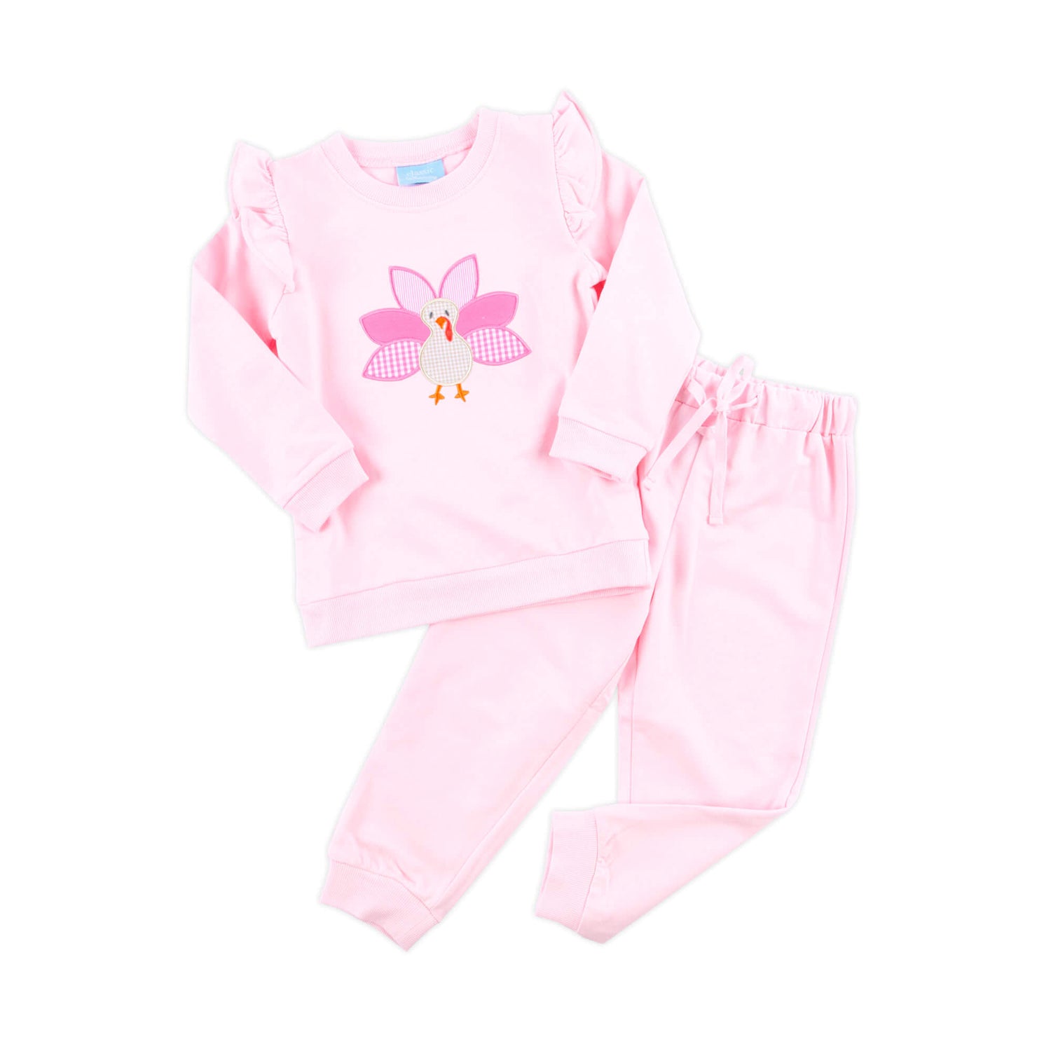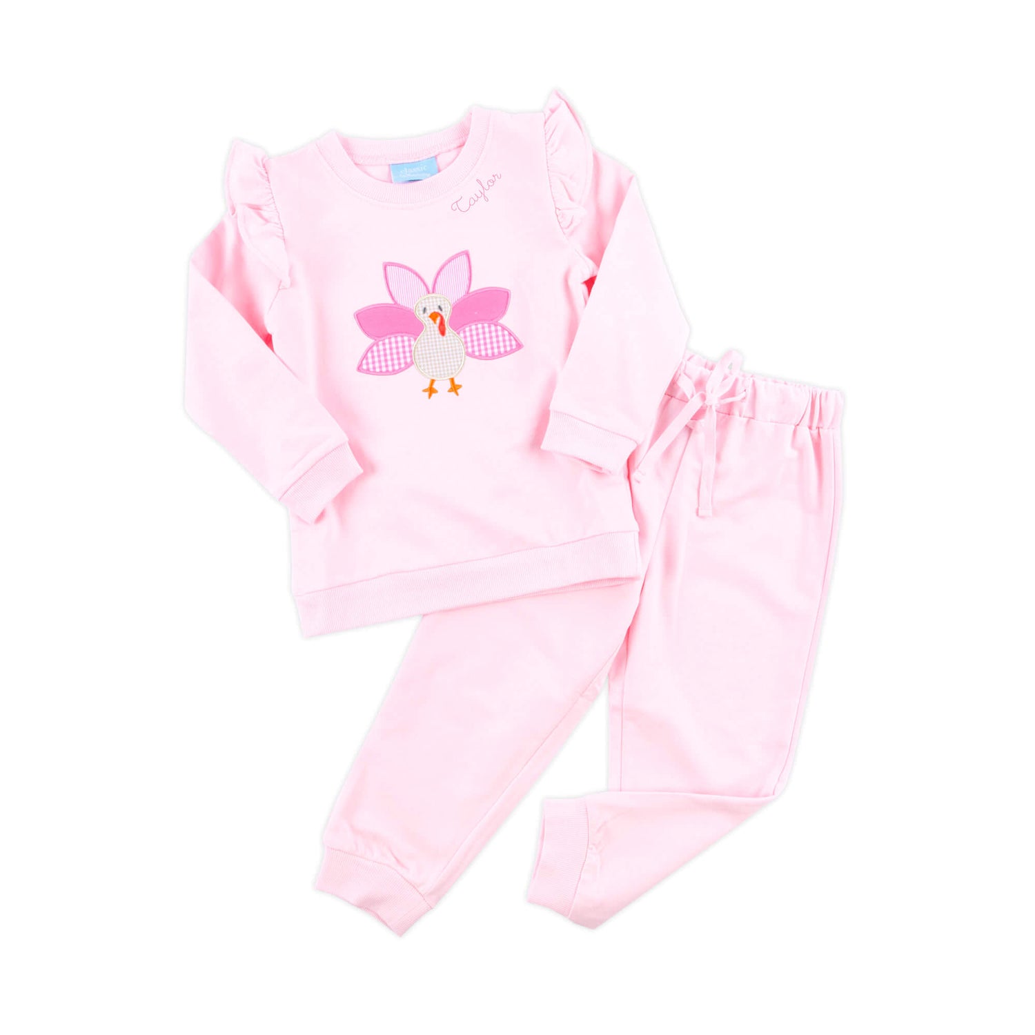 Let your little one enjoy the fall weather in our adorable Turkey Applique Pink Ruffle Jogger Set! It’s perfect for cooler days. The pink French terry sweatshirt features a cute pink turkey applique and ruffle details. Paired with easy pull-on string waistband joggers. Add a monogram for a special touch and make it uniquely theirs!