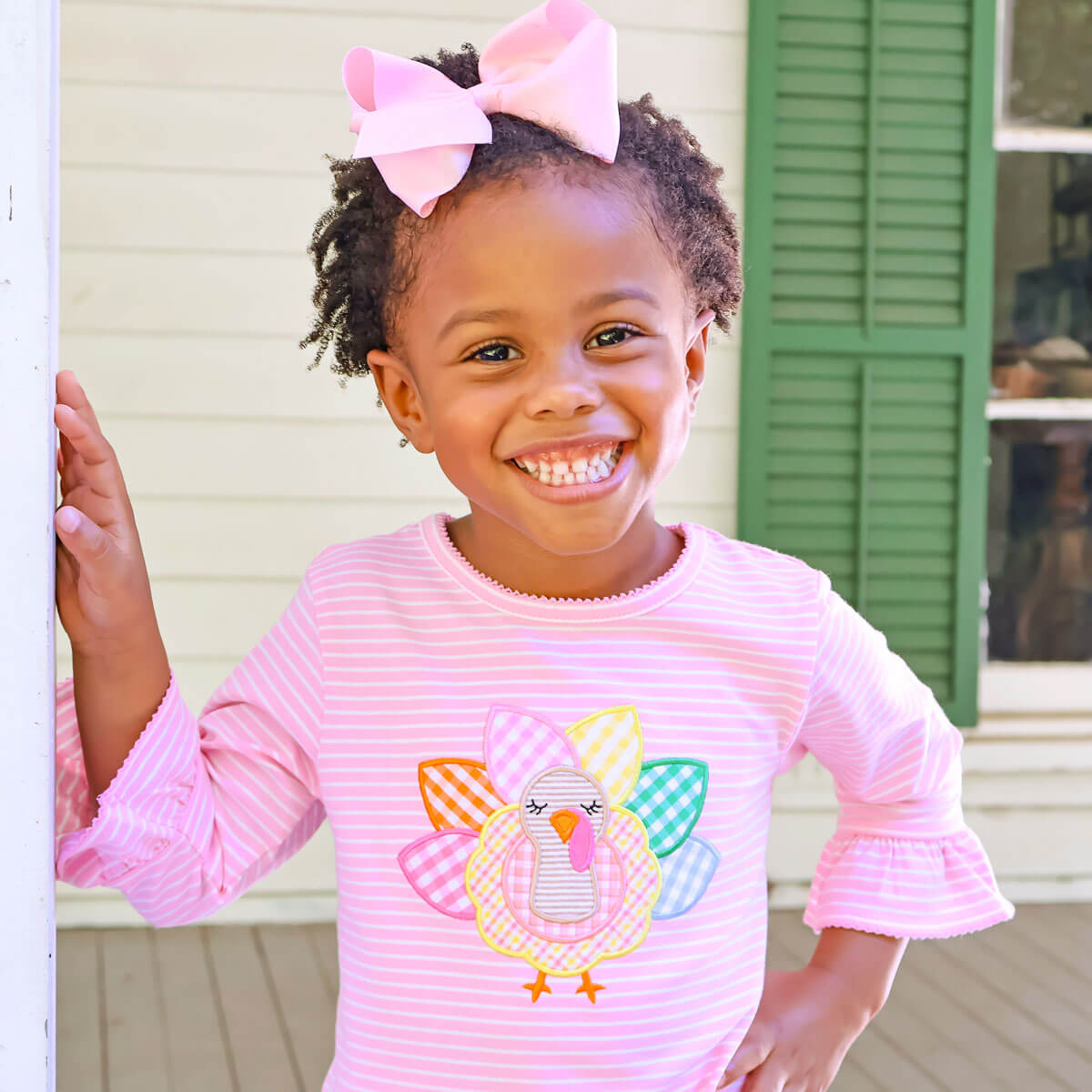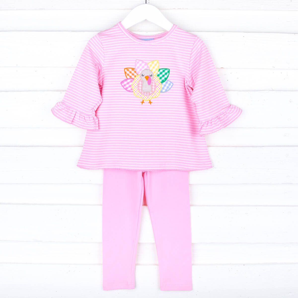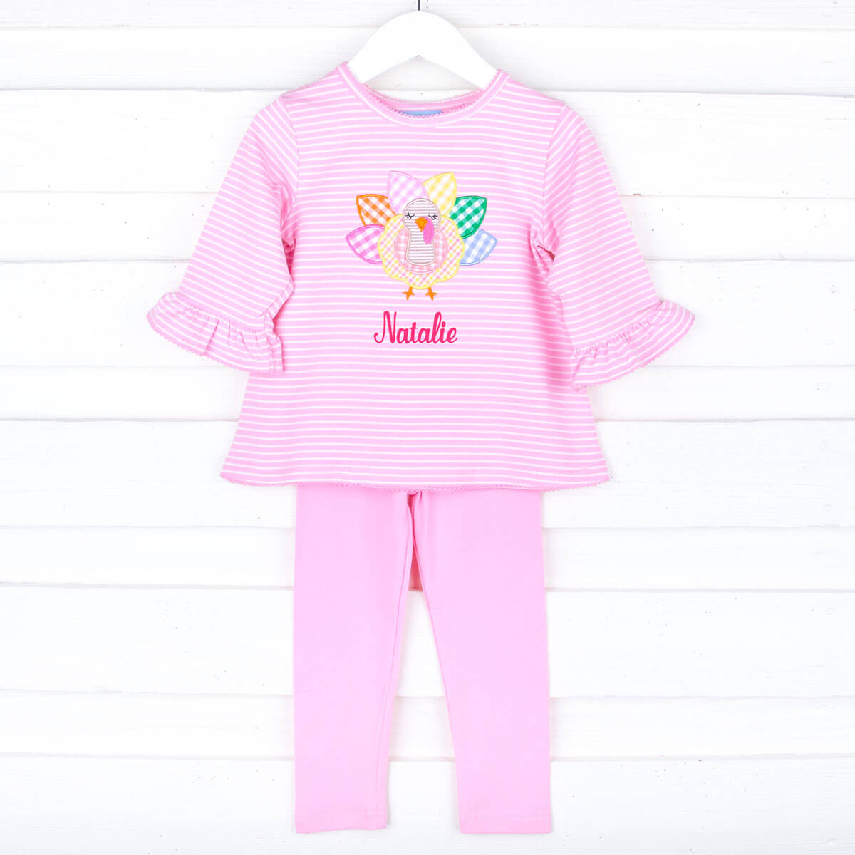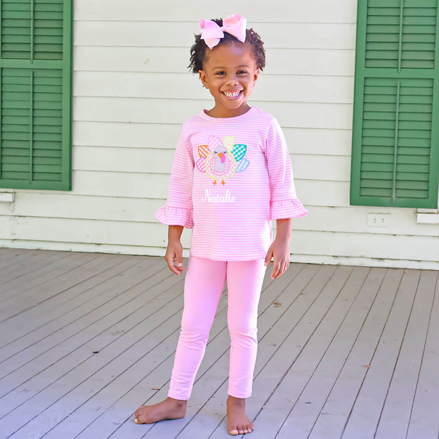 Make Thanksgiving fun with our Turkey Applique Pink Stripe Milly Legging Set! This adorable outfit is perfect for family gatherings, school, and playtime. The striped Milly-style top features a cute turkey applique, 3/4 sleeves, and playful ruffle details with pink picot trim. Paired with pink leggings, this set is both comfortable and charming for your little one. Add a monogram for an extra special touch!