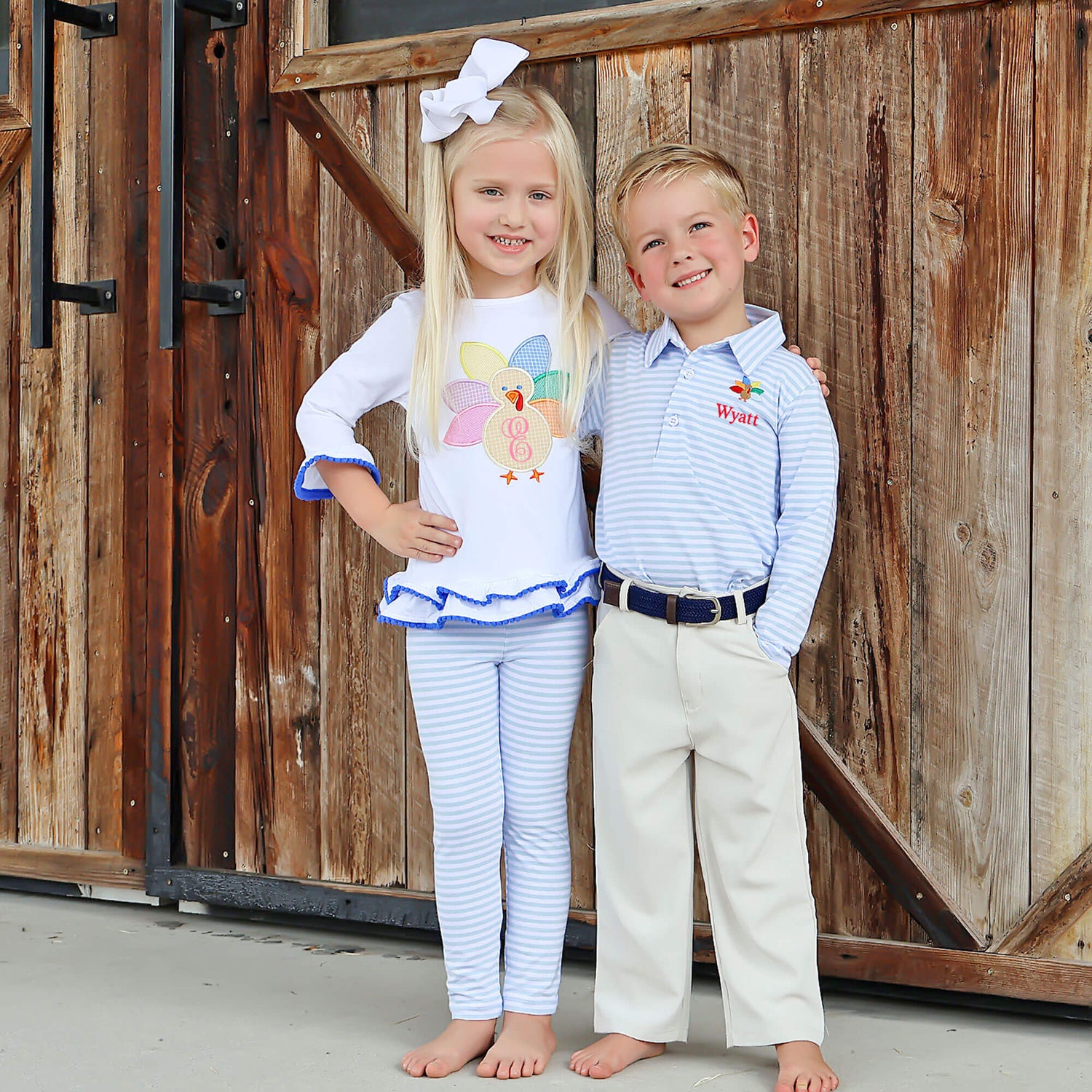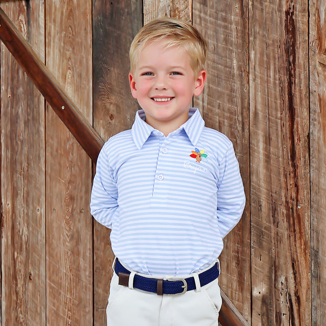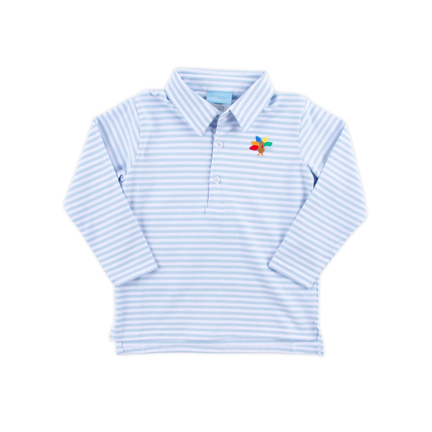 This Turkey Embroidered French Blue Stripe Polo is perfect for making Thanksgiving even more fun! The long-sleeve polo features an embroidered turkey on the side. Add a name monogram for a personalized touch!