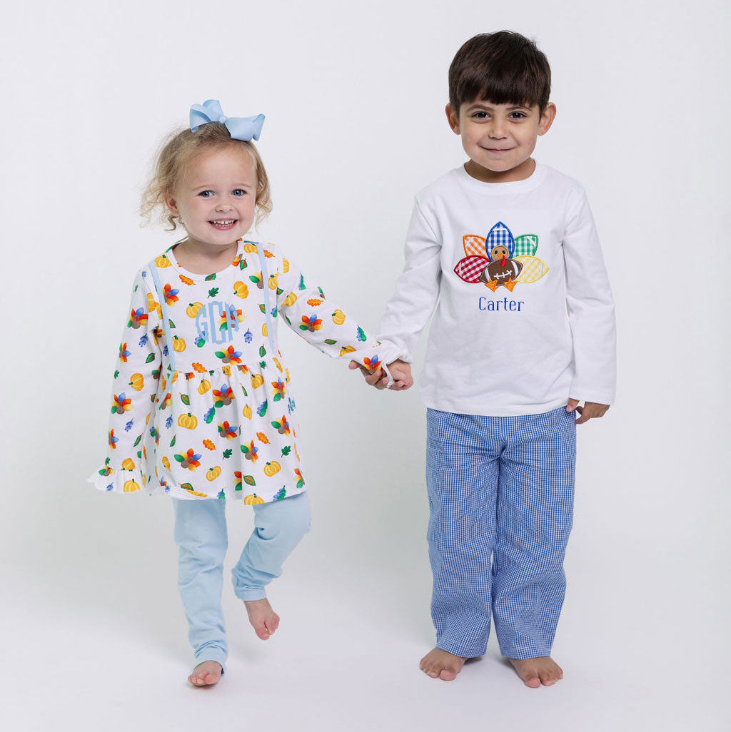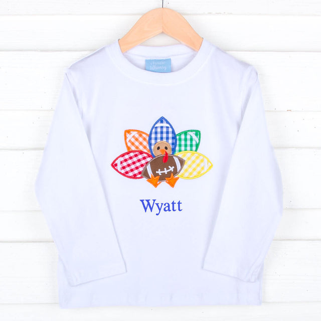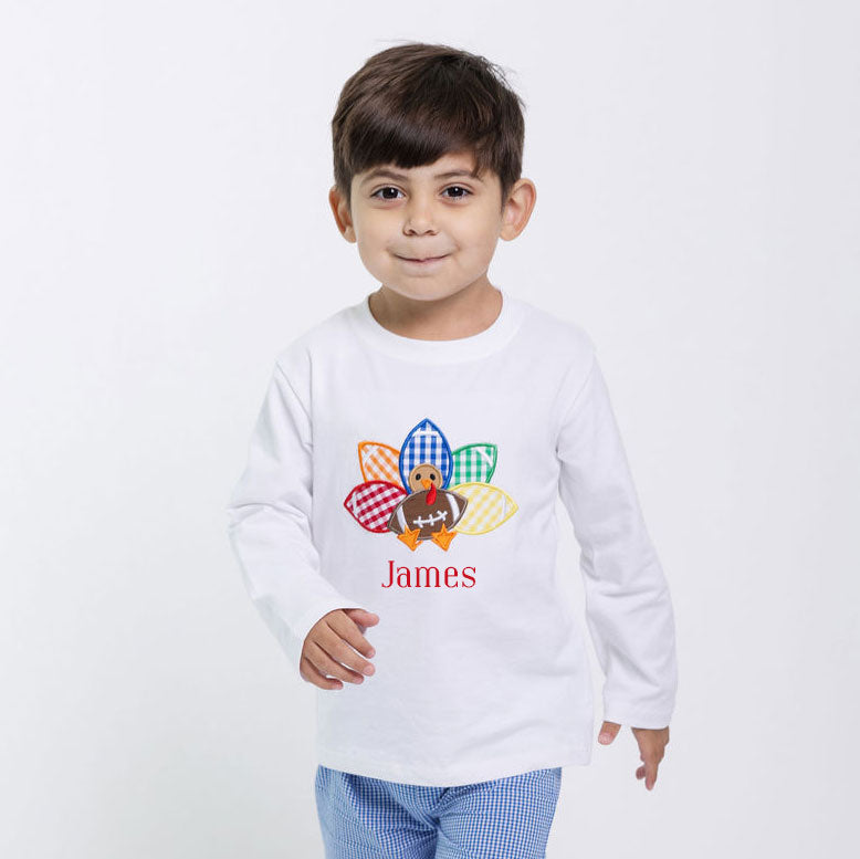 Celebrate Thanksgiving and football season with our Turkey Football White Long Sleeve Shirt! This white shirt features an adorable football turkey applique, perfect for playtime, comfort, and watching football games. Add a name monogram below the applique for an extra special touch.