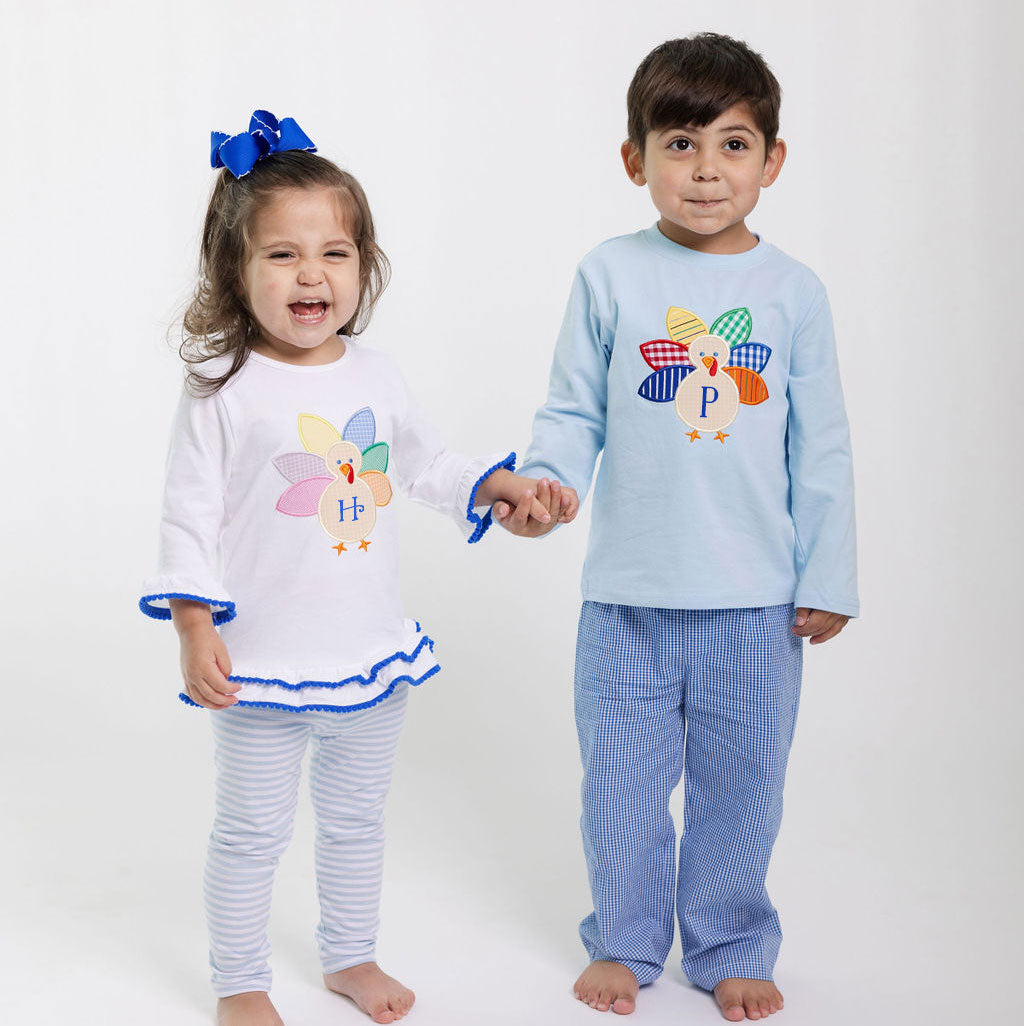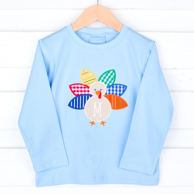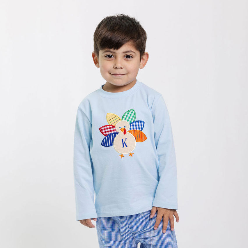 Get your little one ready for Thanksgiving with this adorable Turkey Light Blue Long Sleeve Shirt! The cute applique of a turkey makes it perfect for both playtime and school. The long sleeves are just right for cooler weather. Add a name monogram for a personalized touch that makes it extra special.