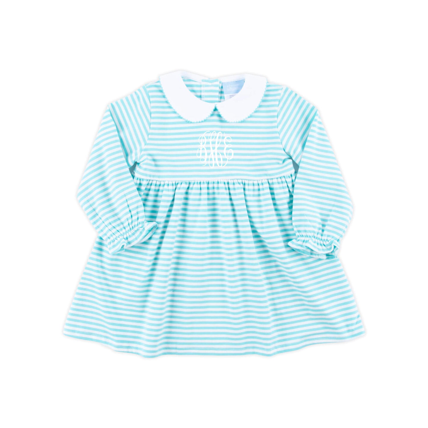 Your little girl will adore wearing the Turquoise Stripe Riley Dress! The darling turquoise stripe knit dress features long bishop sleeves and a sweet white collar with turquoise picot trim. Make it even more special by adding a monogram to personalize this delightful outfit.