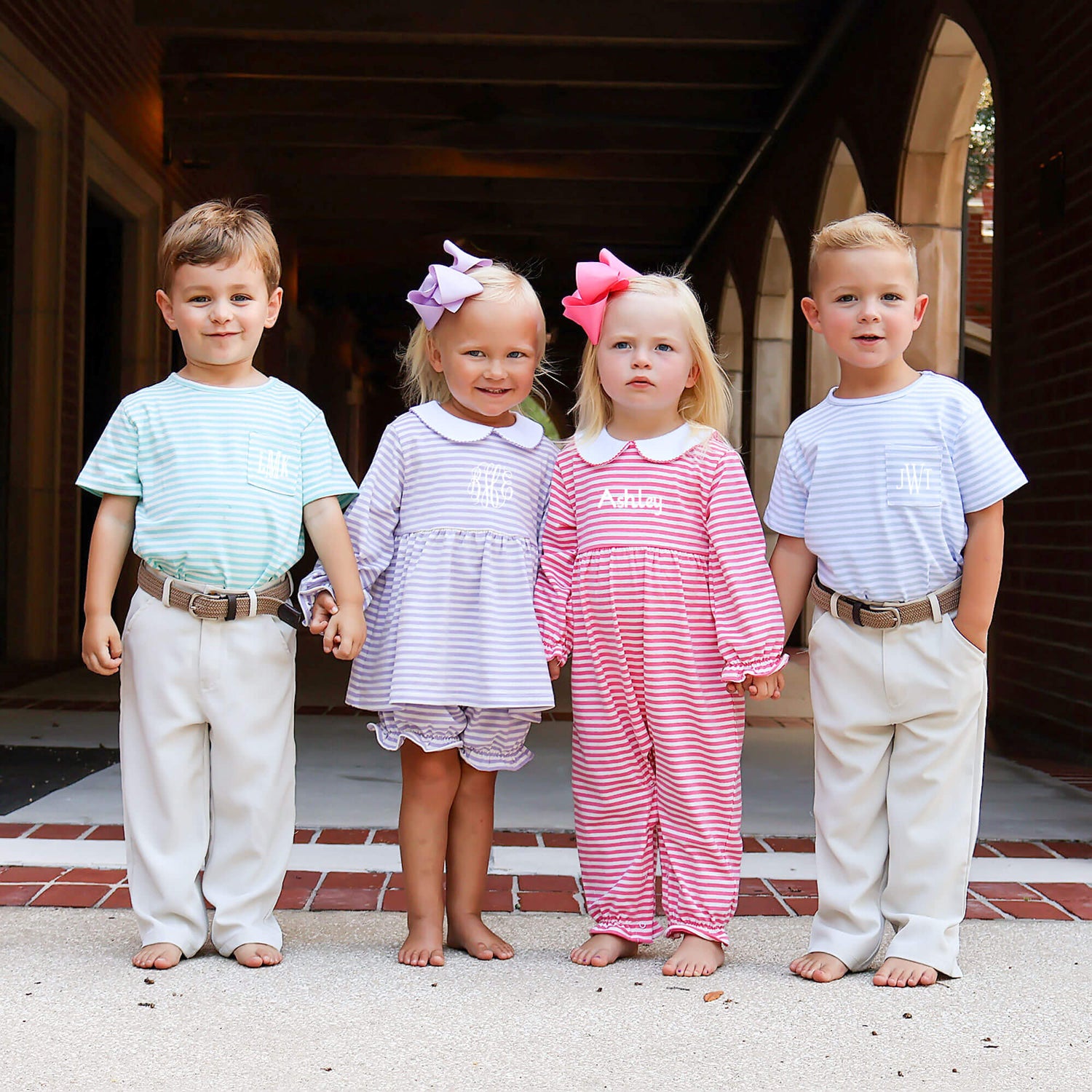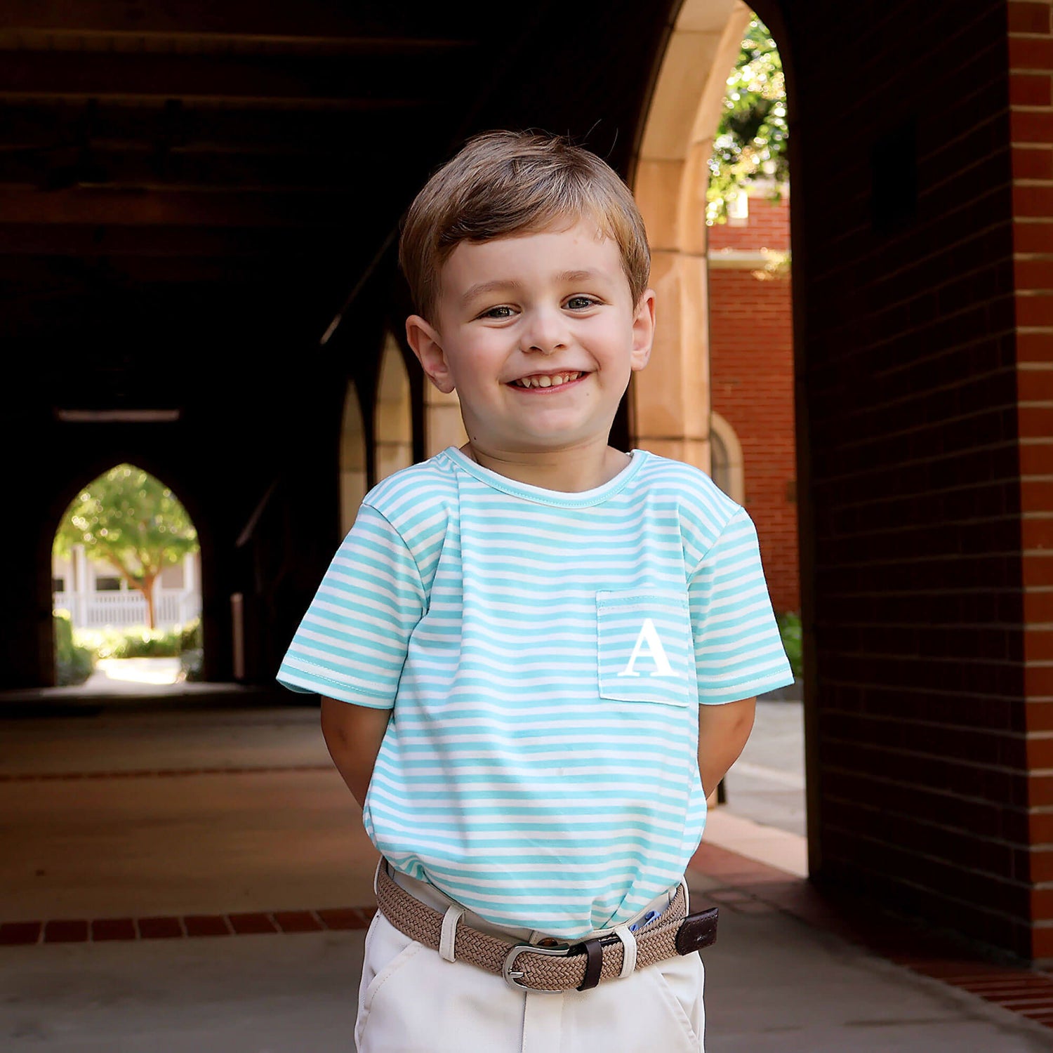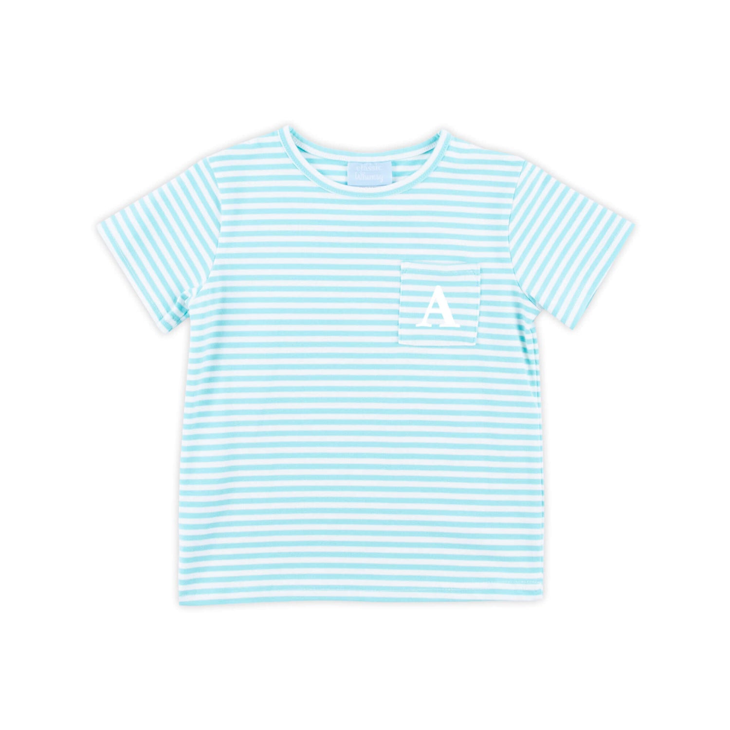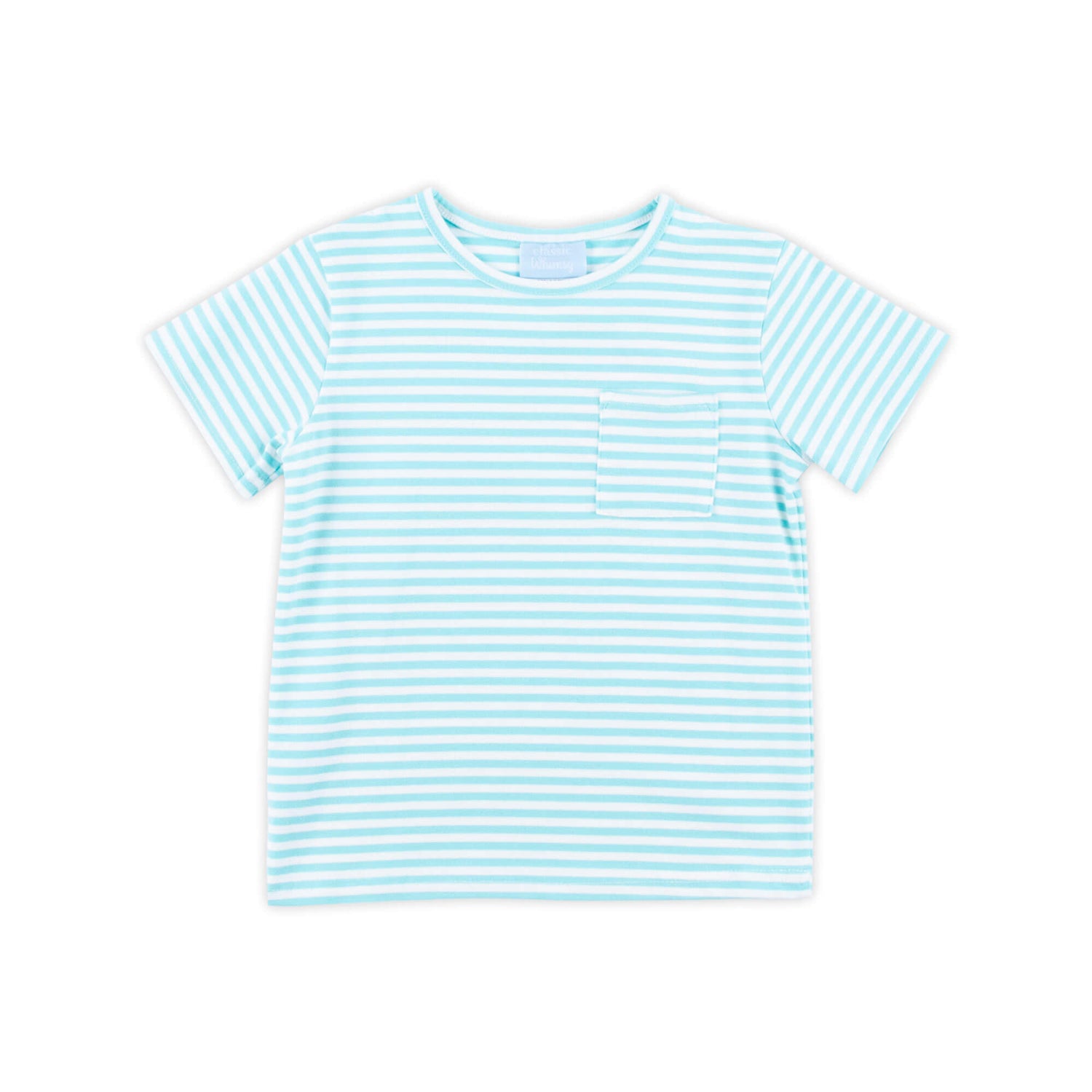 Dress up for playtime in our Turquoise Thick Stripe Short Sleeve Pocket Shirt. This classic knit stripe shirt features timeless style and includes a convenient side pocket, allowing you to mix and match effortlessly with your favorite bottoms. Personalize this shirt with a monogram.
