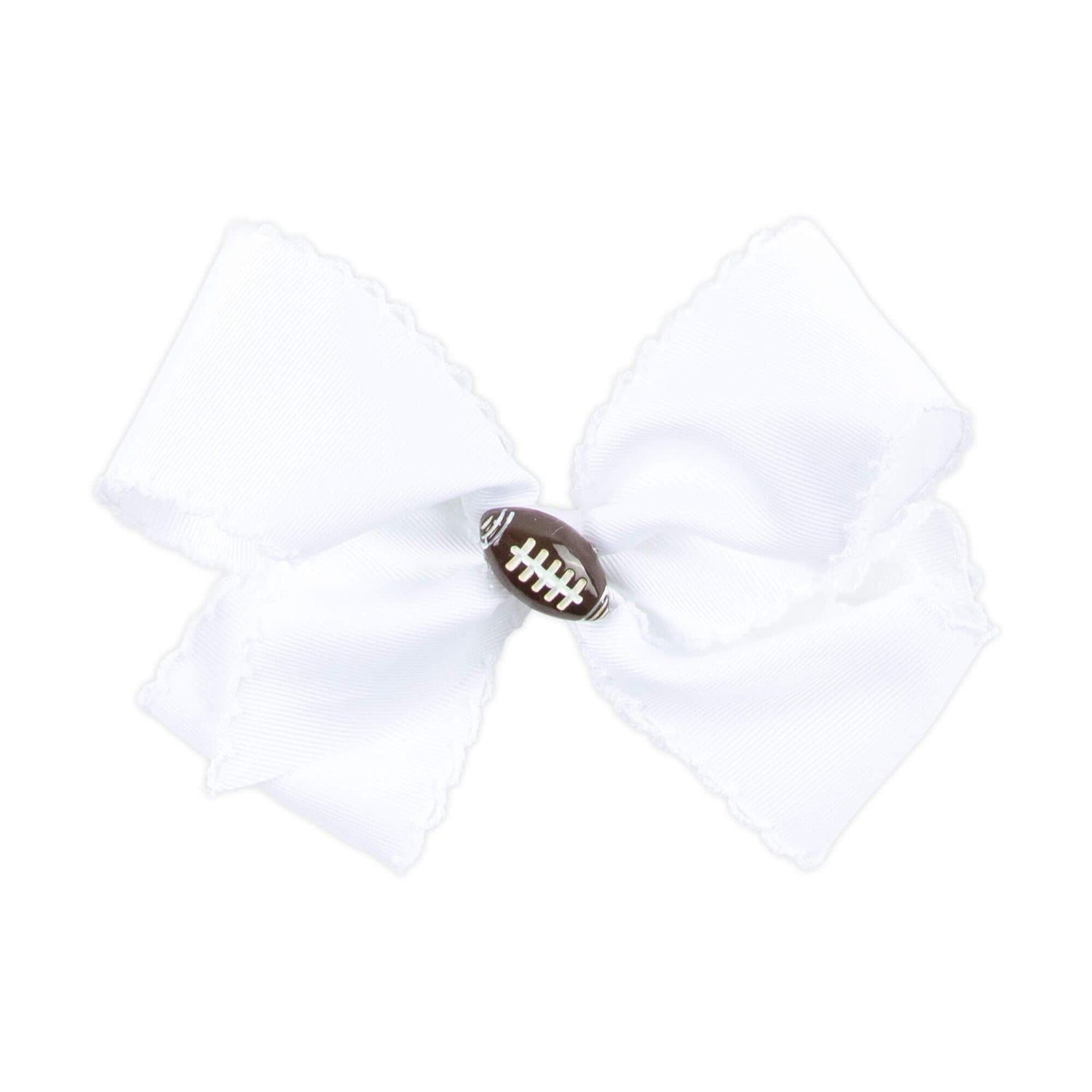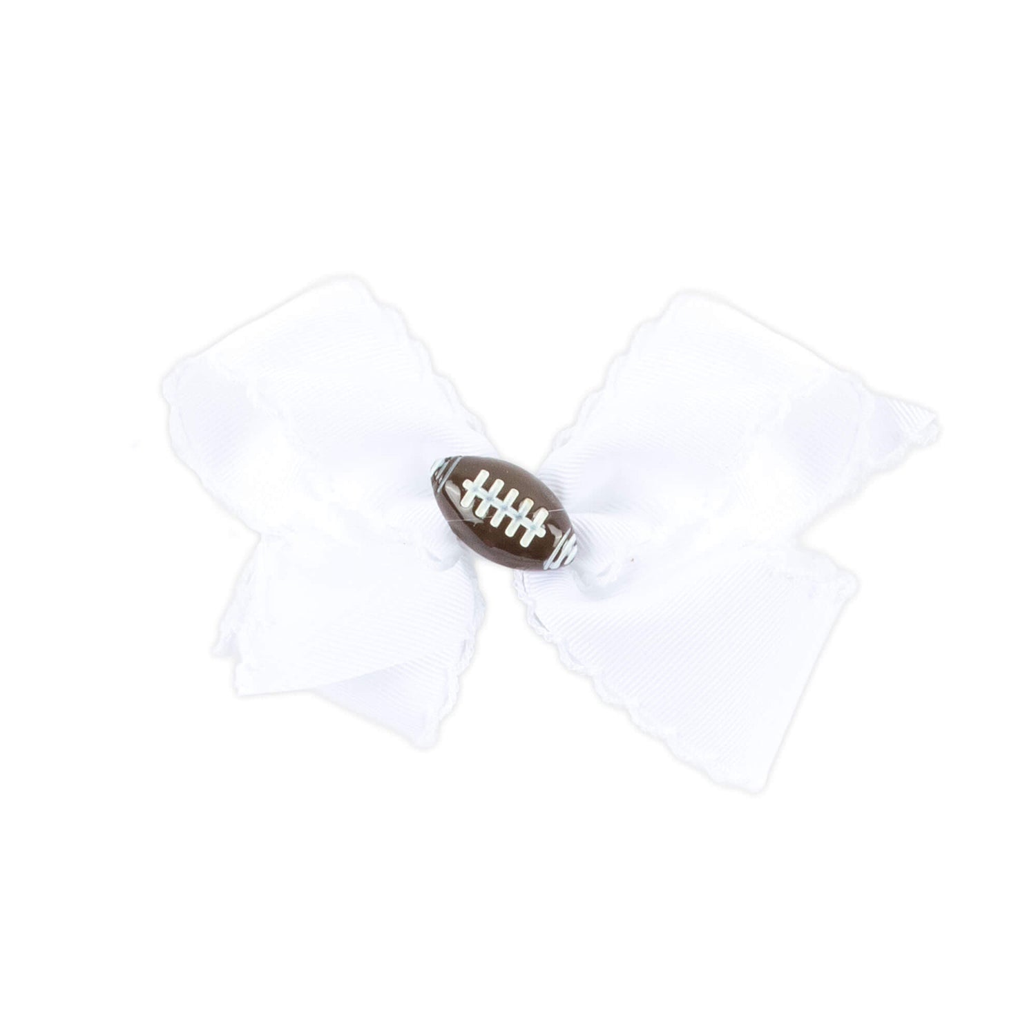 Complete your favorite team look with this fun Football Charm Moonstitch Hair Bow! You'll be ready for a season of fun. Not only does it feature a beautiful moonstitch edge, but it also has a football charm, adding a sweet touch to your team outfit.