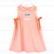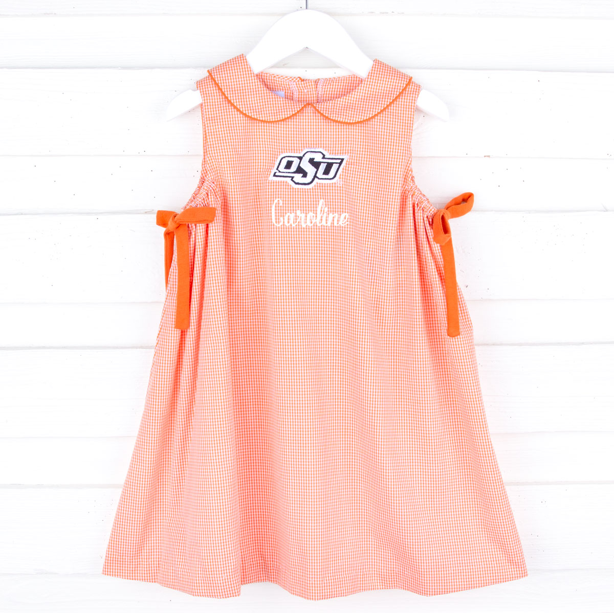 Go team! Show your spirit for OSU with our Oklahoma State Embroidered Orange Dress. This sleeveless gingham dress features a charming peter-pan collar, and sweet orange side-tie bows, all complemented by the embroidered OSU logo. Whether you're cheering from the sidelines or watching the game at home, this is the perfect outfit to support your team in style! Add a name monogram!